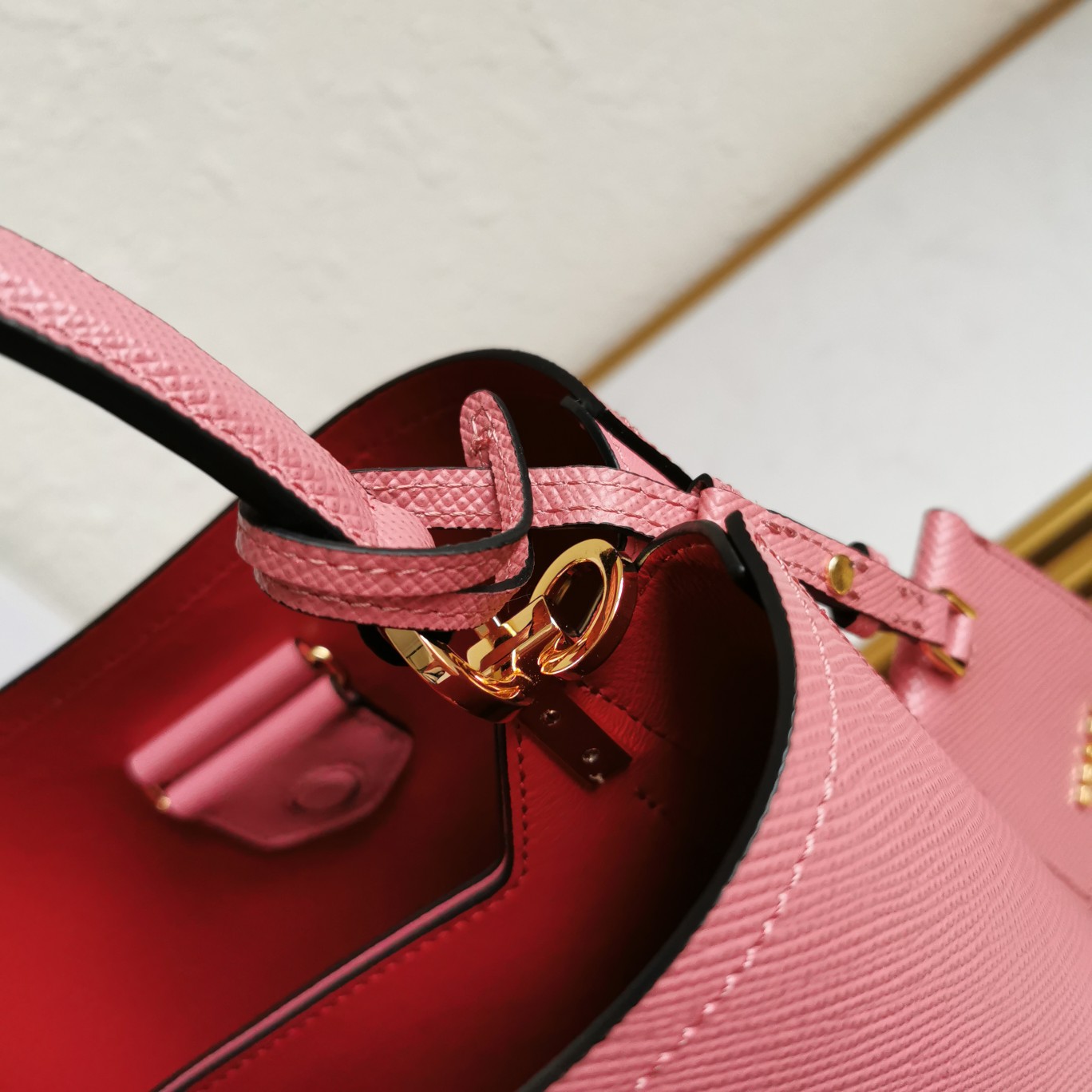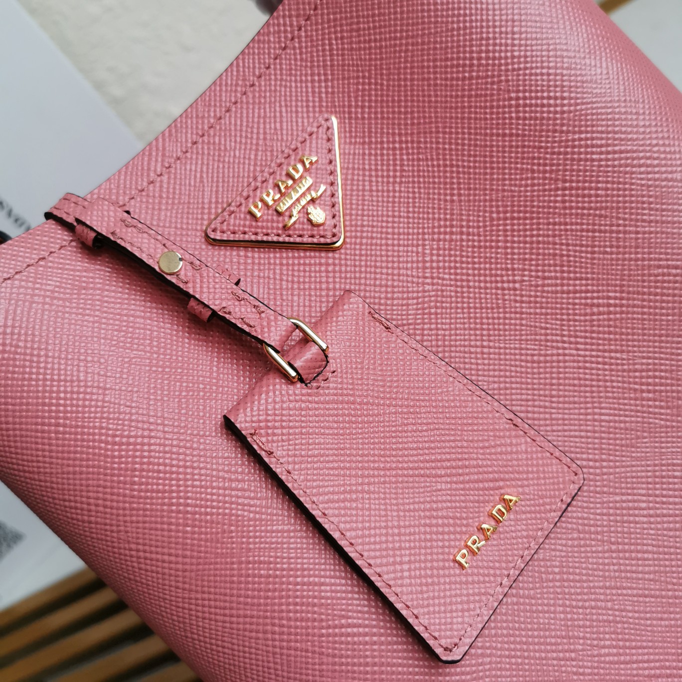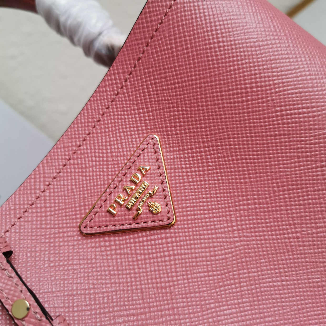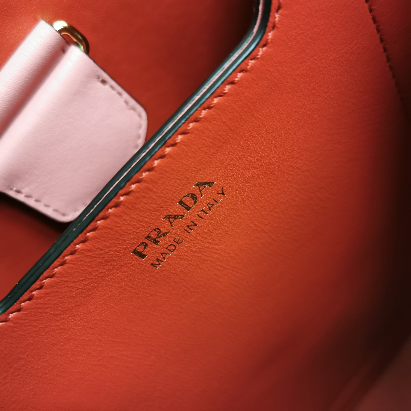 Original item, made with imported Saffiano leather material. The detachable shoulder strap, leather nameplate, and metal logo complement each other. The central pocket with leather-wrapped magnetic closure features a contrasting soft lambskin lining with a Saffiano leather triangle logo. This Double handbag style is elegant, eye-catching, and unique.
