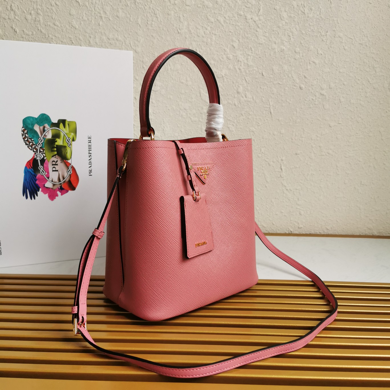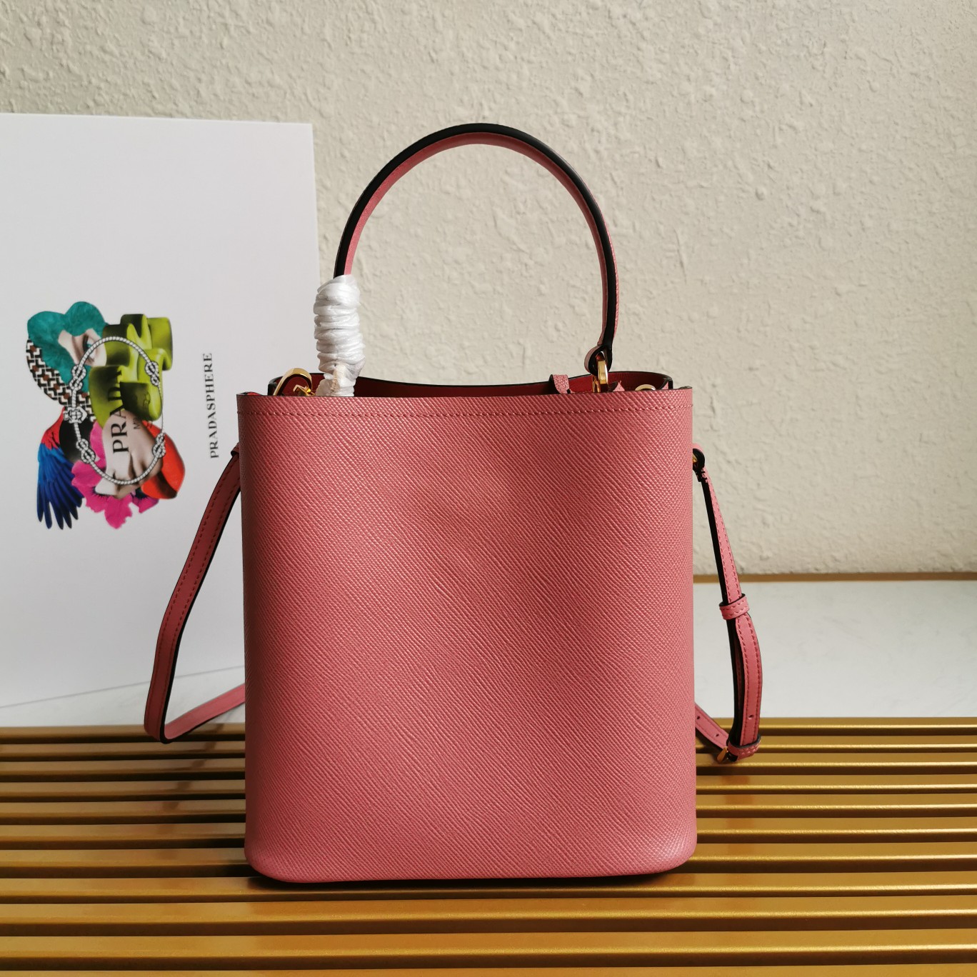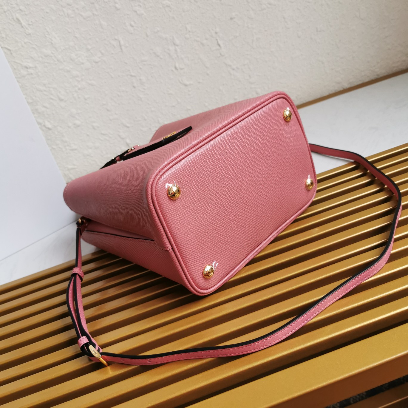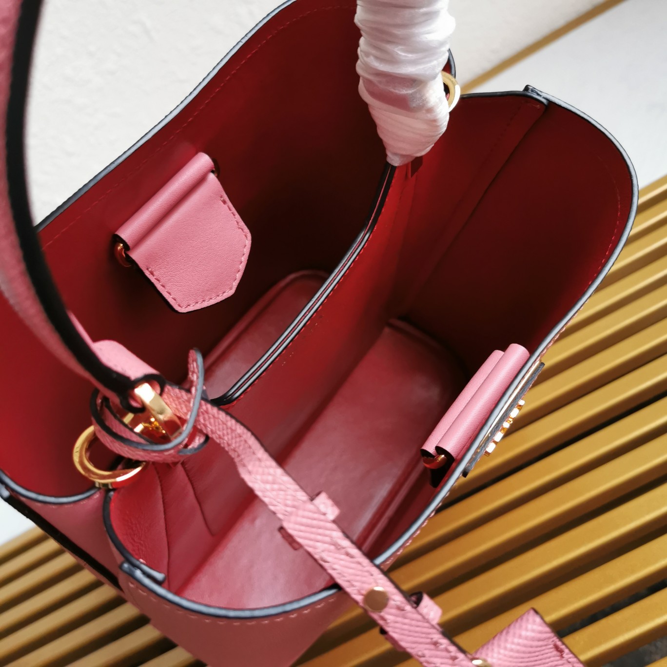 Original item, made with imported Saffiano leather material. The detachable shoulder strap, leather nameplate, and metal logo complement each other. The central pocket with leather-wrapped magnetic closure features a contrasting soft lambskin lining with a Saffiano leather triangle logo. This Double handbag style is elegant, eye-catching, and unique.