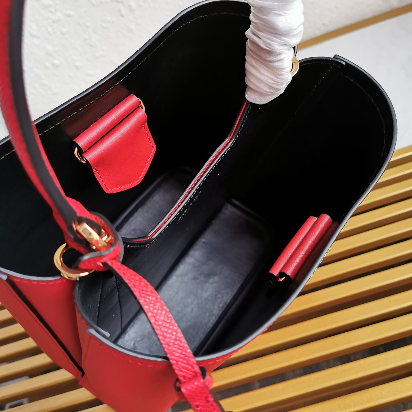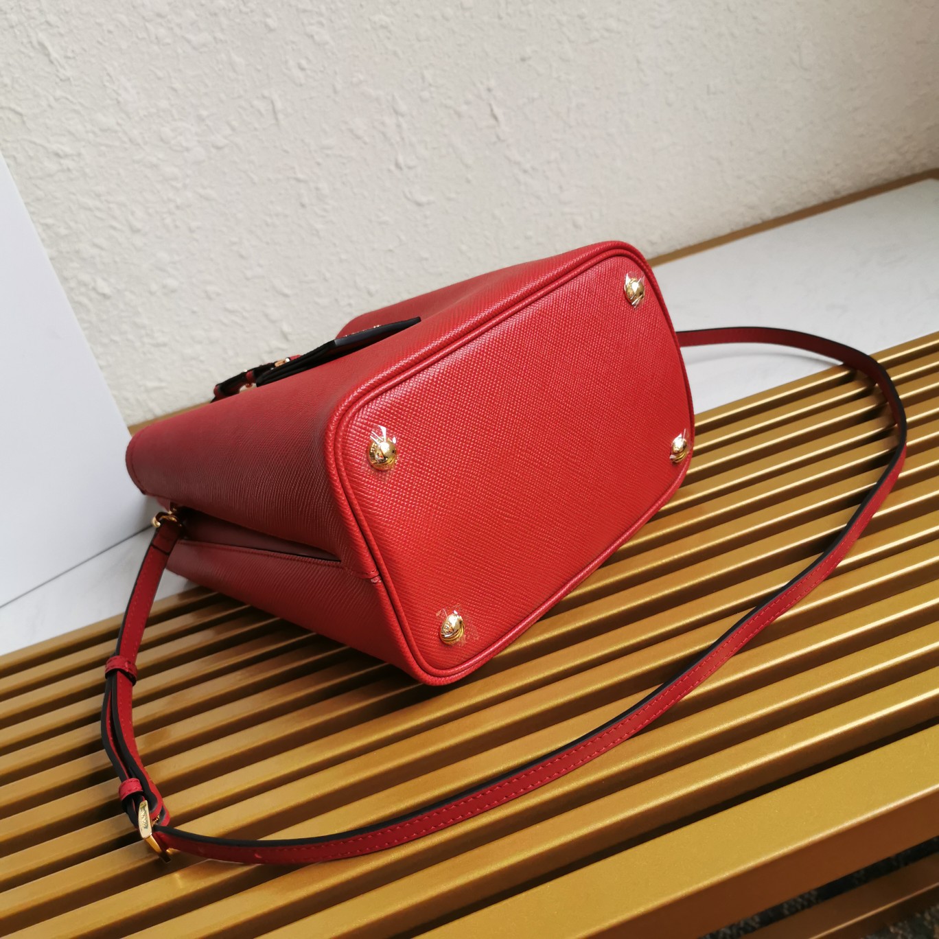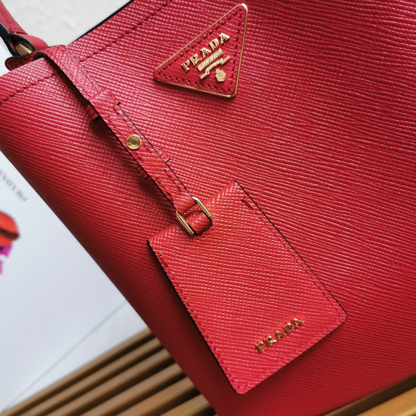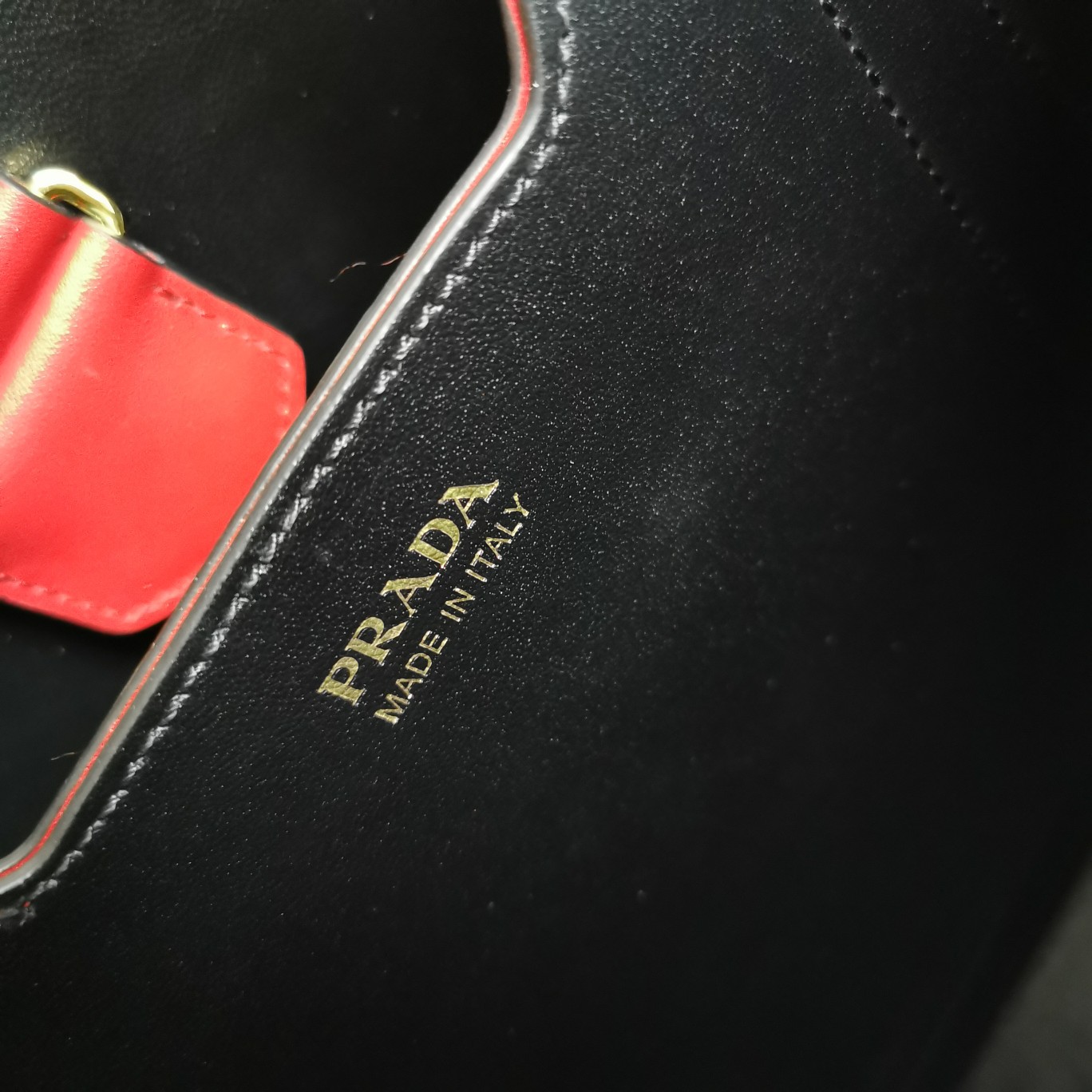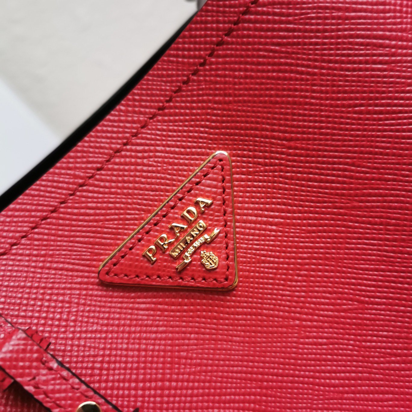 Original item, made with imported Saffiano leather material. The detachable shoulder strap, leather nameplate, and metal logo complement each other. The central pocket with leather-wrapped magnetic closure features a contrasting soft lambskin lining with a Saffiano leather triangle logo. This Double handbag style is elegant, eye-catching, and unique.