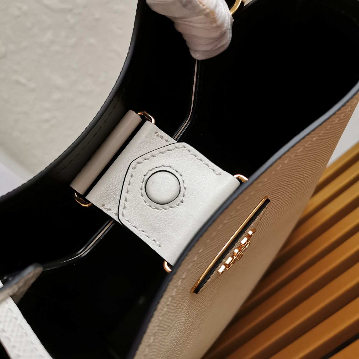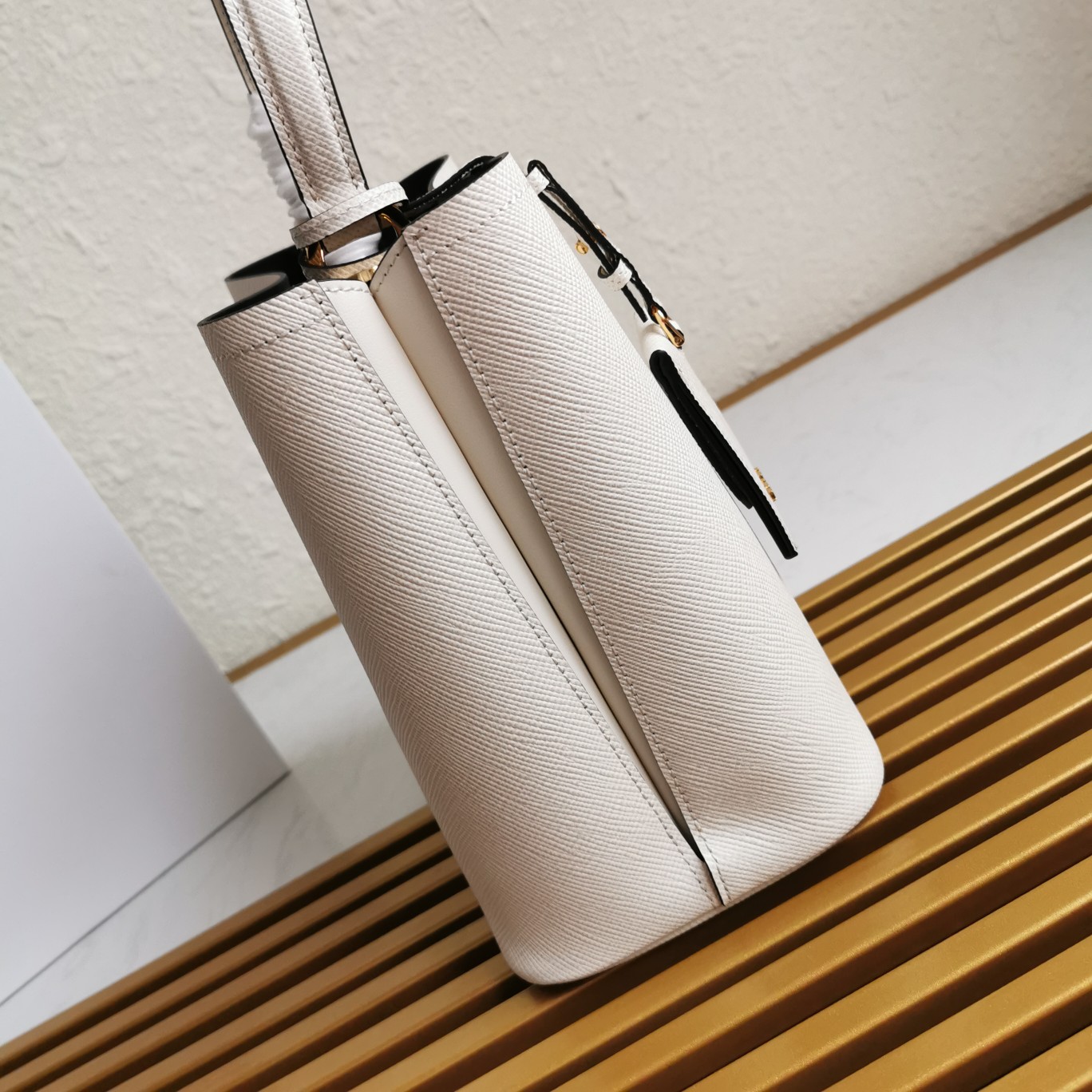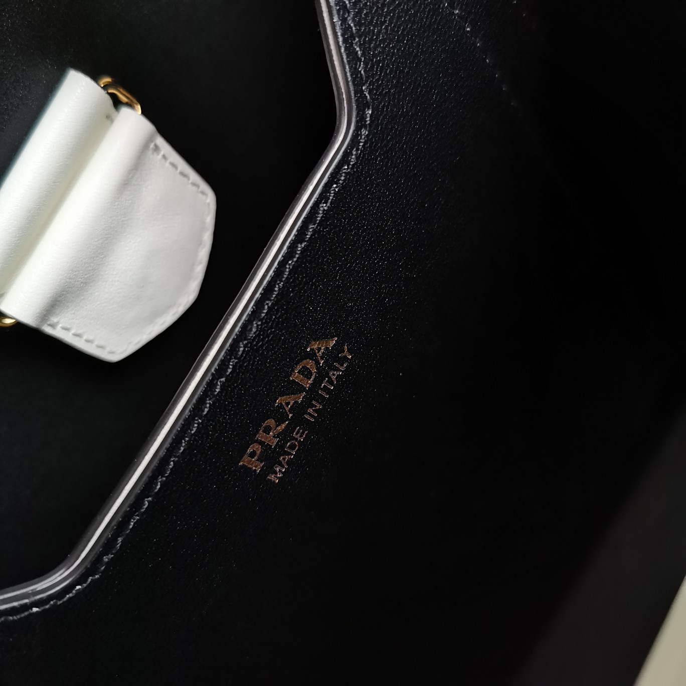 Original item, made with imported Saffiano leather material. The detachable shoulder strap, leather nameplate, and metal logo complement each other. The central pocket with leather-wrapped magnetic closure features a contrasting soft lambskin lining with a Saffiano leather triangle logo. This Double handbag style is elegant, eye-catching, and unique.