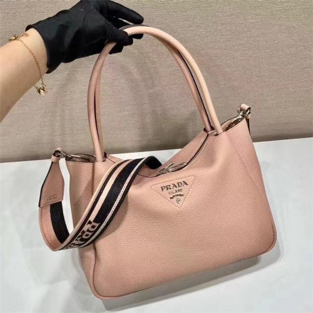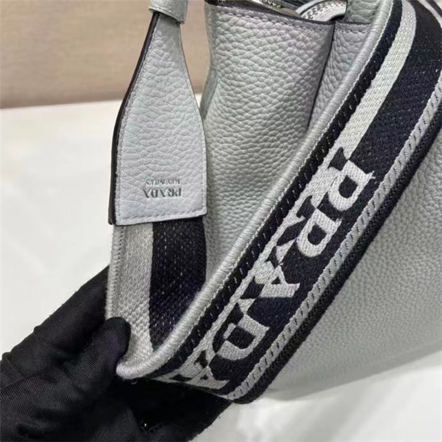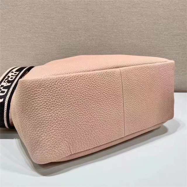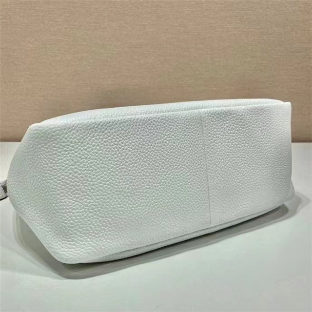 The reverse stitching emphasizes the soft, rounded silhouette of this handbag with a versatile detachable woven tape shoulder strap featuring the logo embroidered in a contrasting color. The accessory is decorated with the new interpretation of the triangle formed by stitching with the Prada metal lettering logo gleaming at its center.