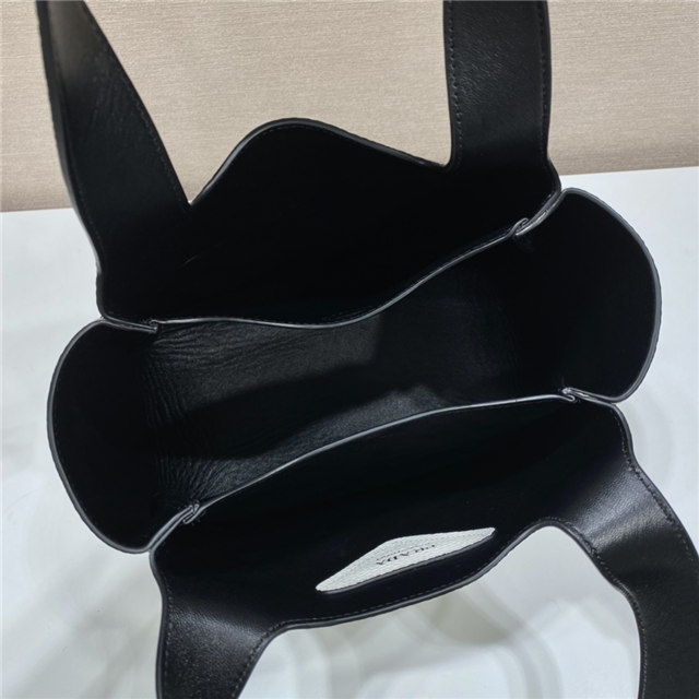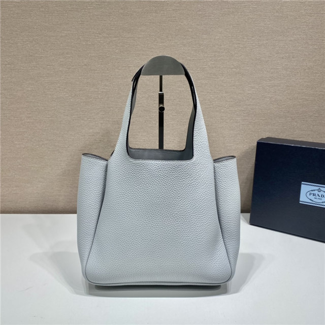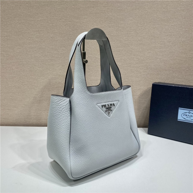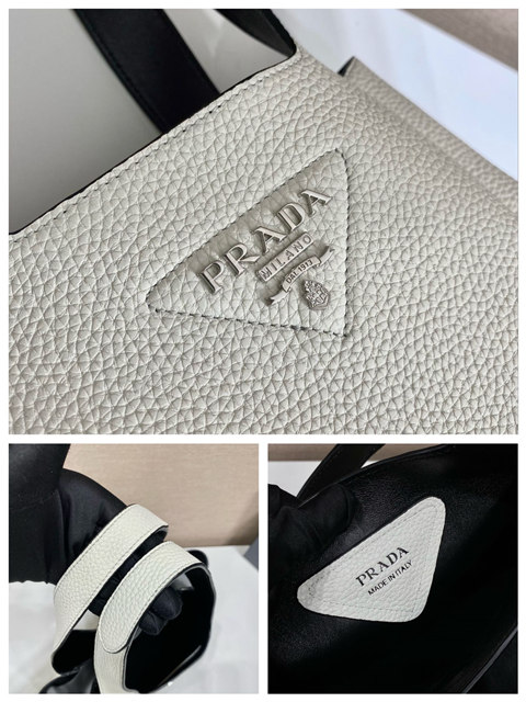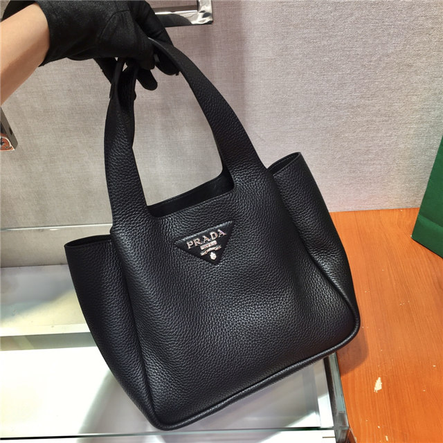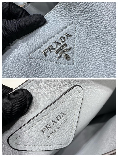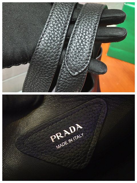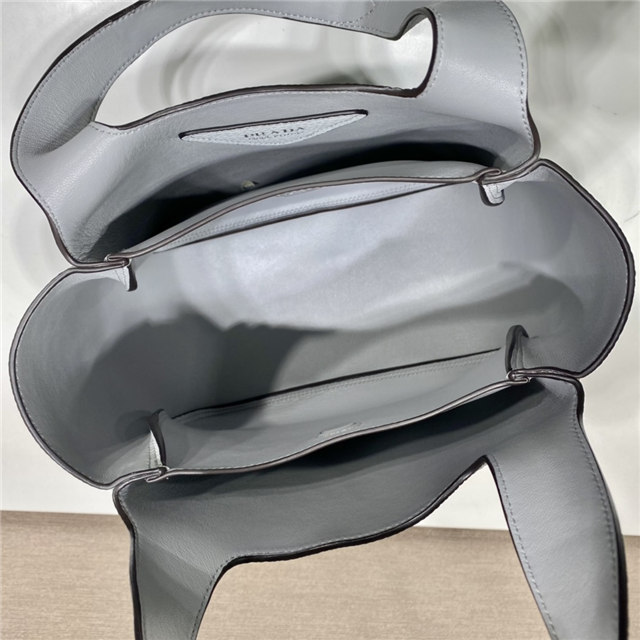 This soft leather tote introduced for the Fall Winter 2020 collection presents a new interpretation of the triangle logo, traced by stitching with the Prada metal lettering logo illuminating its center. The reverse stitching emphasizes the soft, rounded silhouette that comes with a double leather handle and magnetic button closure. The nappa interior has three compartments.