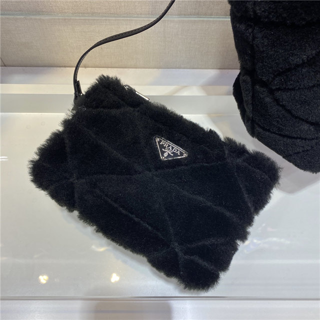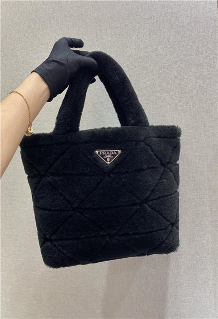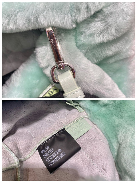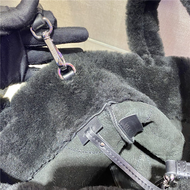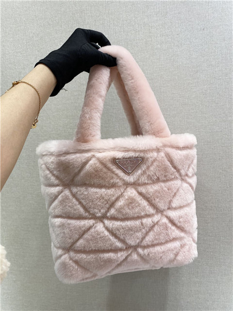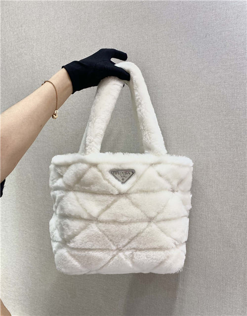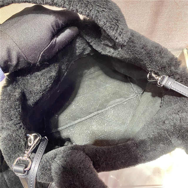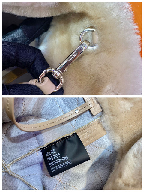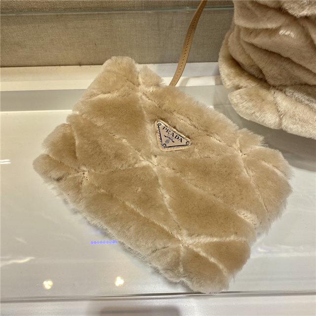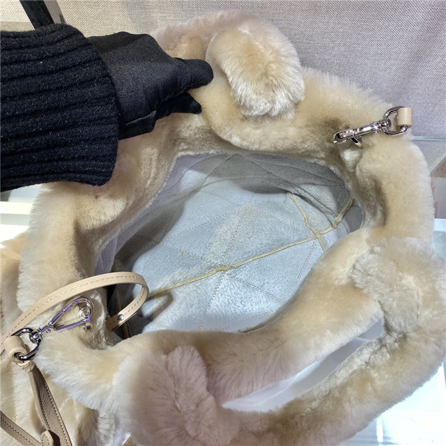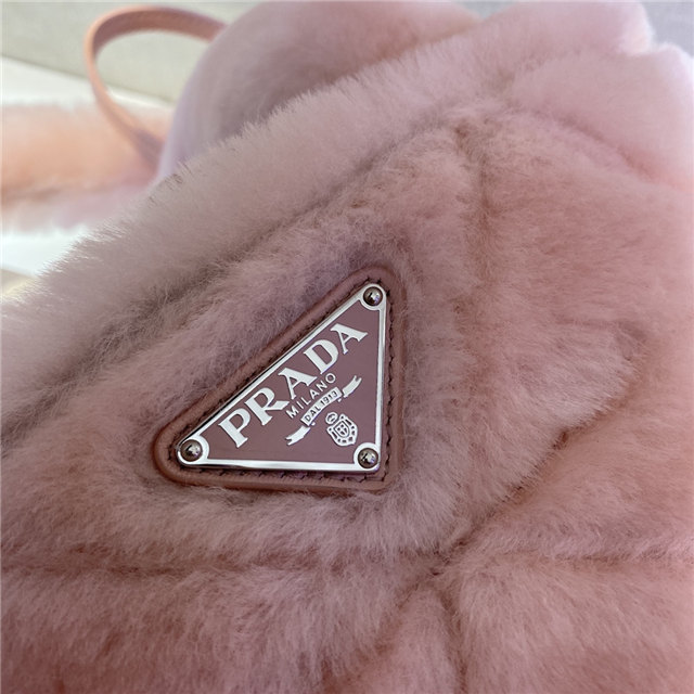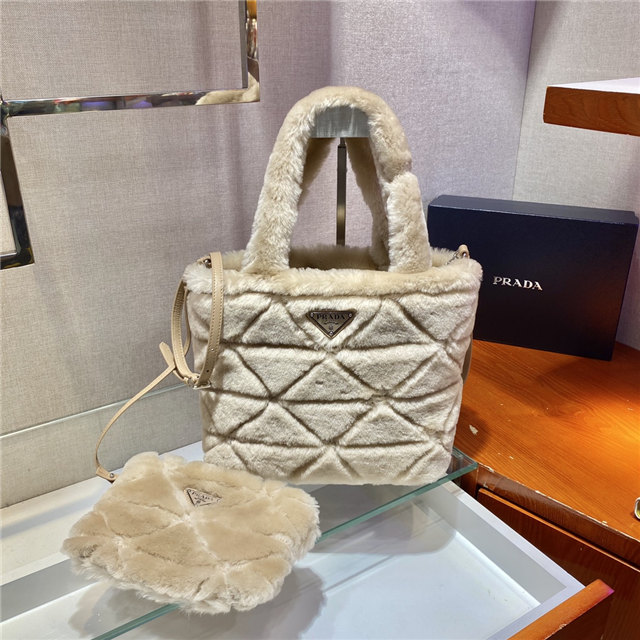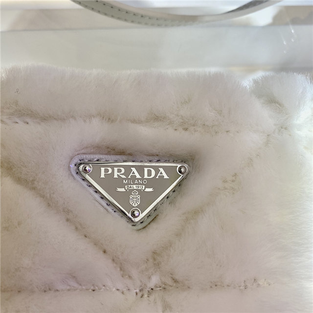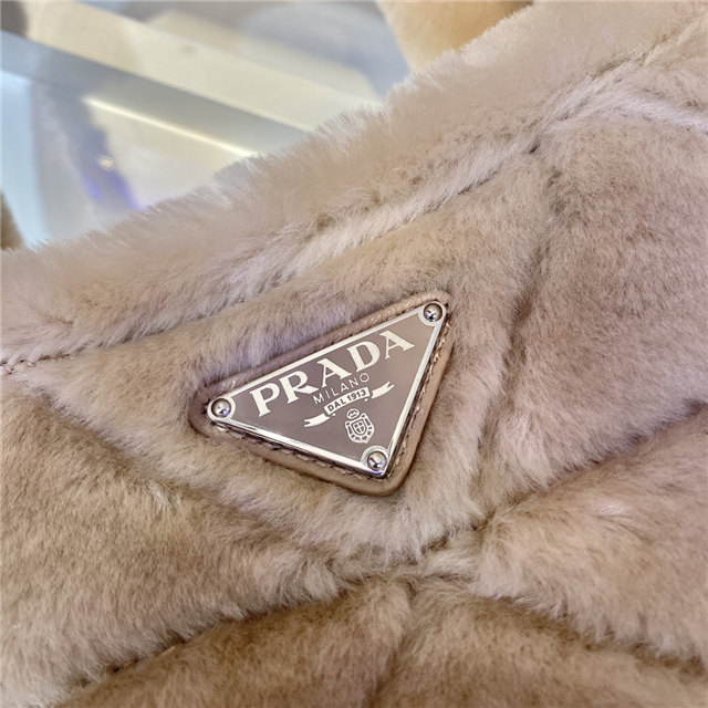Prada”s iconic triangle logo is reimagined in the stitched motif decorating this soft shearling tote. Completed by a detachable adjustable shoulder strap, the bag has a shearling pouch with zipper inside.