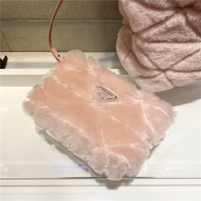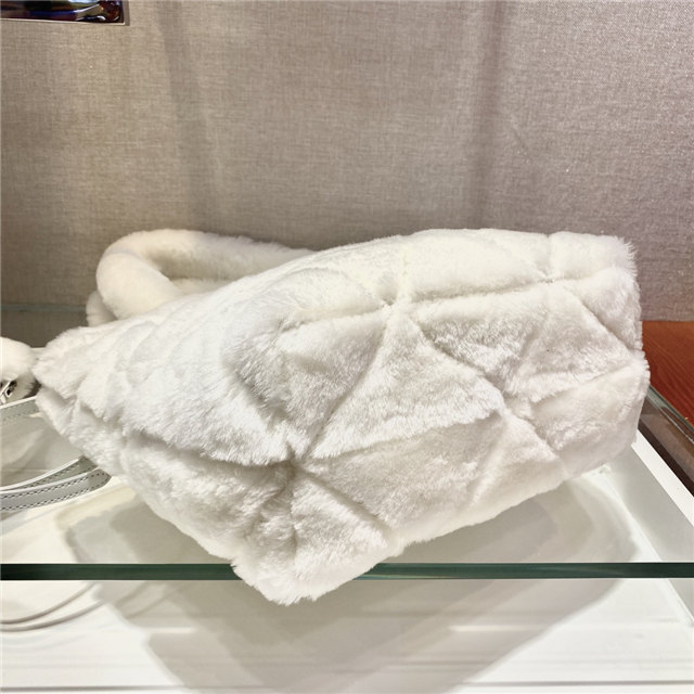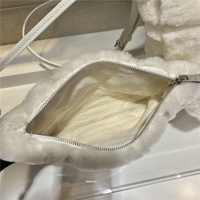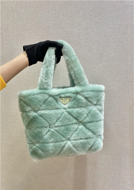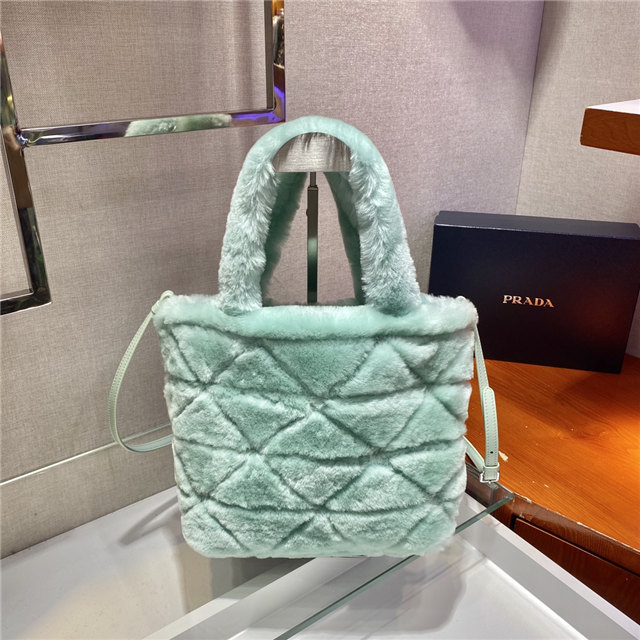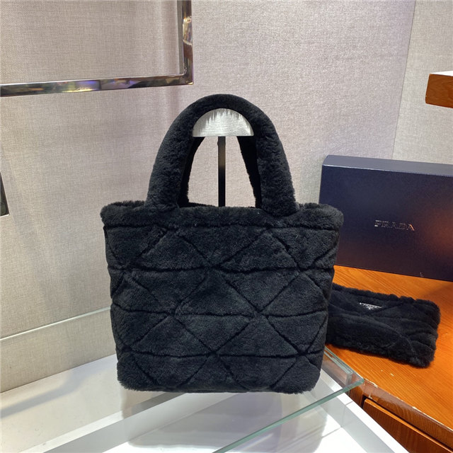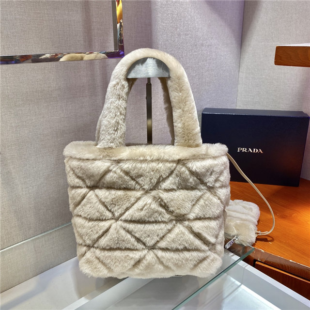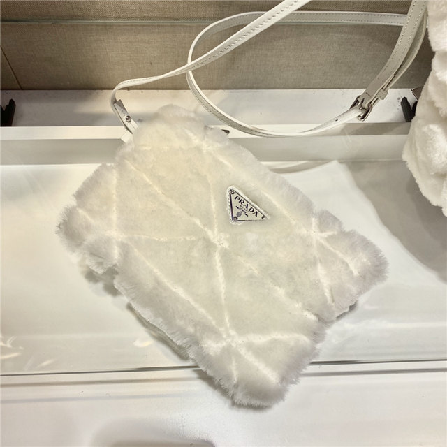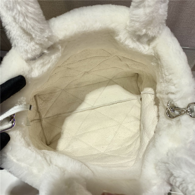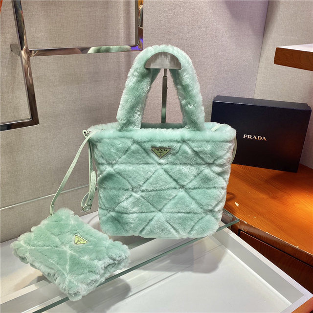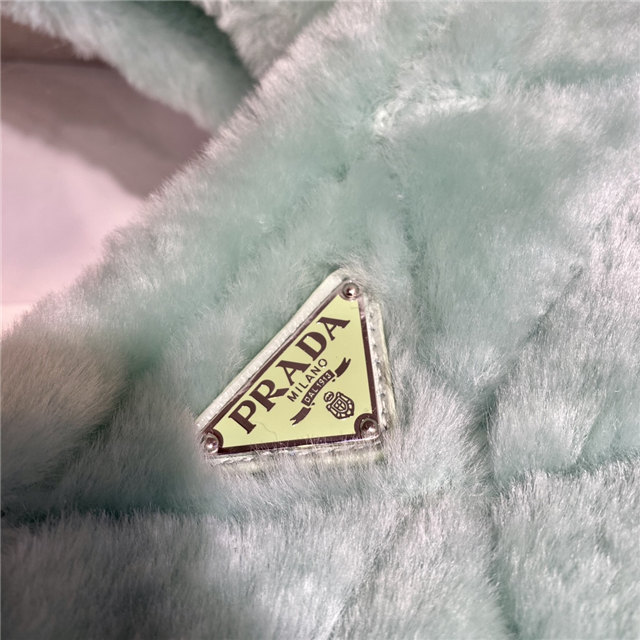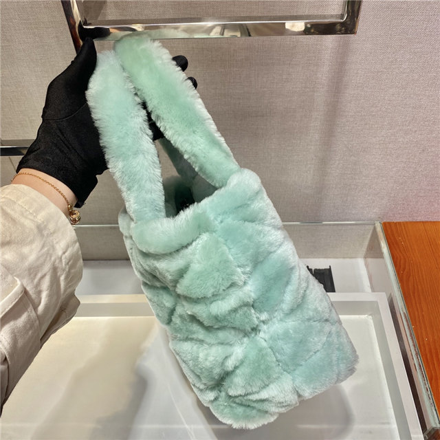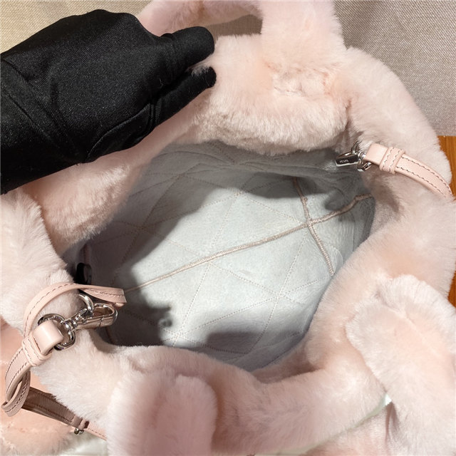 Prada”s iconic triangle logo is reimagined in the stitched motif decorating this soft shearling tote. Completed by a detachable adjustable shoulder strap, the bag has a shearling pouch with zipper inside.