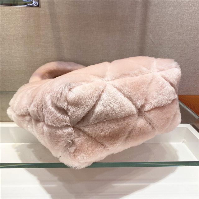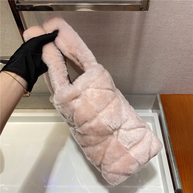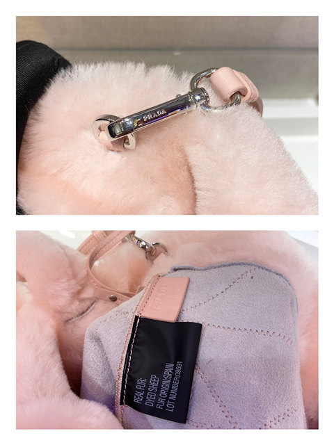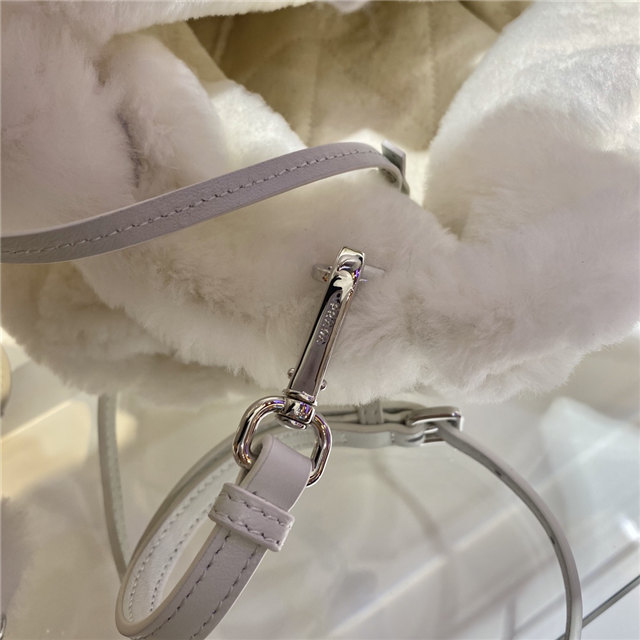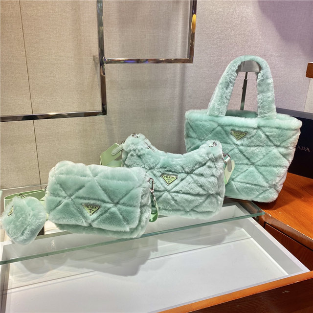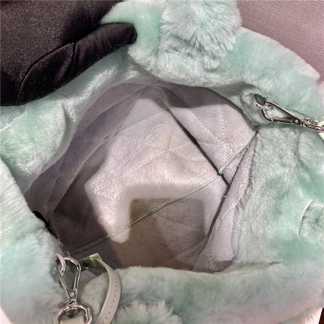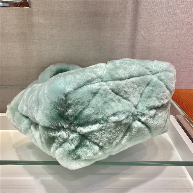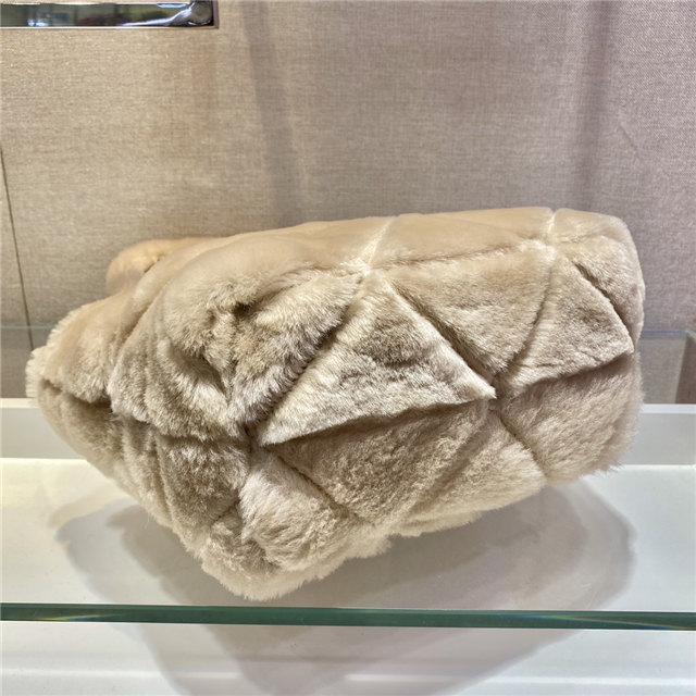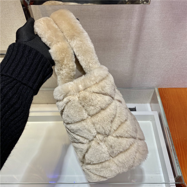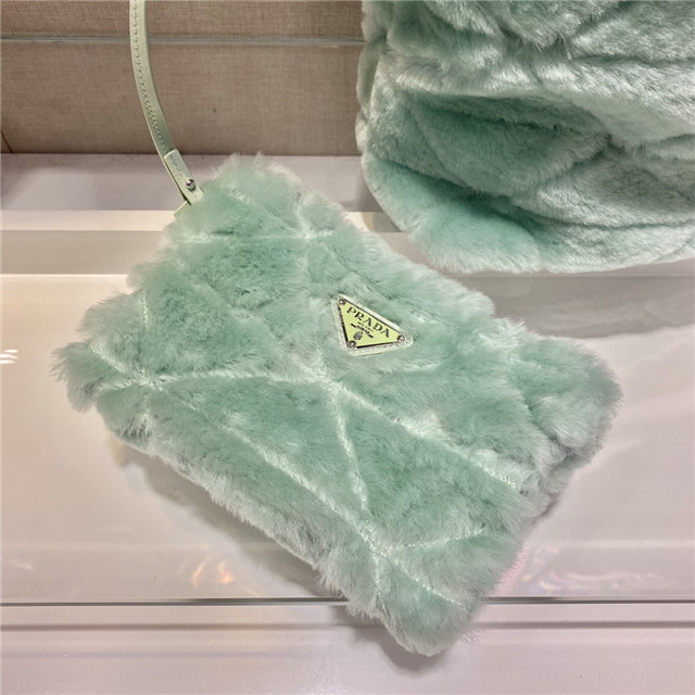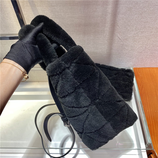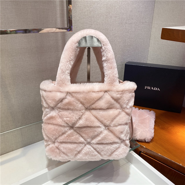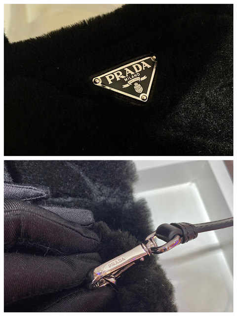 Prada”s iconic triangle logo is reimagined in the stitched motif decorating this soft shearling tote. Completed by a detachable adjustable shoulder strap, the bag has a shearling pouch with zipper inside.