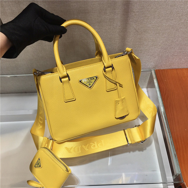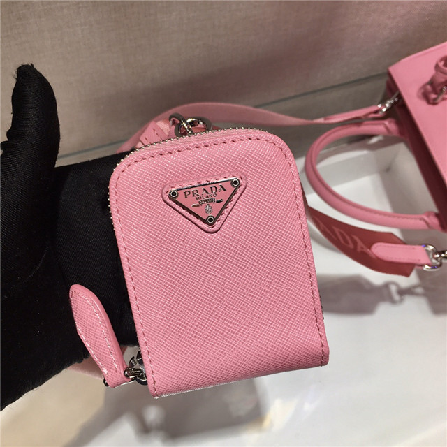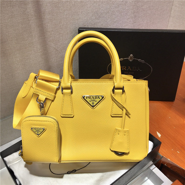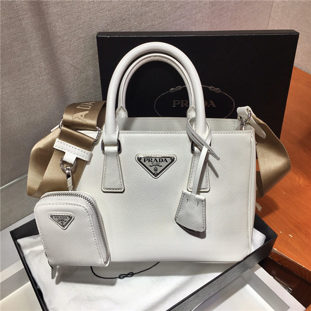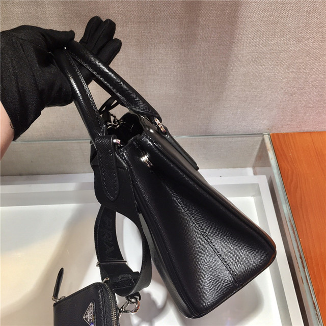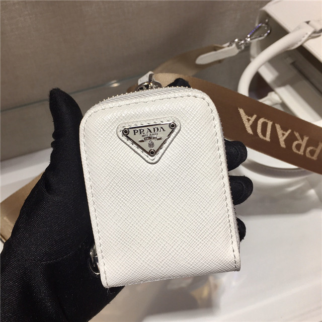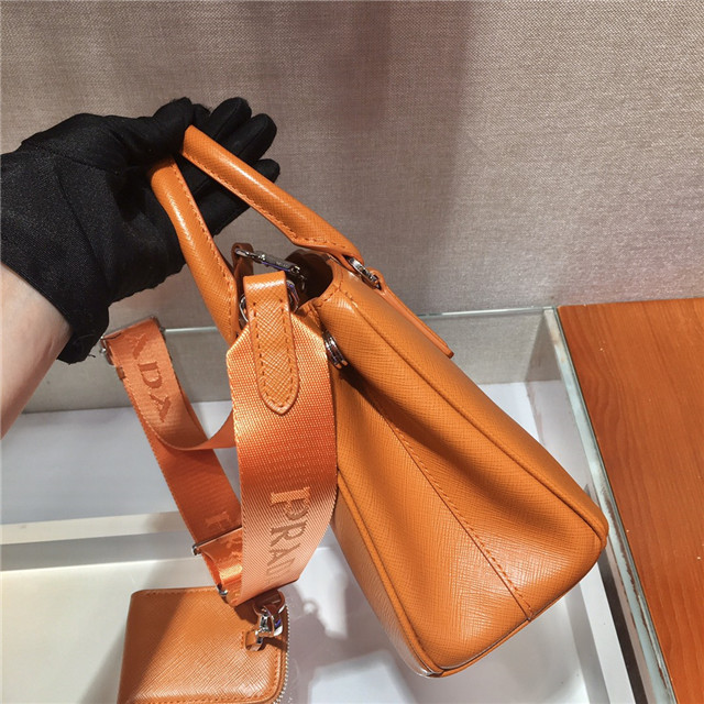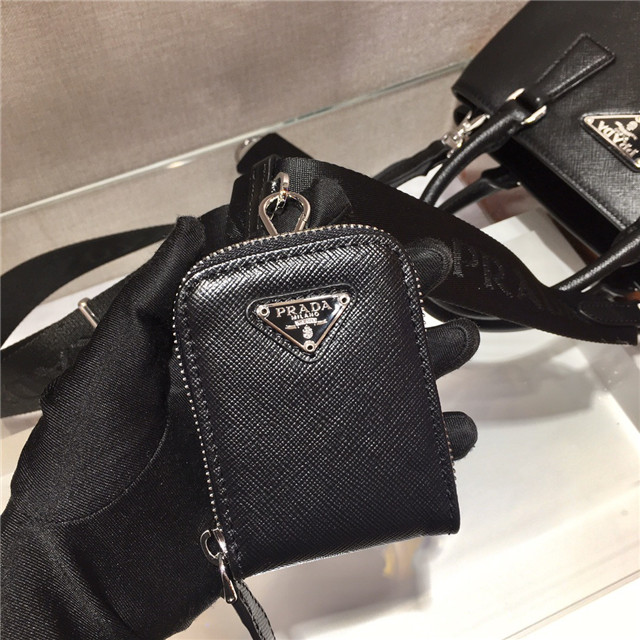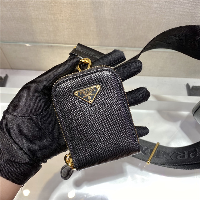 The elegance of a classic Prada accessory meets sporty details in this new bag made of Saffiano leather. The accessory, with a detachable shoulder strap and pouch, has an extremely modern, versatile design.