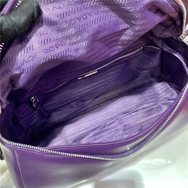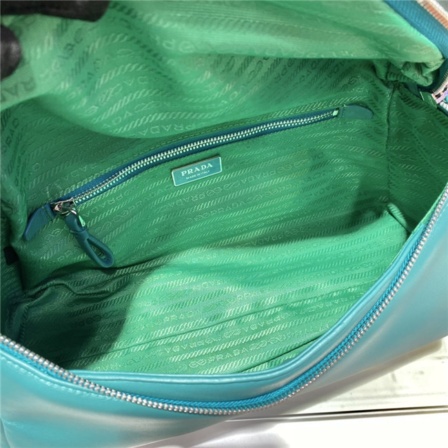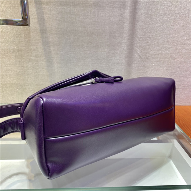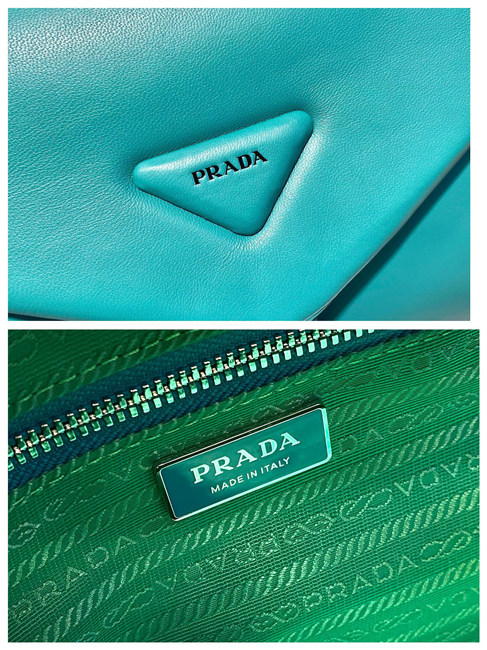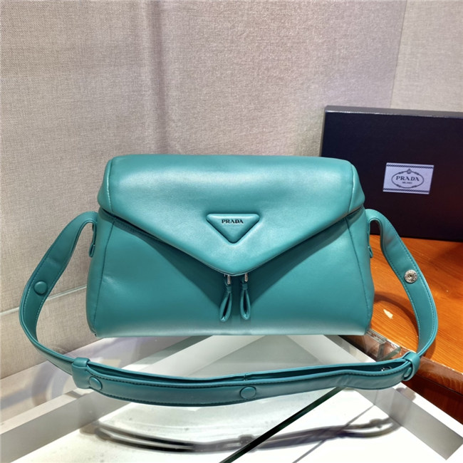 This soft nappa leather shoulder bag with sleek, minimalist lines has a contemporary attitude and a special reverse stitch construction. A study of the triangle inspires new geometric details and unique interpretations of the historic Prada logo. The iconic shape is reworked in the wide flap of this slightly padded accessory, completed by an adjustable leather handle that lets it be worn in different ways.