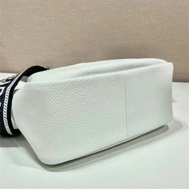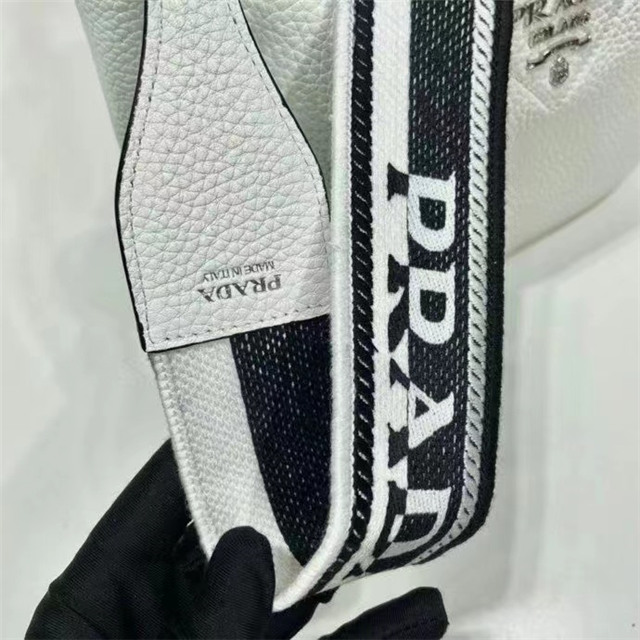 The reverse stitching emphasizes the soft, rounded silhouette of this handbag with a versatile detachable woven tape shoulder strap featuring the logo embroidered in a contrasting color. The accessory is decorated with the new interpretation of the triangle formed by stitching with the Prada metal lettering logo gleaming at its center.