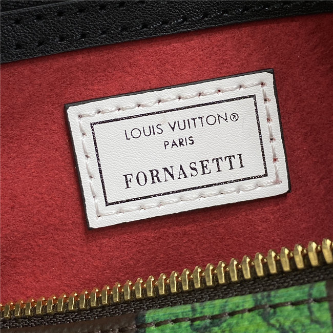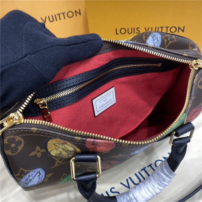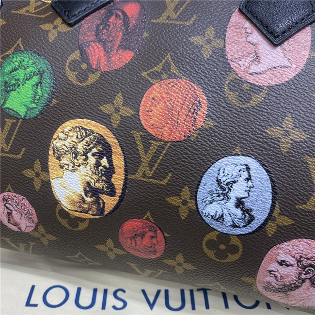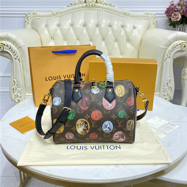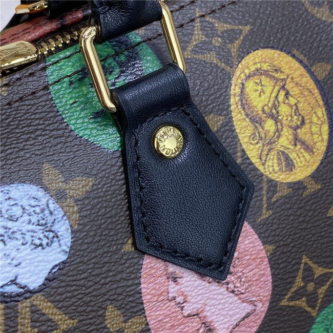For the Fall-Winter 2020-21 Collection, Nicolas Ghesquière crafts the Speedy Bandoulière 25 handbag in Monogram canvas with a bright and colorful print depicting the coins created by Italian artist Piero Fornasetti. With its recognizable silhouette, rolled leather handles, and engraved signature padlock, the Speedy is a timeless House icon.