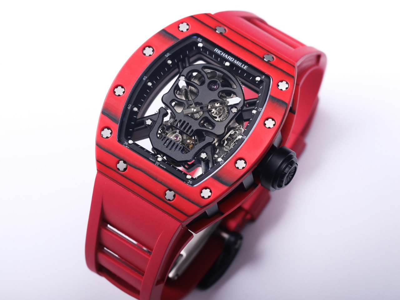The Richard Mille RM52-01 Tourbillon Skull watch reinterprets the essence of the RICHARD MILLE skull, surpassing multiple versions and allowing avid fans to own a highly accurate replica with precise dimensions, movement, and details. The left inner wall of the case is engraved with the RM052 logo, just like the original, and the size and depth of the right eye gear are similar to the original.