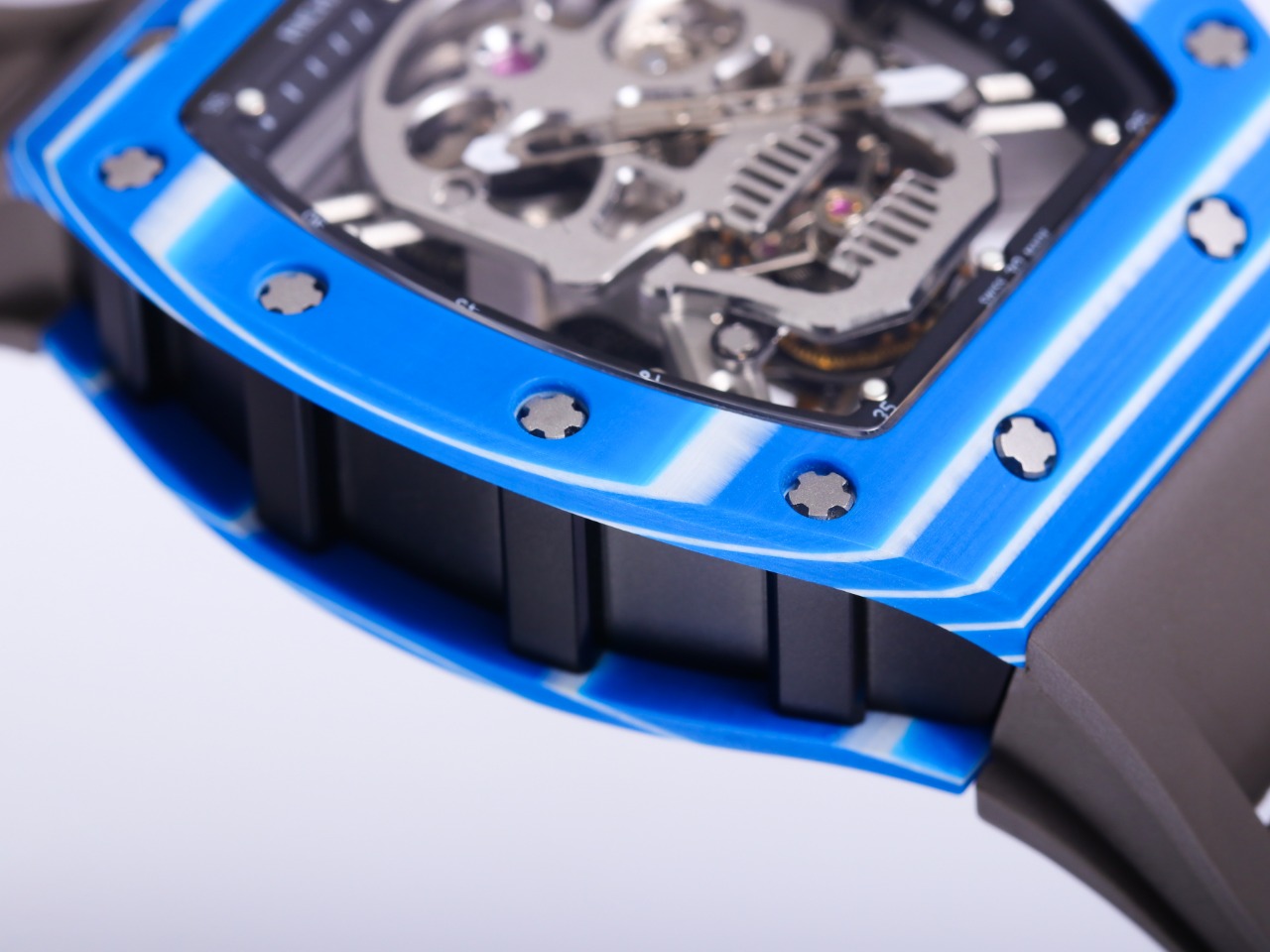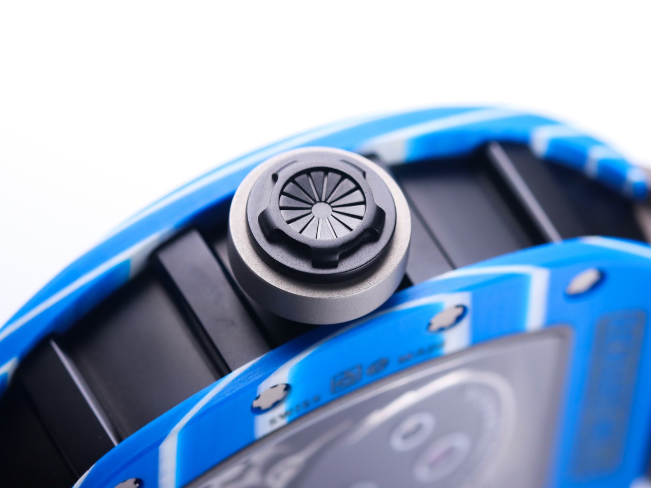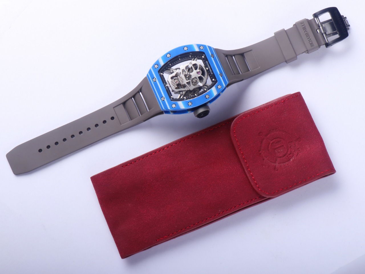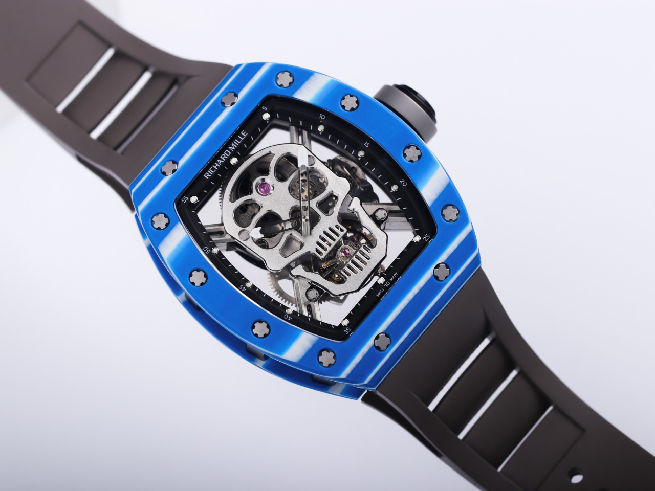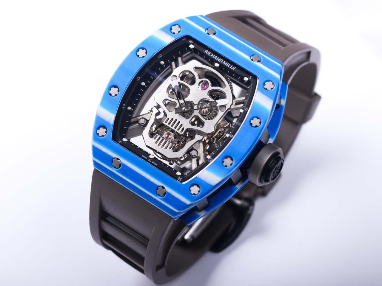 The Richard Mille RM52-01 Tourbillon Skull watch reinterprets the essence of the RICHARD MILLE skull, surpassing multiple versions and allowing avid fans to own a highly accurate replica with precise dimensions, movement, and details. The left inner wall of the case is engraved with the RM052 logo, just like the original, and the size and depth of the right eye gear are similar to the original.