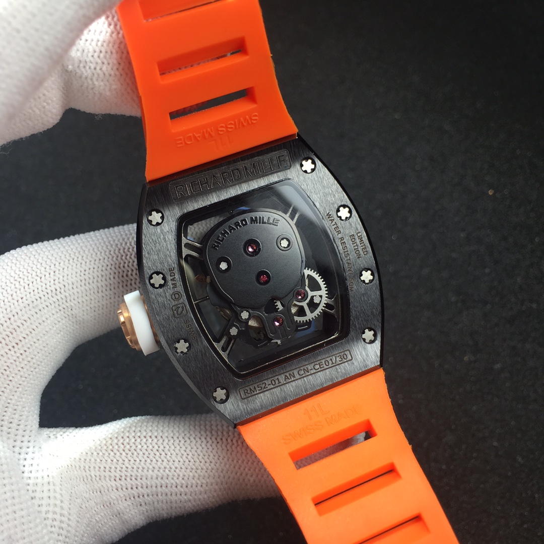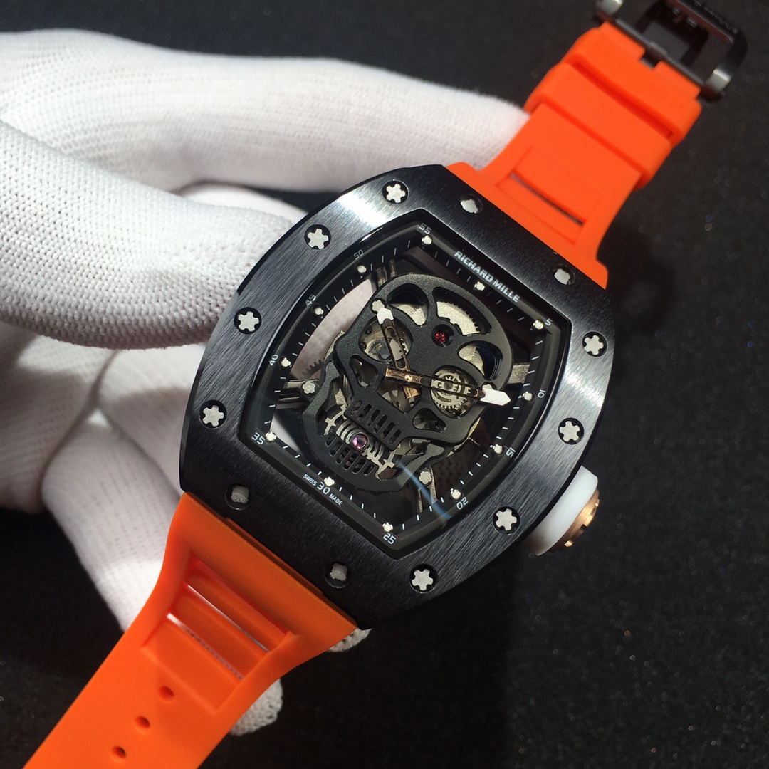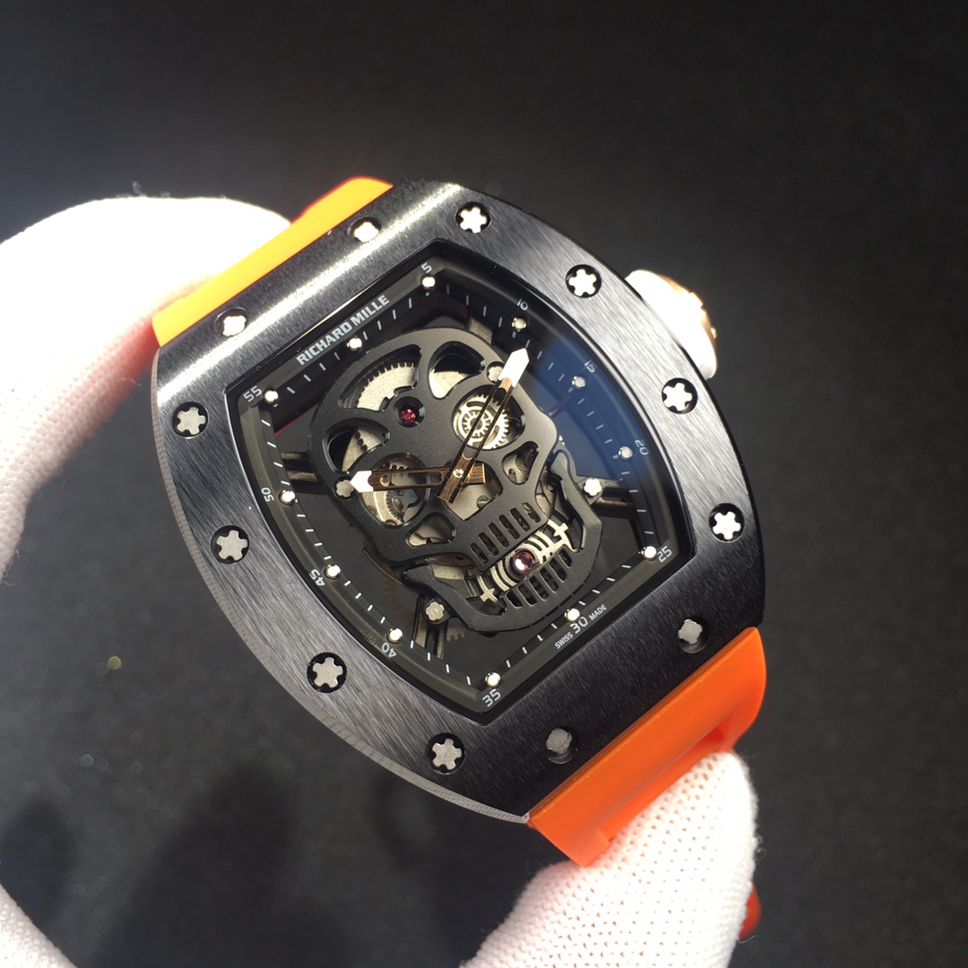 The Richard Mille RM52-01 Tourbillon Skull watch reinterprets the essence of the RICHARD MILLE skull, surpassing multiple versions and allowing avid fans to own a highly accurate replica with precise dimensions, movement, and details. The left inner wall of the case is engraved with the RM052 logo, just like the original, and the size and depth of the right eye gear are similar to the original.