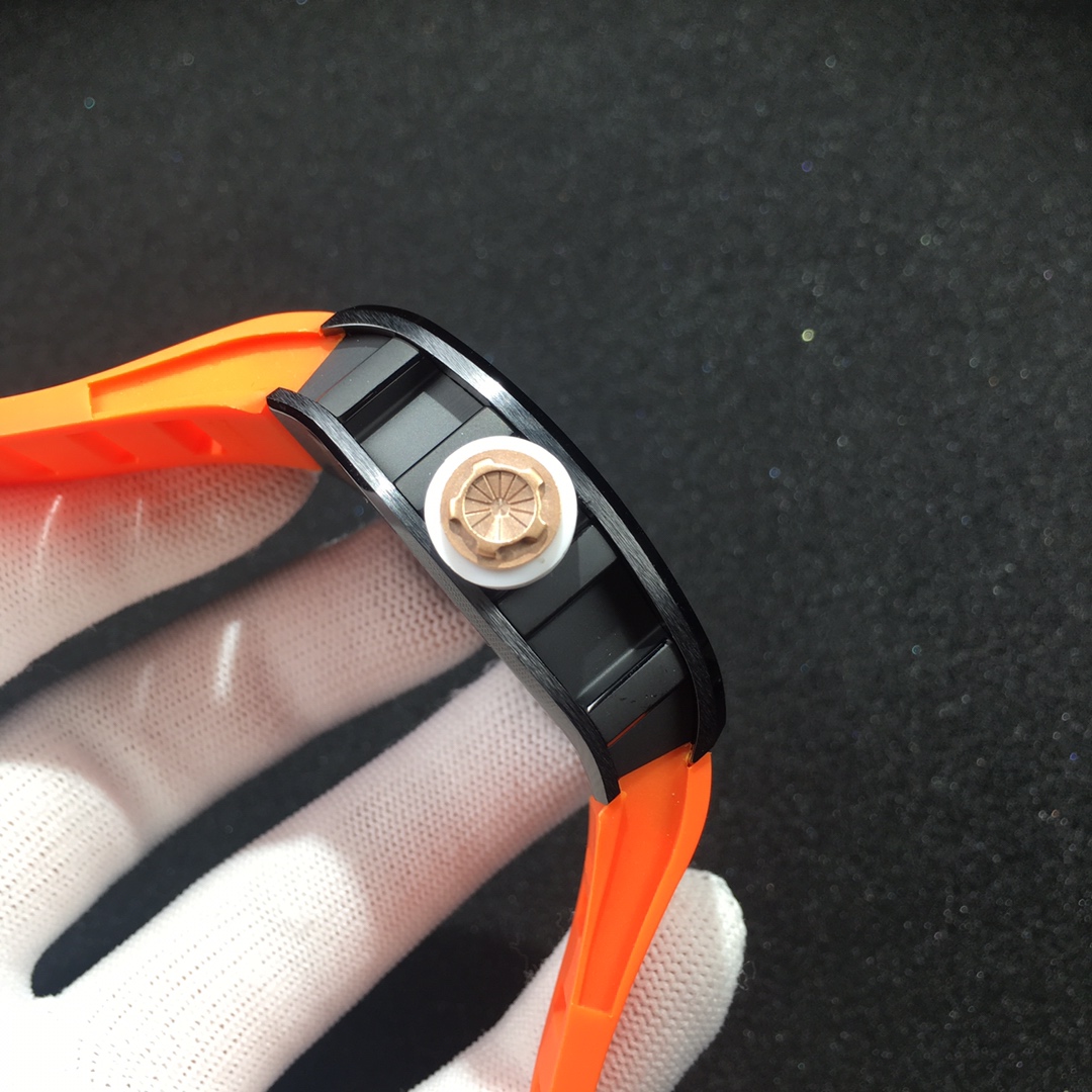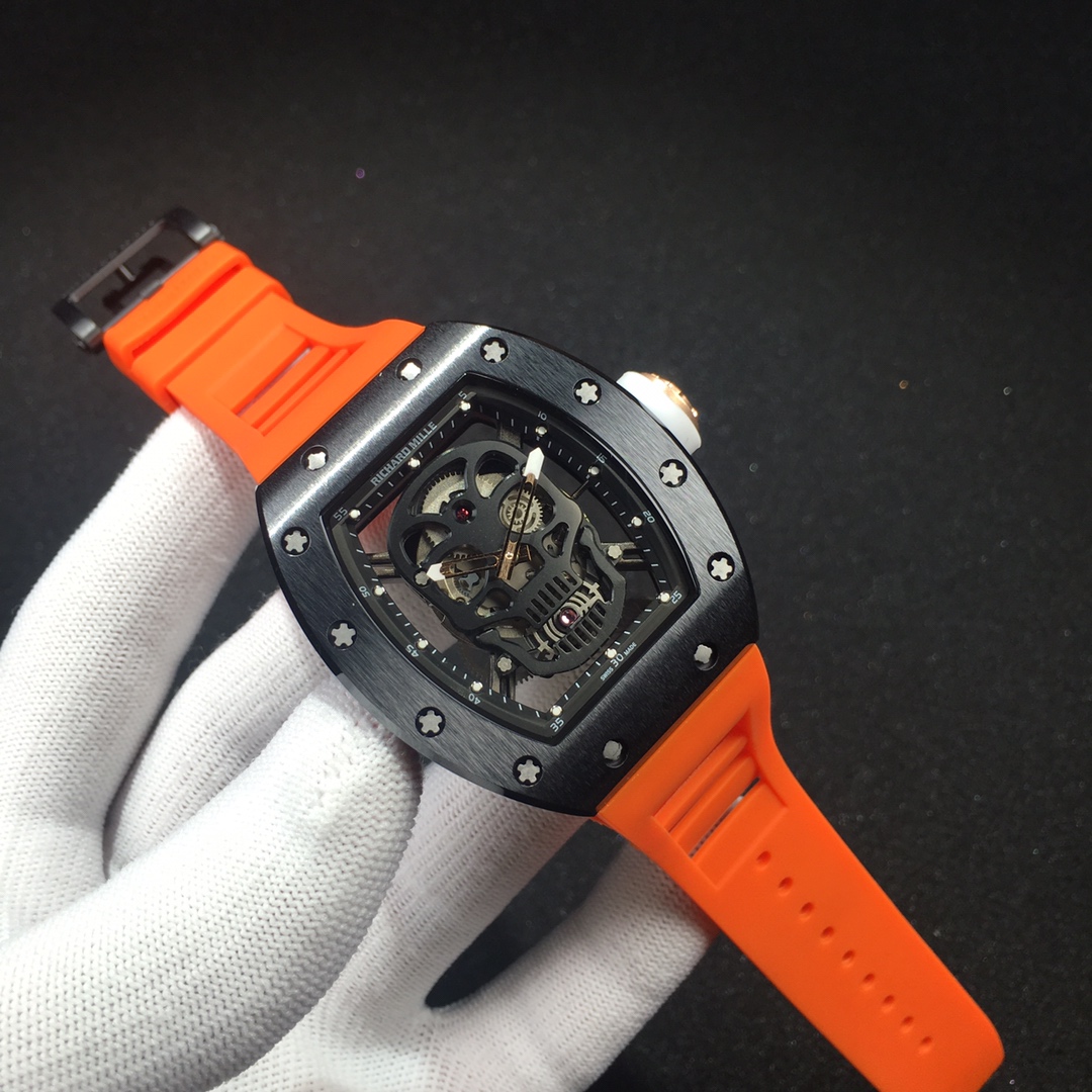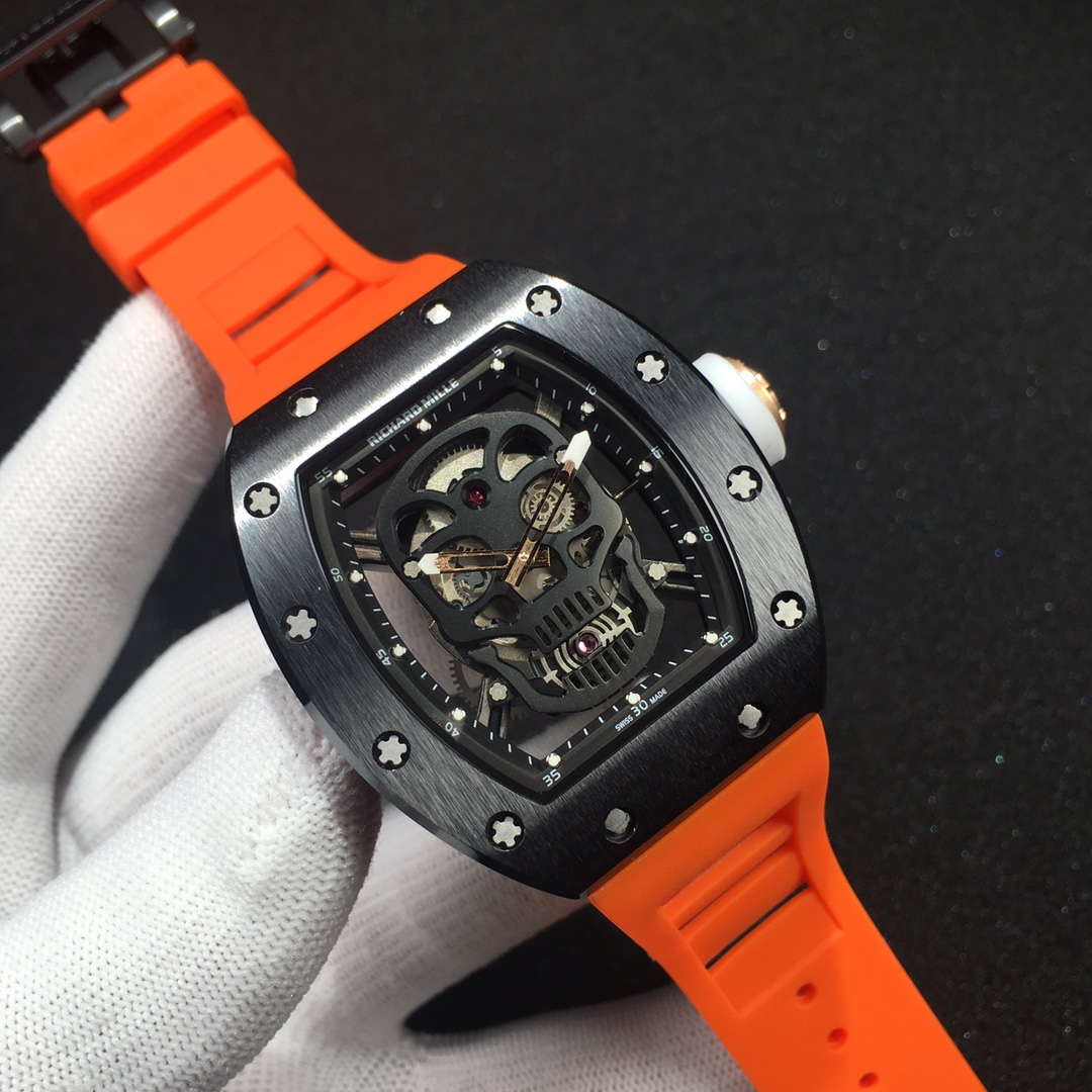 The Richard Mille RM52-01 Tourbillon Skull watch reinterprets the essence of the RICHARD MILLE skull, surpassing multiple versions and allowing avid fans to own a highly accurate replica with precise dimensions, movement, and details. The left inner wall of the case is engraved with the RM052 logo, just like the original, and the size and depth of the right eye gear are similar to the original.