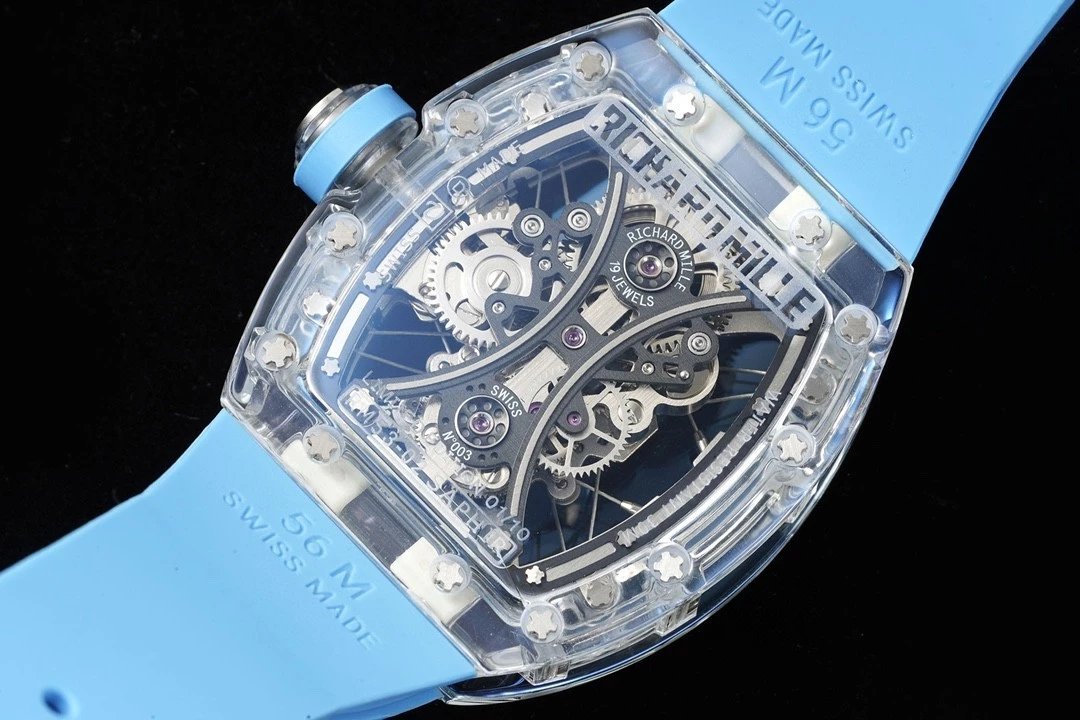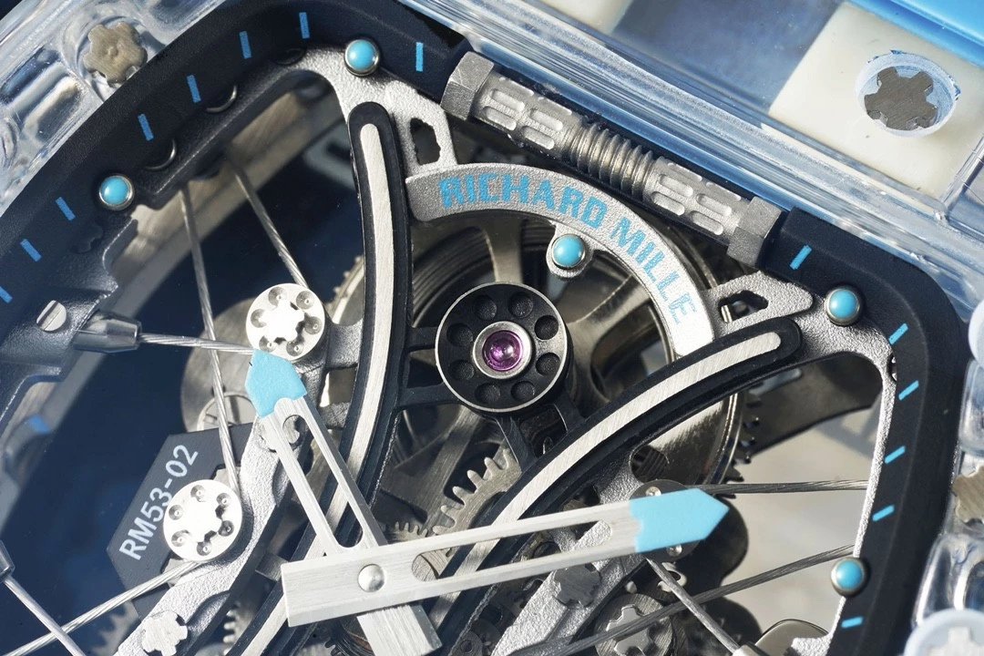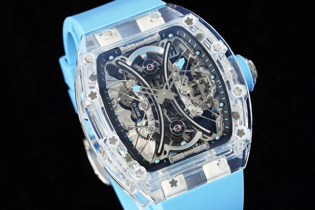 The RM 53-02 Tourbillon Sapphire watch seamlessly blends complexity and simplicity. The triple-curve sapphire barrel-shaped case design presents a tremendous challenge in its production, resulting in the most stunning replica tourbillon watch! Get ready to be amazed!