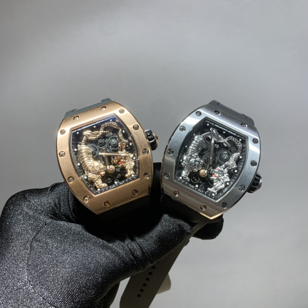 The RM51-01 “Tiger and Dragon Battle” watch is a hand-painted artistic masterpiece featuring vibrant colors and lifelike depictions of a tiger and a dragon intertwined around the movement. The tiger represents power and courage, while the dragon symbolizes prosperity and happiness, making it a highly coveted timepiece with profound symbolic significance.