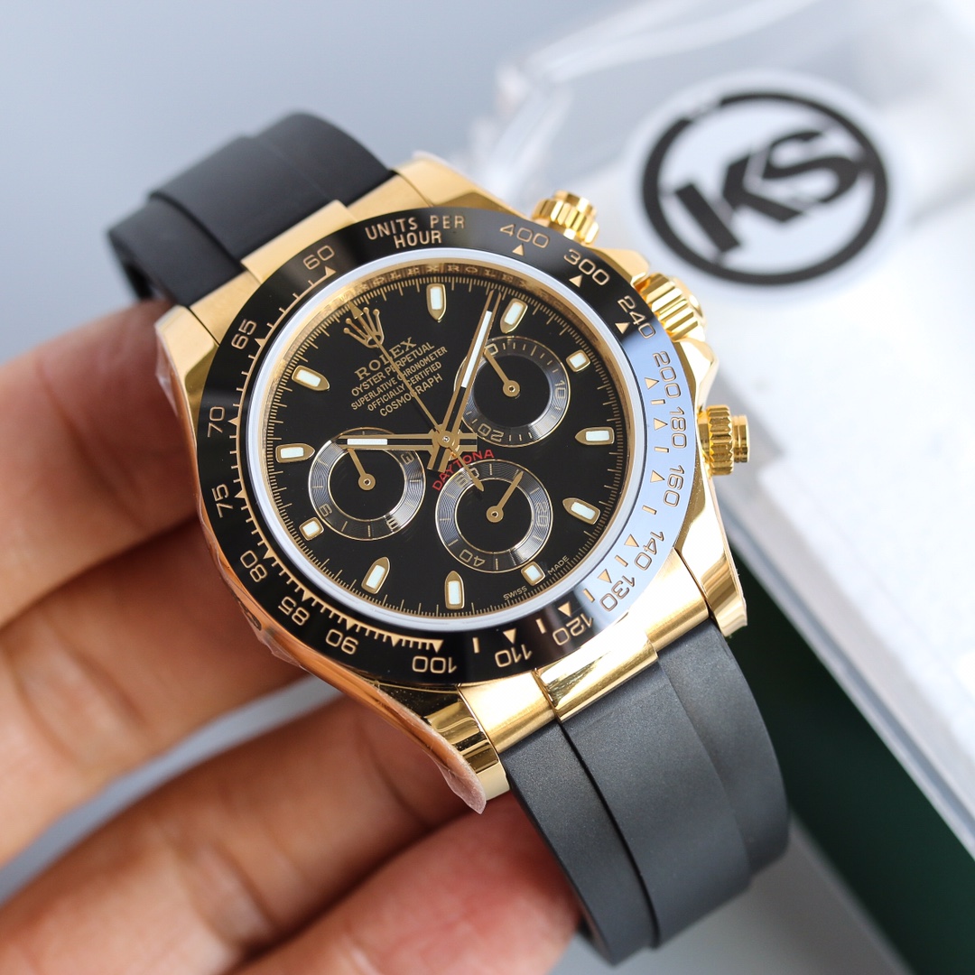 Rolex Cosmograph Daytona Series – This Rolex Cosmograph Daytona watch is renowned for its classic design, exceptional timing function, and precise performance. With a size of 40mm x 12.2mm, it is suitable for both men and women. The Swiss 7750 movement ensures accurate and reliable time display and timing function. The superluminova coating allows for easy time reading in any lighting conditions. With a water resistance of over 100 meters, this watch is suitable for water activities in daily life. The sapphire crystal glass protects the dial and provides a clear view. The folding clasp and stainless steel case showcase durability and a classic appearance. It comes with a black Oysterflex rubber strap that is both comfortable and durable. The Rolex Cosmograph Daytona watch exemplifies Rolex’s excellent craftsmanship and precise performance in the field of watchmaking, making it an ideal choice for those pursuing refinement and timing function.