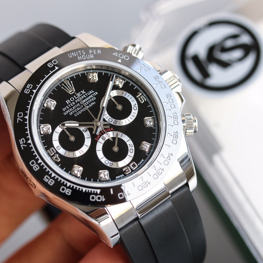 Rolex Cosmograph Daytona Series – This Rolex Cosmograph Daytona watch is renowned for its classic design, exceptional timing function, and precise performance. With a size of 40mm x 12.2mm, it is suitable for both men and women. The Swiss 7750 movement ensures accurate and reliable time display and timing function. The superluminova coating allows for easy time reading in any lighting conditions. With a water resistance of over 100 meters, this watch is suitable for water activities in daily life. The sapphire crystal glass protects the dial and provides a clear view. The folding clasp and stainless steel case showcase durability and a classic appearance. It comes with a black Oysterflex rubber strap that is both comfortable and durable. The Rolex Cosmograph Daytona watch exemplifies Rolex’s excellent craftsmanship and precise performance in the field of watchmaking, making it an ideal choice for those pursuing refinement and timing function.