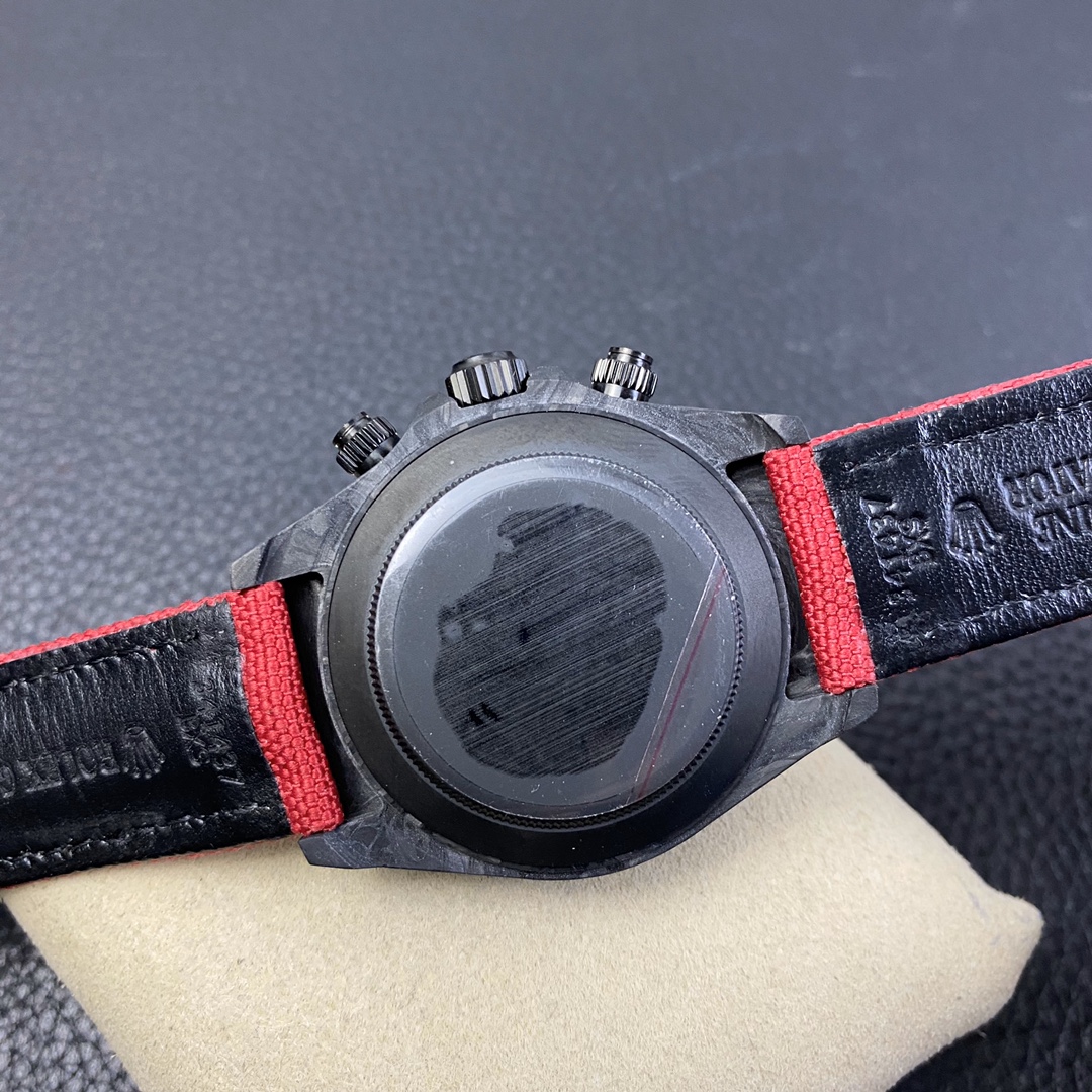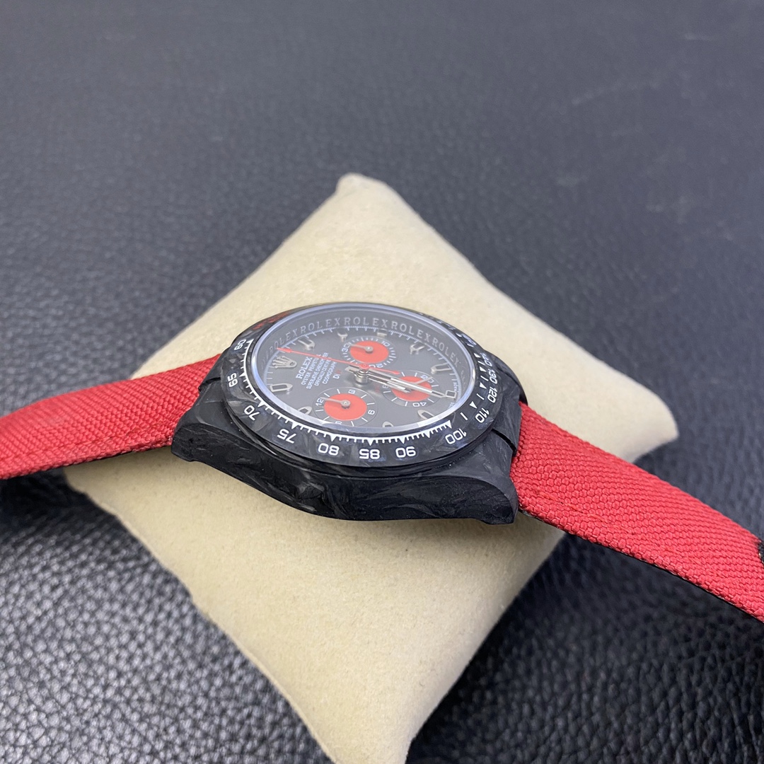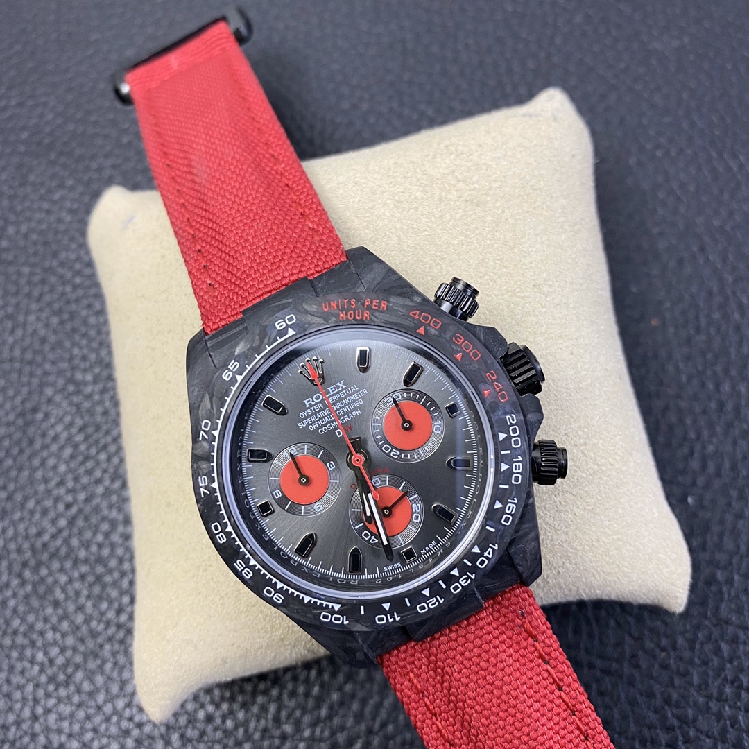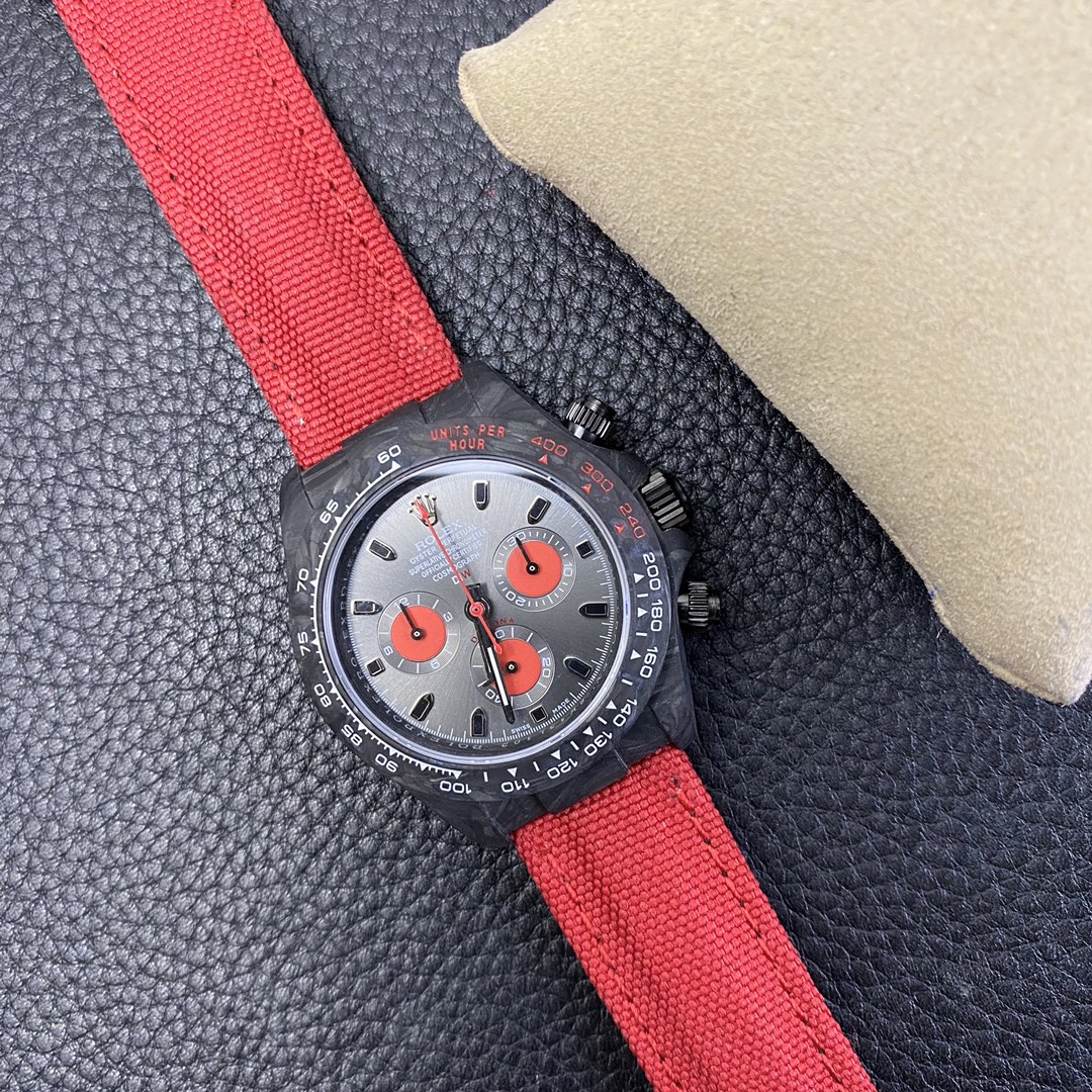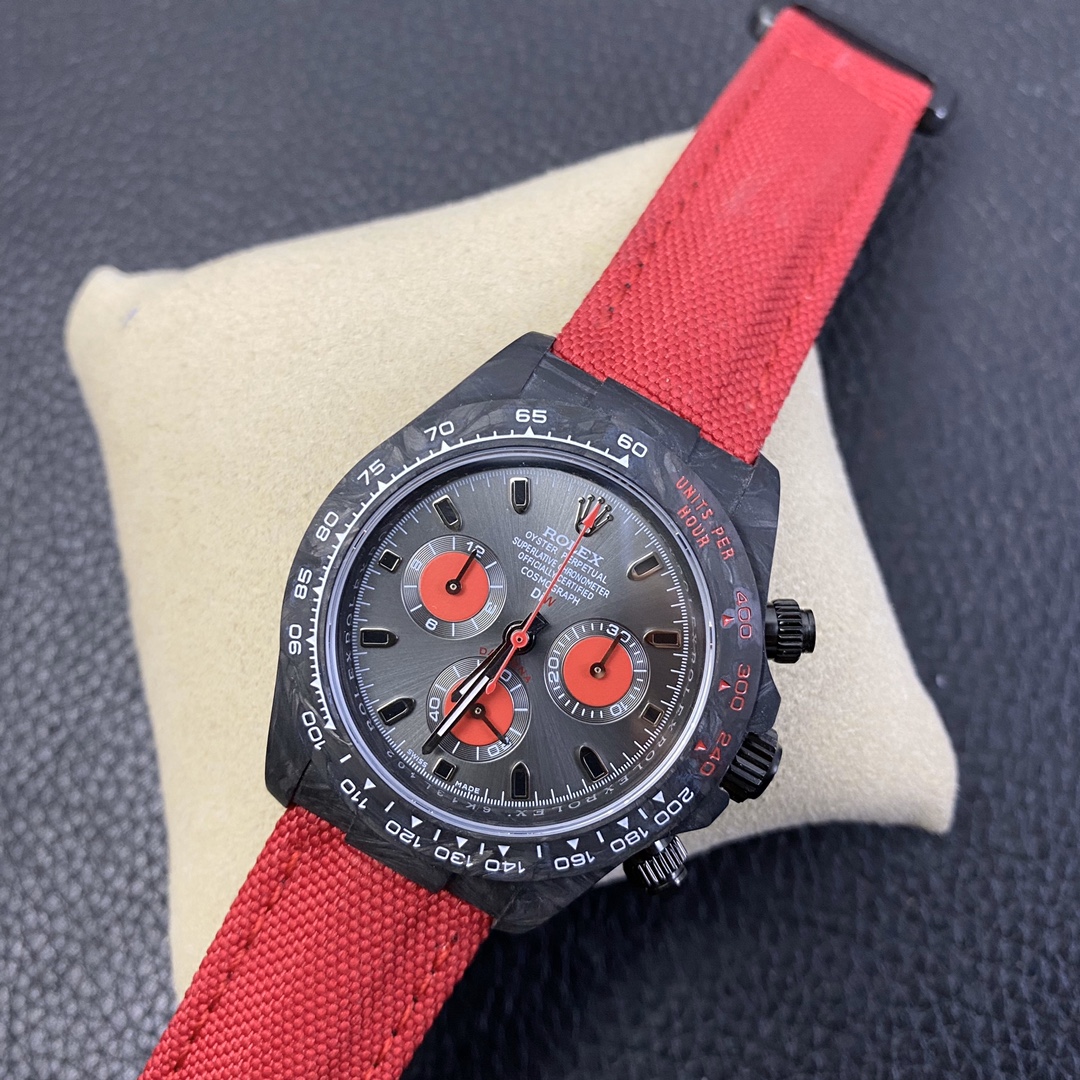 The Rolex Daytona watch exudes a sense of fashion and sportiness with its 40mm x 13mm size and sporty style. Equipped with a 7750 automatic movement, it ensures precise and reliable time display. The watch features hour, minute, and second functions, and is equipped with luminescent hands and markers, ensuring clear readability even in low-light environments. With a water resistance of 50 meters, the watch is suitable for waterproof demands in daily life. The sapphire crystal glass provides excellent scratch resistance and clear time display. The carbon fiber case exhibits lightweight and durability, presenting a modern feel. Equipped with a fabric strap, the watch adds a sporty style and a sense of fashion. This Rolex Daytona watch, with its outstanding performance and fashionable design, is an ideal choice for individuals who value quality and a sporty style.