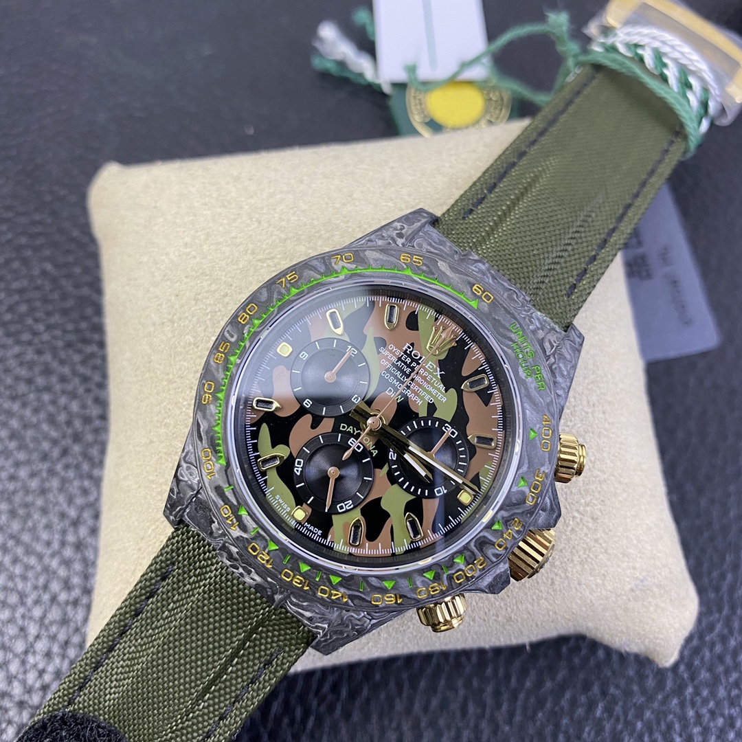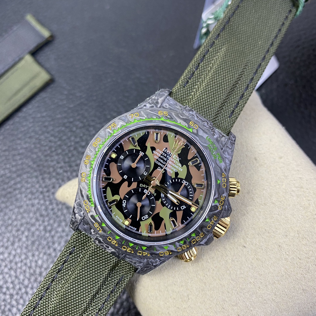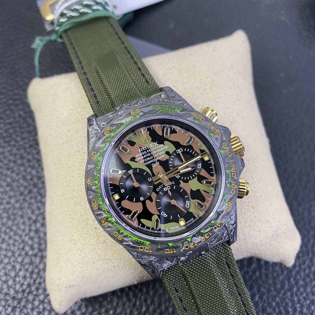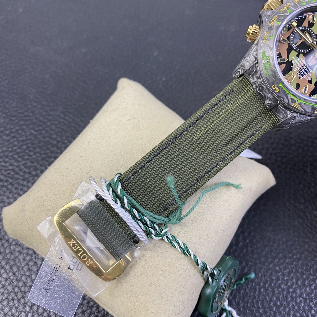 The Rolex Daytona watch exudes a sense of fashion and sportiness with its 40mm x size and sporty style. Equipped with a 7750 automatic movement, it ensures precise and reliable time display. The watch features hour, minute, and second functions, and is equipped with luminescent hands and markers, ensuring clear readability even in low-light environments. With a water resistance of 50 meters, the watch is suitable for waterproof demands in daily life. The sapphire crystal glass provides excellent scratch resistance and clear time display. The carbon fiber case exhibits lightweight and durability, presenting a modern feel. Equipped with a fabric strap, the watch adds a sporty style and a sense of fashion. This Rolex Daytona watch, with its outstanding performance and fashionable design, is an ideal choice for individuals who value quality and a sporty style.