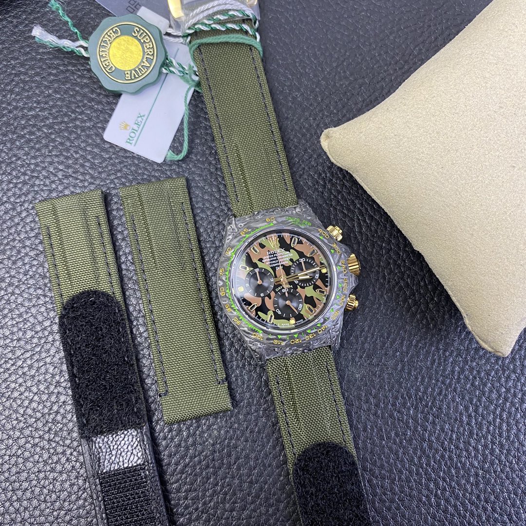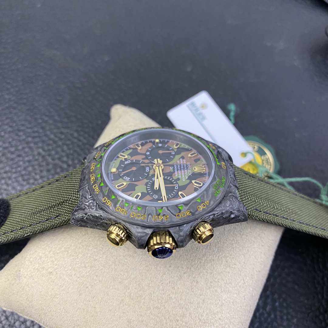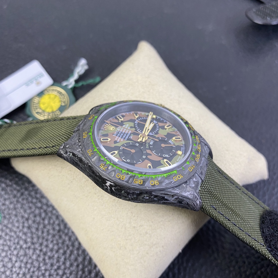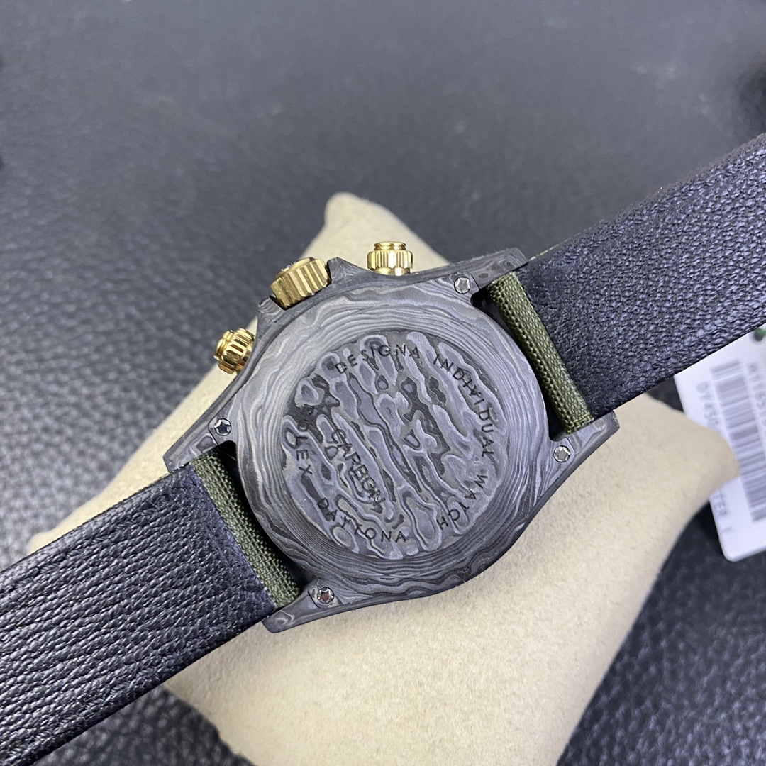 The Rolex Daytona watch exudes a sense of fashion and sportiness with its 40mm x size and sporty style. Equipped with a 7750 automatic movement, it ensures precise and reliable time display. The watch features hour, minute, and second functions, and is equipped with luminescent hands and markers, ensuring clear readability even in low-light environments. With a water resistance of 50 meters, the watch is suitable for waterproof demands in daily life. The sapphire crystal glass provides excellent scratch resistance and clear time display. The carbon fiber case exhibits lightweight and durability, presenting a modern feel. Equipped with a fabric strap, the watch adds a sporty style and a sense of fashion. This Rolex Daytona watch, with its outstanding performance and fashionable design, is an ideal choice for individuals who value quality and a sporty style.