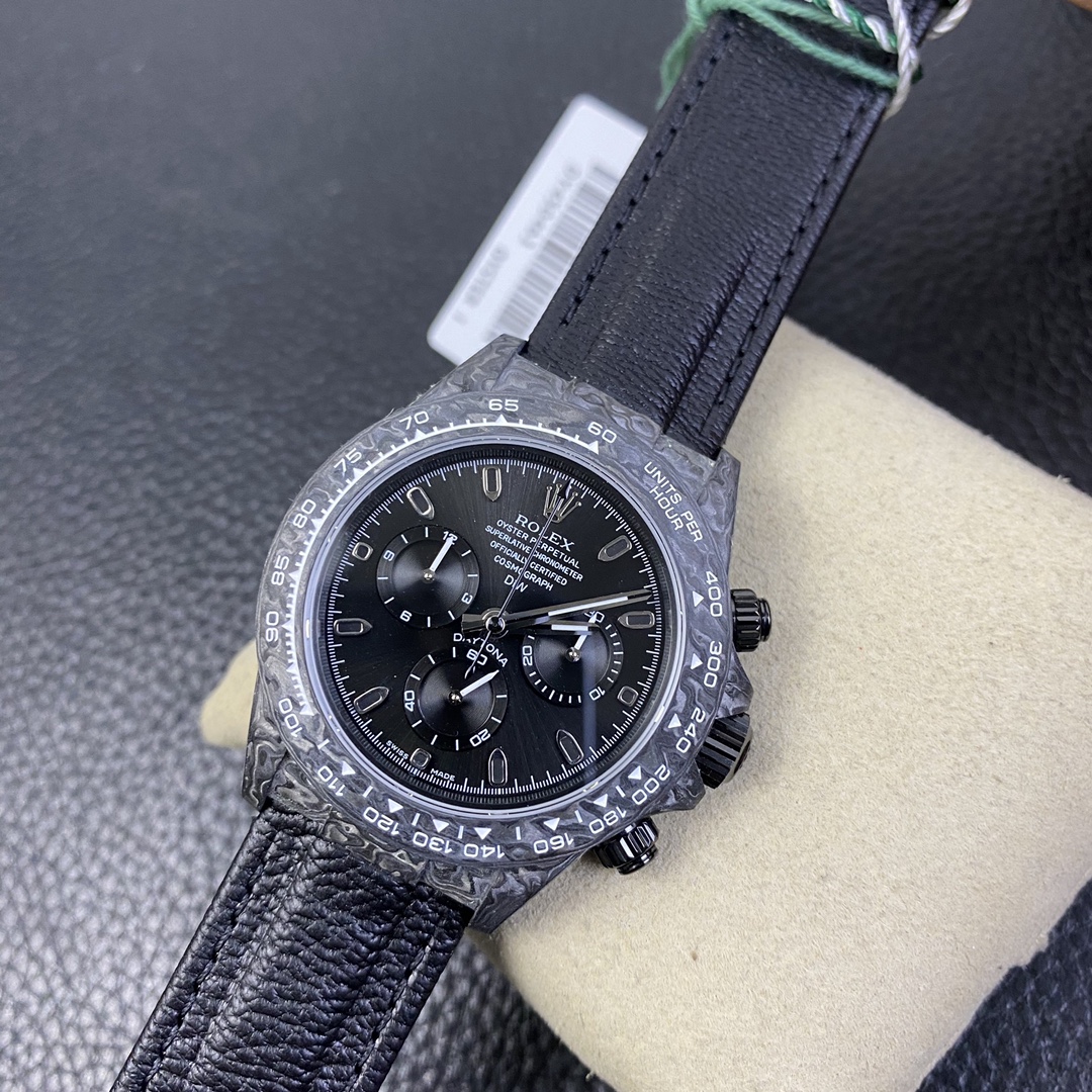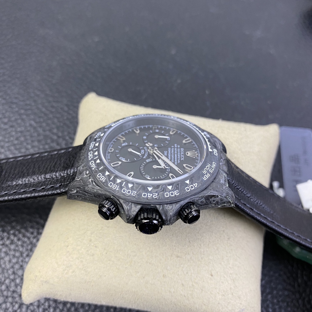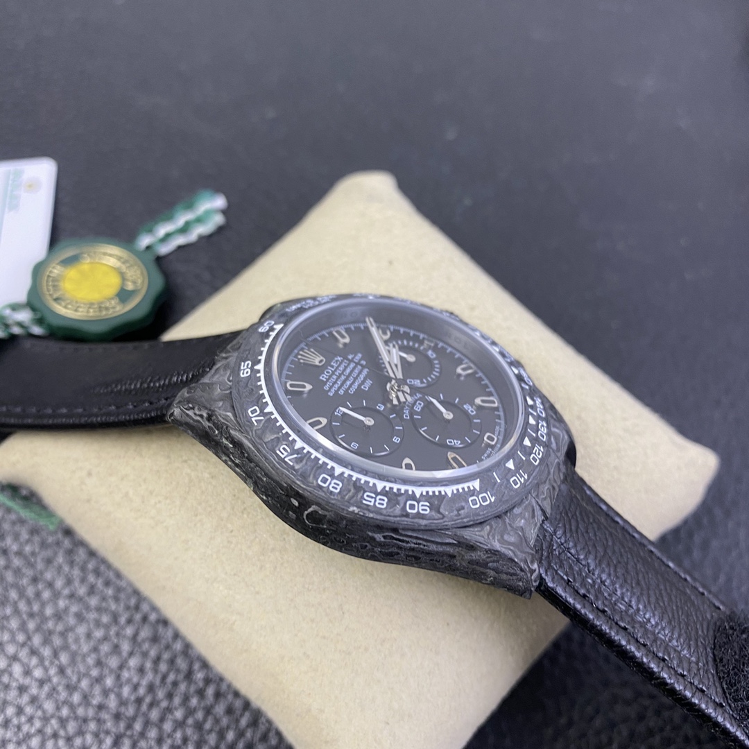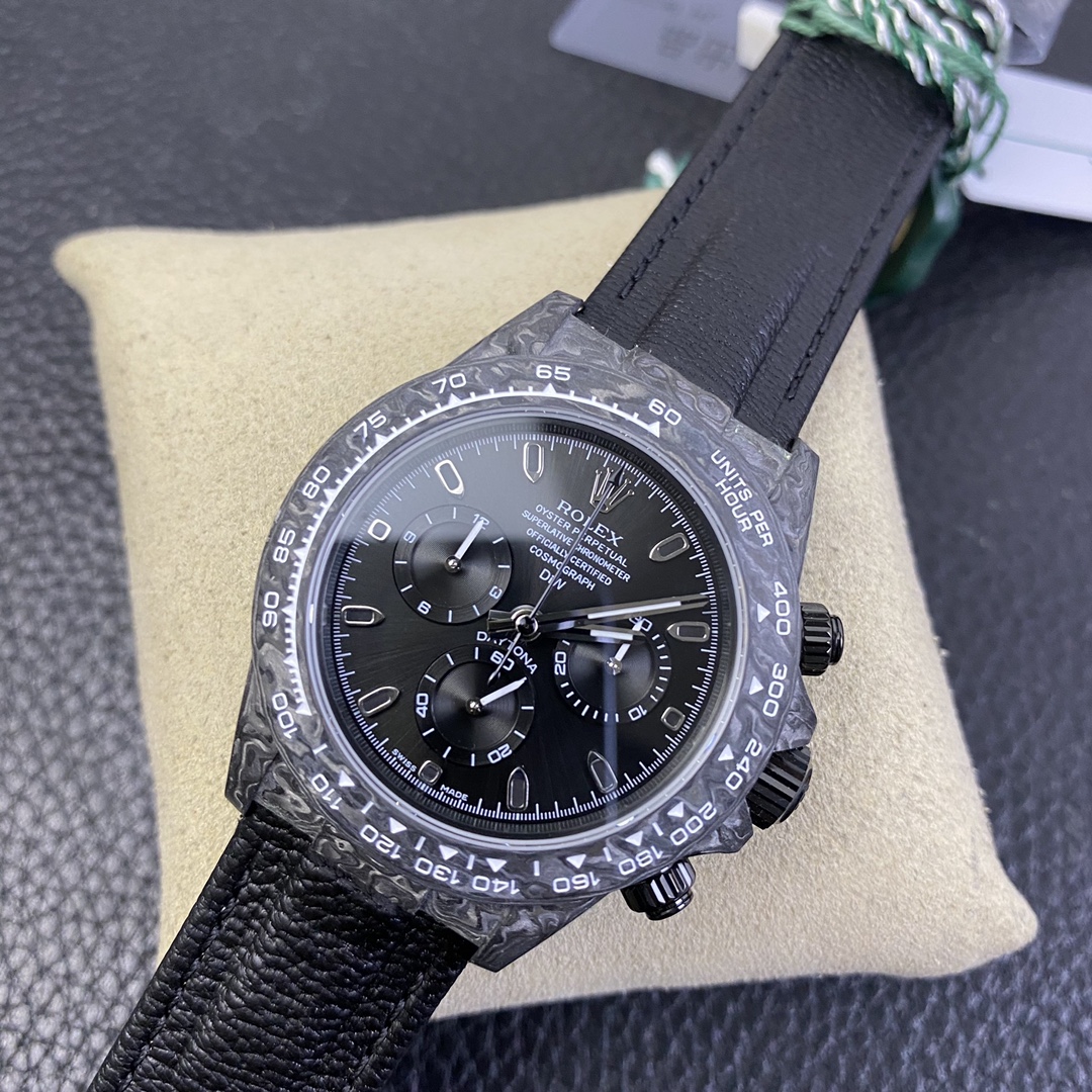 The Rolex Daytona watch exudes a sense of fashion and sportiness with its 40mm x size and sporty style. Equipped with a 7750 automatic movement, it ensures precise and reliable time display. The watch features hour, minute, and second functions, and is equipped with luminescent hands and markers, ensuring clear readability even in low-light environments. With a water resistance of 50 meters, the watch is suitable for waterproof demands in daily life. The sapphire crystal glass provides excellent scratch resistance and clear time display. The carbon fiber case exhibits lightweight and durability, presenting a modern feel. Equipped with a fabric strap, the watch adds a sporty style and a sense of fashion. This Rolex Daytona watch, with its outstanding performance and fashionable design, is an ideal choice for individuals who value quality and a sporty style.