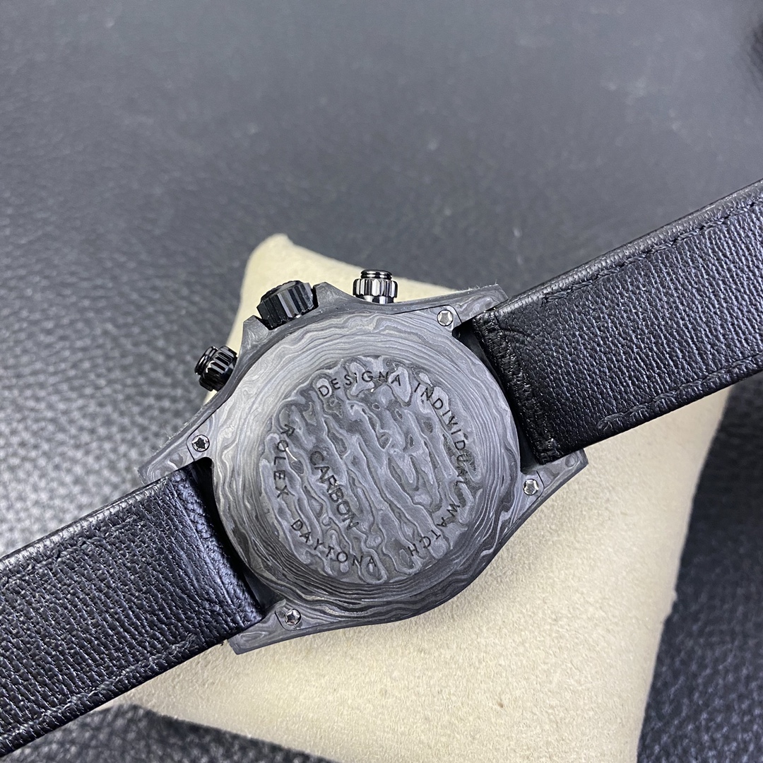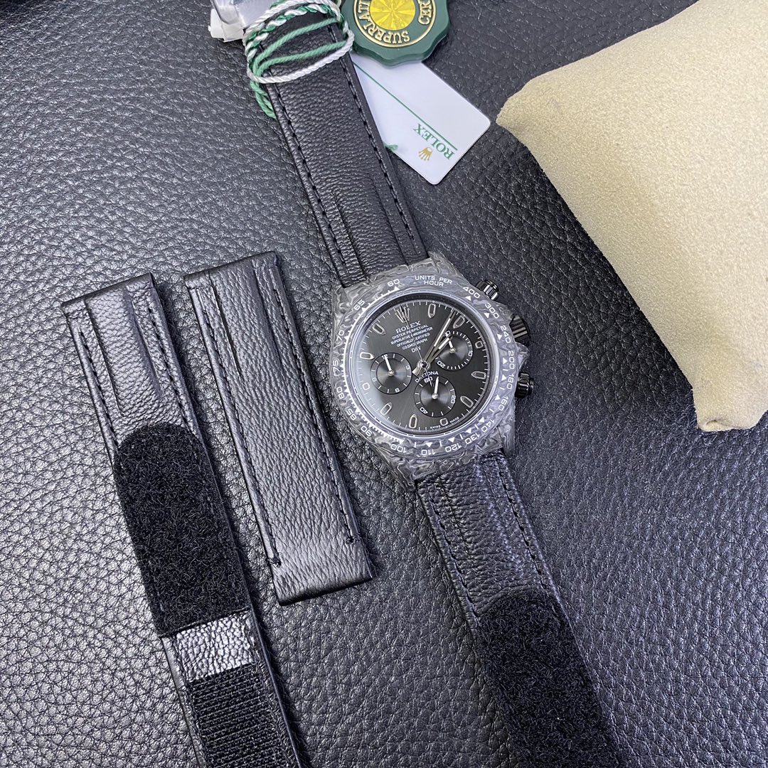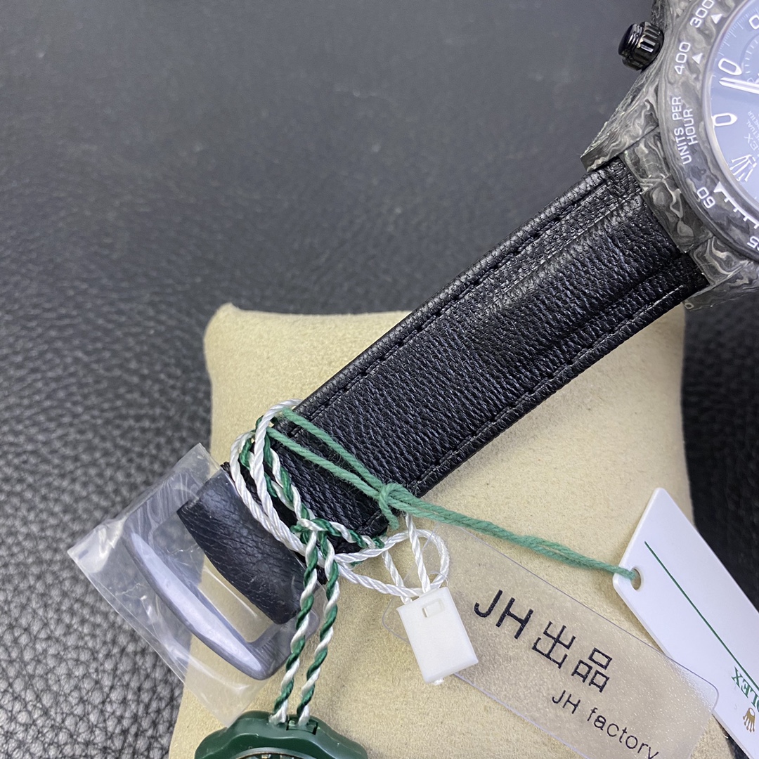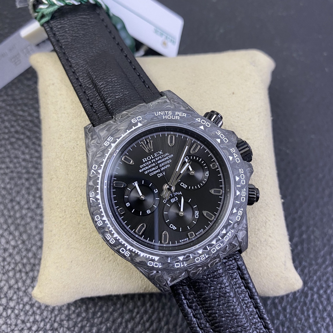 The Rolex Daytona watch exudes a sense of fashion and sportiness with its 40mm x size and sporty style. Equipped with a 7750 automatic movement, it ensures precise and reliable time display. The watch features hour, minute, and second functions, and is equipped with luminescent hands and markers, ensuring clear readability even in low-light environments. With a water resistance of 50 meters, the watch is suitable for waterproof demands in daily life. The sapphire crystal glass provides excellent scratch resistance and clear time display. The carbon fiber case exhibits lightweight and durability, presenting a modern feel. Equipped with a fabric strap, the watch adds a sporty style and a sense of fashion. This Rolex Daytona watch, with its outstanding performance and fashionable design, is an ideal choice for individuals who value quality and a sporty style.