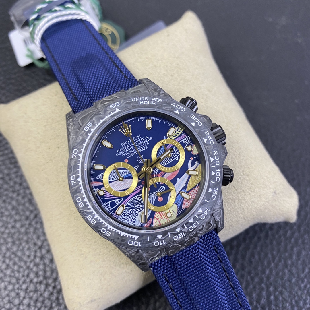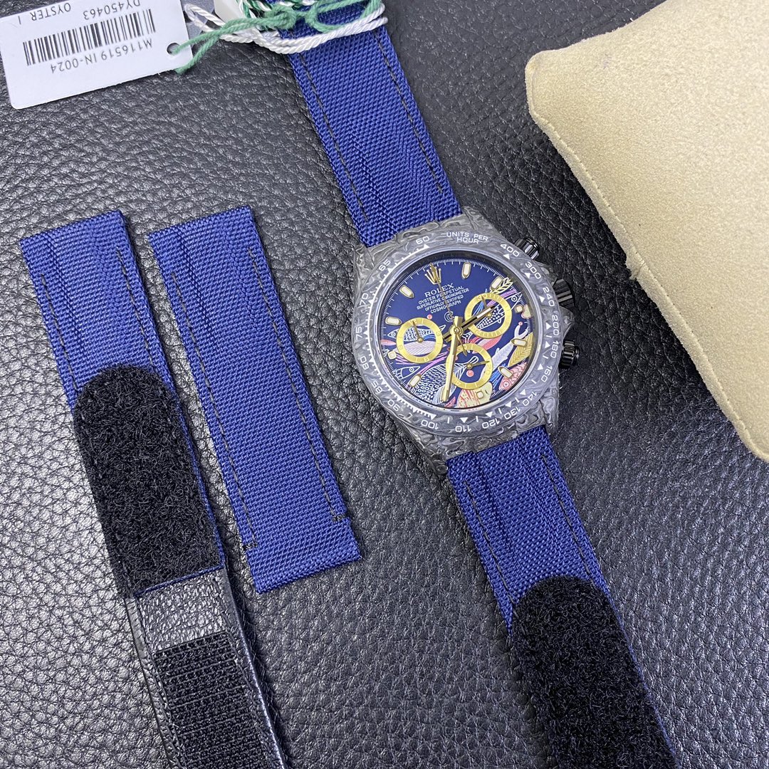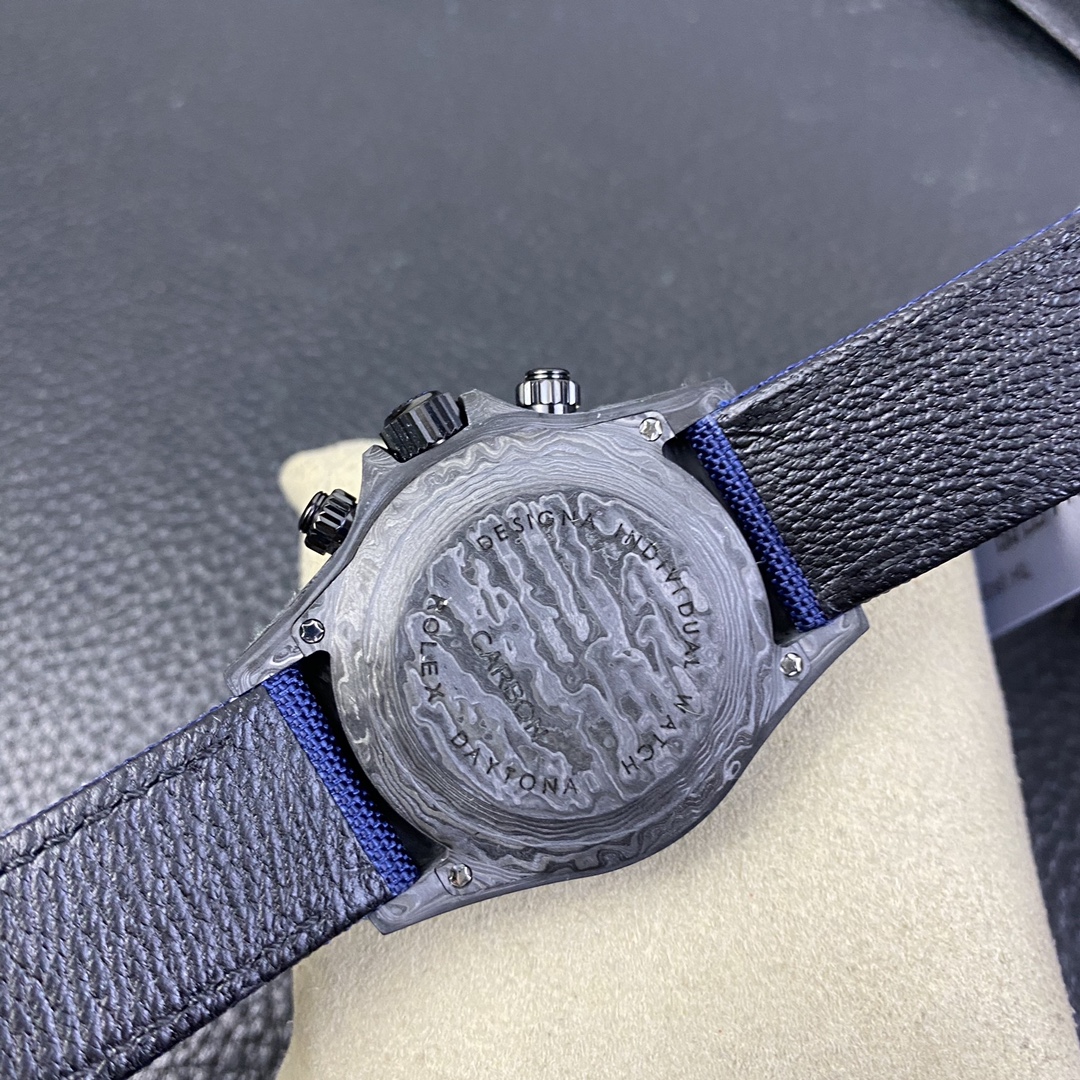 The Rolex Daytona watch exudes a sense of fashion and sportiness with its 40mm x size and sporty style. Equipped with a 7750 automatic movement, it ensures precise and reliable time display. The watch features hour, minute, and second functions, and is equipped with luminescent hands and markers, ensuring clear readability even in low-light environments. With a water resistance of 50 meters, the watch is suitable for waterproof demands in daily life. The sapphire crystal glass provides excellent scratch resistance and clear time display. The carbon fiber case exhibits lightweight and durability, presenting a modern feel. Equipped with a fabric strap, the watch adds a sporty style and a sense of fashion. This Rolex Daytona watch, with its outstanding performance and fashionable design, is an ideal choice for individuals who value quality and a sporty style.