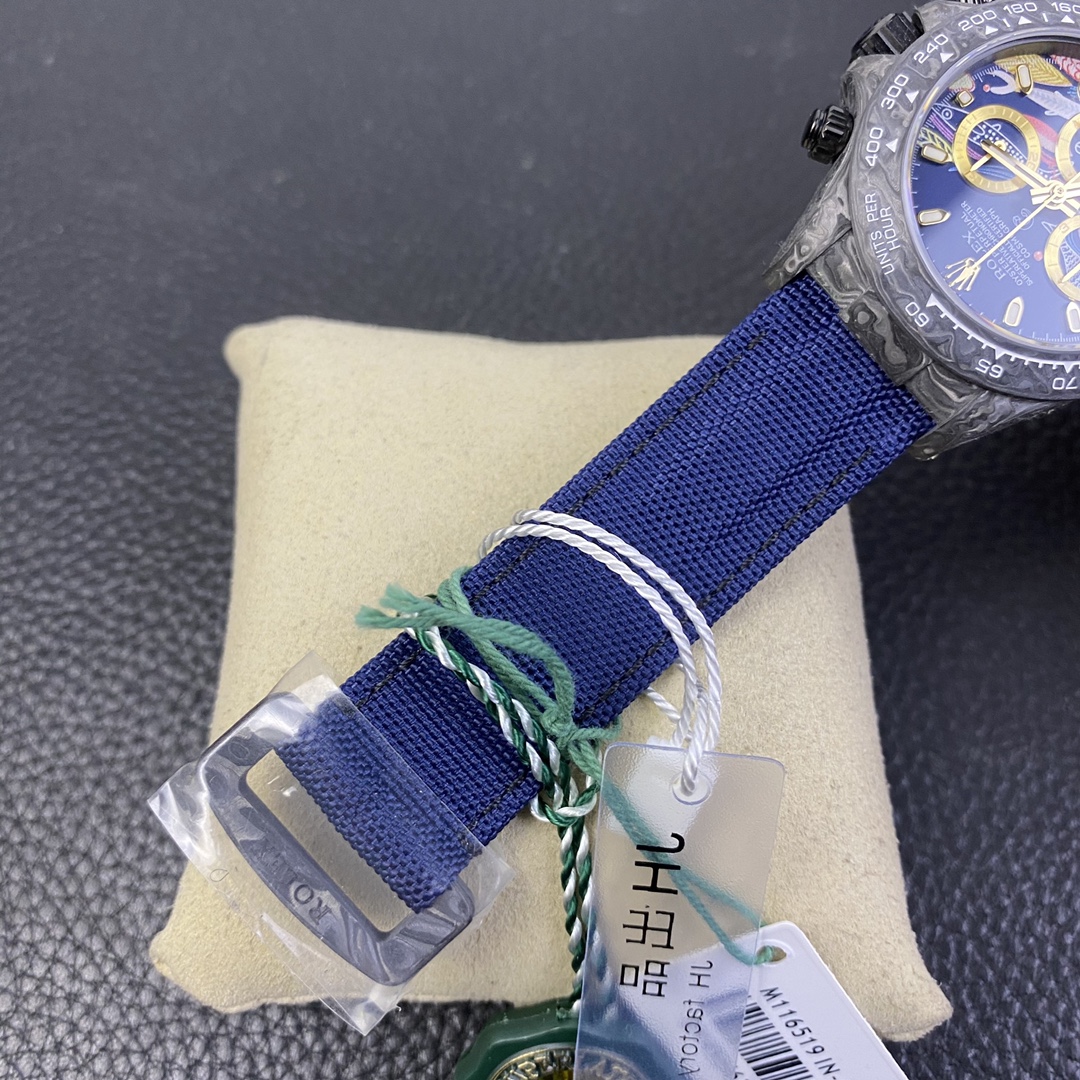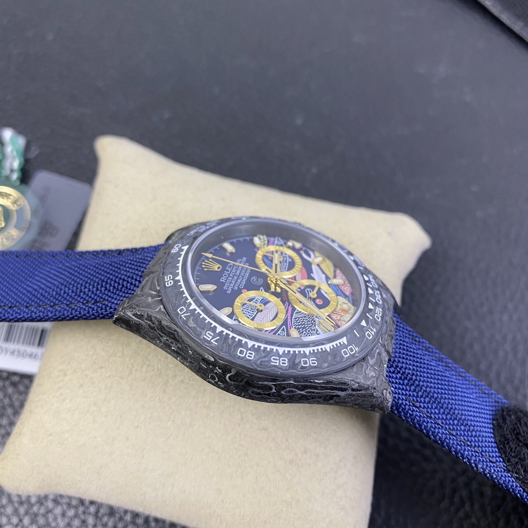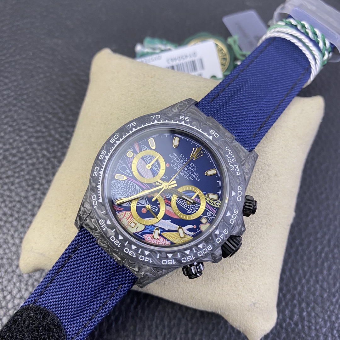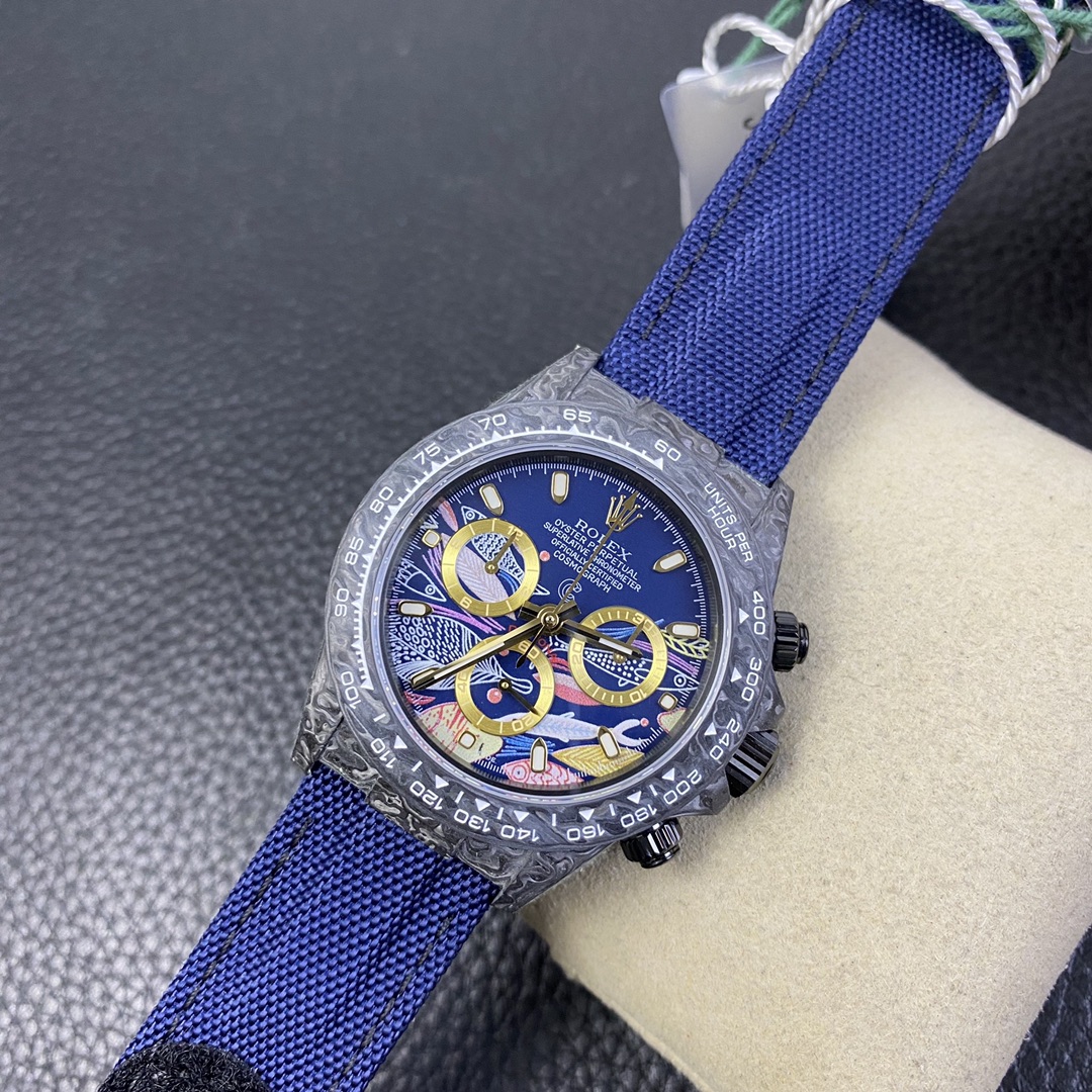 The Rolex Daytona watch exudes a sense of fashion and sportiness with its 40mm x size and sporty style. Equipped with a 7750 automatic movement, it ensures precise and reliable time display. The watch features hour, minute, and second functions, and is equipped with luminescent hands and markers, ensuring clear readability even in low-light environments. With a water resistance of 50 meters, the watch is suitable for waterproof demands in daily life. The sapphire crystal glass provides excellent scratch resistance and clear time display. The carbon fiber case exhibits lightweight and durability, presenting a modern feel. Equipped with a fabric strap, the watch adds a sporty style and a sense of fashion. This Rolex Daytona watch, with its outstanding performance and fashionable design, is an ideal choice for individuals who value quality and a sporty style.