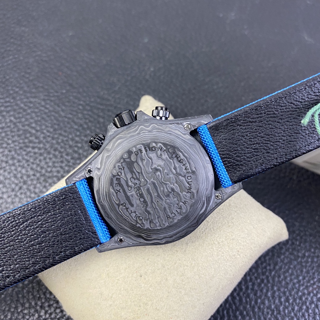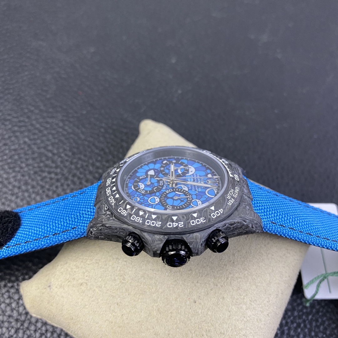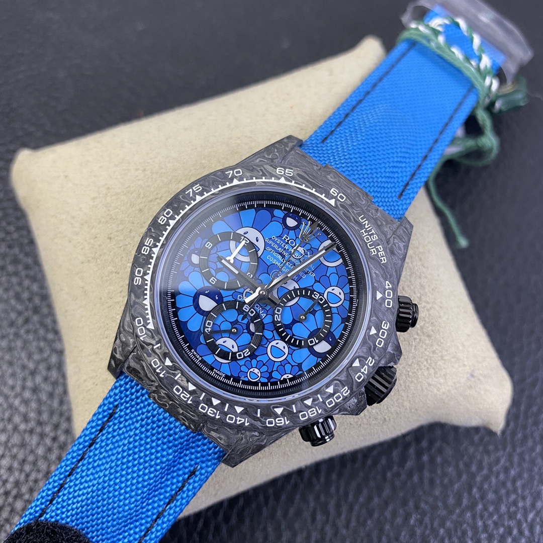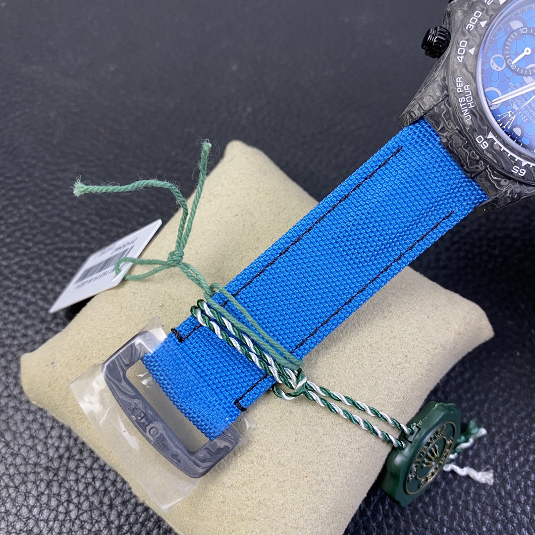 The Rolex Daytona watch exudes a sense of fashion and sportiness with its 40mm x size and sporty style. Equipped with a 7750 automatic movement, it ensures precise and reliable time display. The watch features hour, minute, and second functions, and is equipped with luminescent hands and markers, ensuring clear readability even in low-light environments. With a water resistance of 50 meters, the watch is suitable for waterproof demands in daily life. The sapphire crystal glass provides excellent scratch resistance and clear time display. The carbon fiber case exhibits lightweight and durability, presenting a modern feel. Equipped with a fabric strap, the watch adds a sporty style and a sense of fashion. This Rolex Daytona watch, with its outstanding performance and fashionable design, is an ideal choice for individuals who value quality and a sporty style.