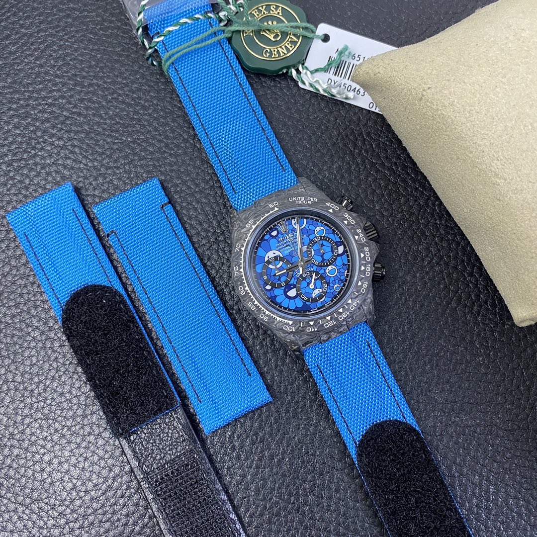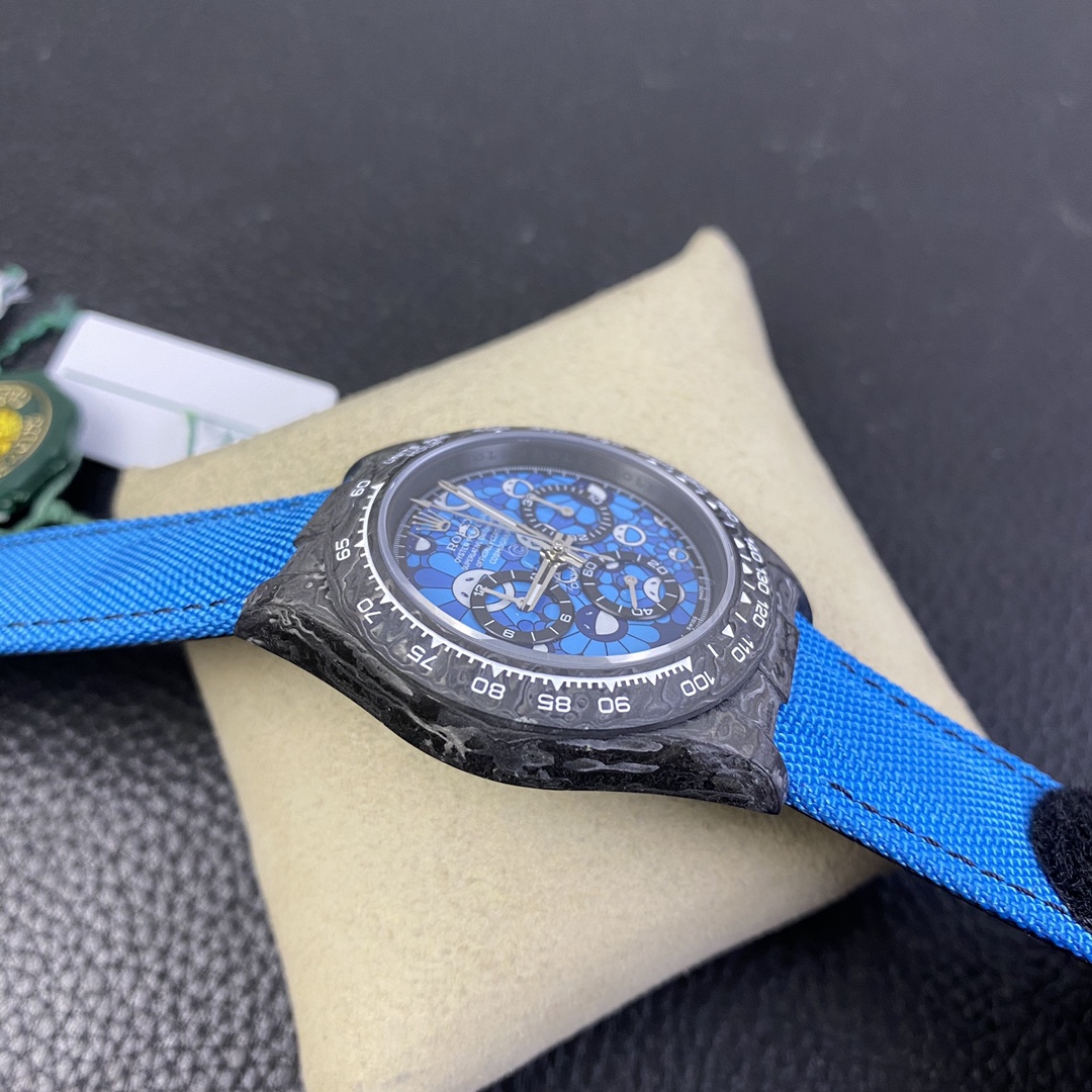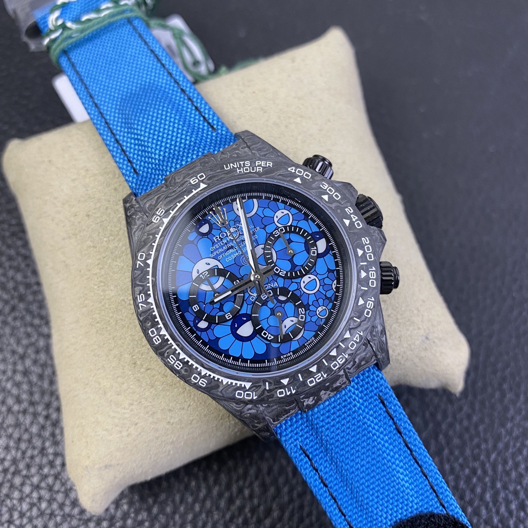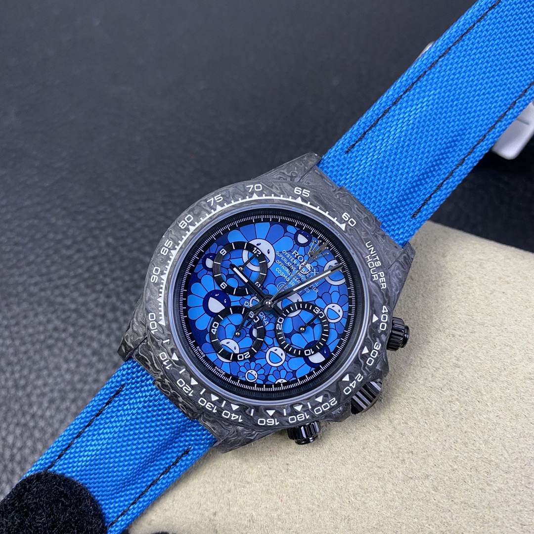 The Rolex Daytona watch exudes a sense of fashion and sportiness with its 40mm x size and sporty style. Equipped with a 7750 automatic movement, it ensures precise and reliable time display. The watch features hour, minute, and second functions, and is equipped with luminescent hands and markers, ensuring clear readability even in low-light environments. With a water resistance of 50 meters, the watch is suitable for waterproof demands in daily life. The sapphire crystal glass provides excellent scratch resistance and clear time display. The carbon fiber case exhibits lightweight and durability, presenting a modern feel. Equipped with a fabric strap, the watch adds a sporty style and a sense of fashion. This Rolex Daytona watch, with its outstanding performance and fashionable design, is an ideal choice for individuals who value quality and a sporty style.