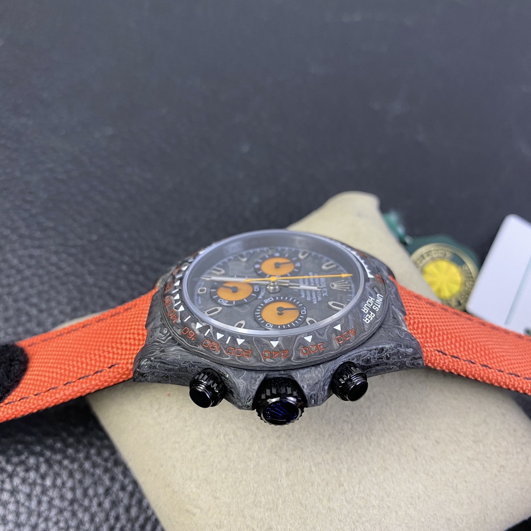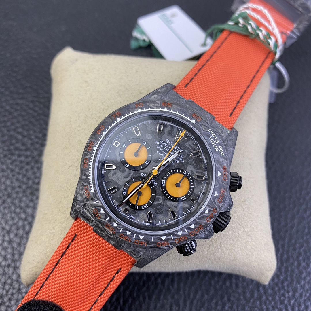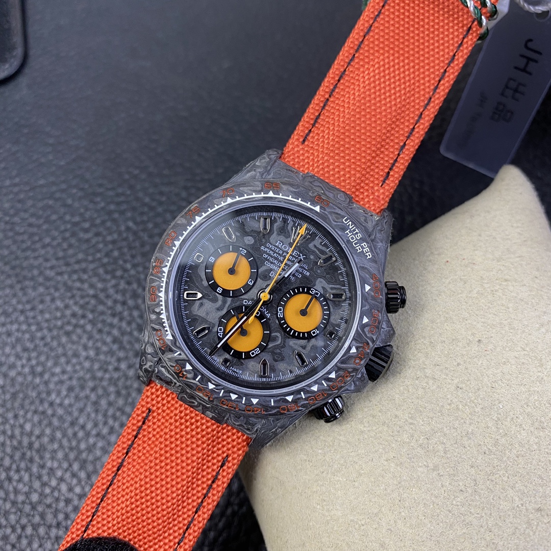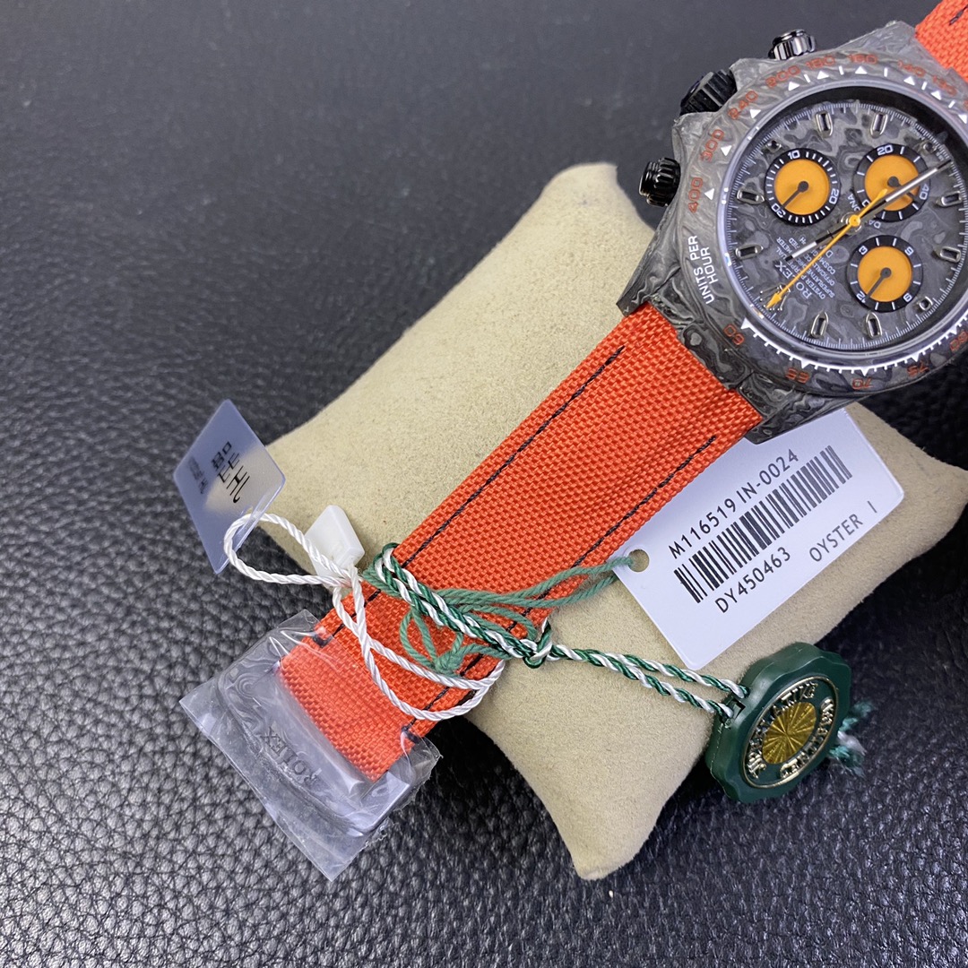 The Rolex Daytona watch exudes a sense of fashion and sportiness with its 40mm x size and sporty style. Equipped with a 7750 automatic movement, it ensures precise and reliable time display. The watch features hour, minute, and second functions, and is equipped with luminescent hands and markers, ensuring clear readability even in low-light environments. With a water resistance of 50 meters, the watch is suitable for waterproof demands in daily life. The sapphire crystal glass provides excellent scratch resistance and clear time display. The carbon fiber case exhibits lightweight and durability, presenting a modern feel. Equipped with a fabric strap, the watch adds a sporty style and a sense of fashion. This Rolex Daytona watch, with its outstanding performance and fashionable design, is an ideal choice for individuals who value quality and a sporty style.