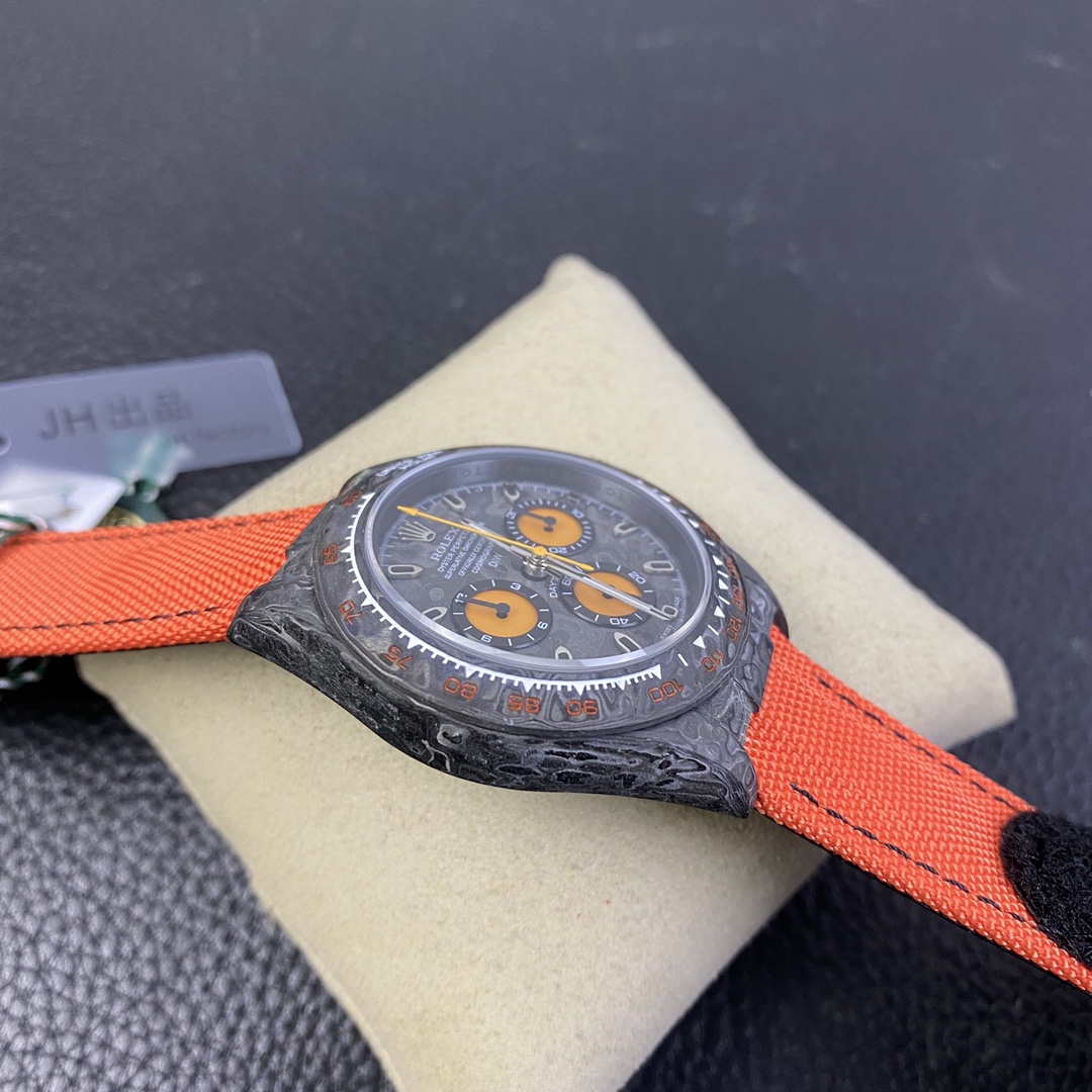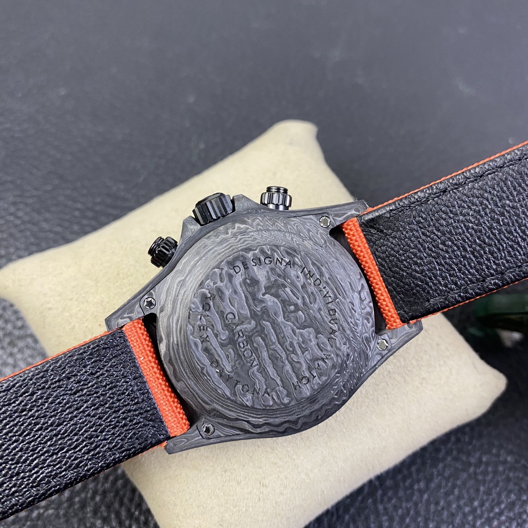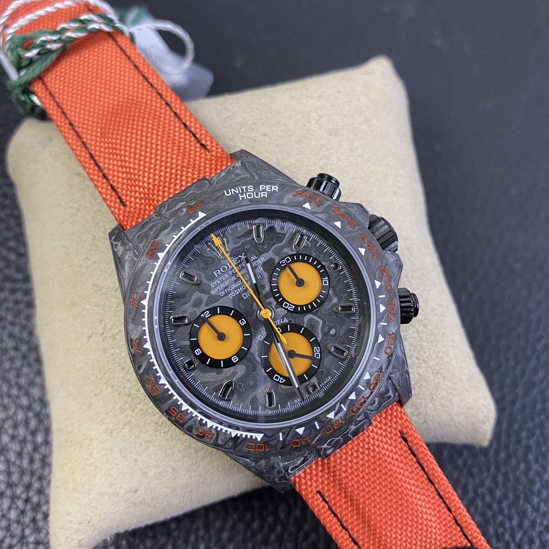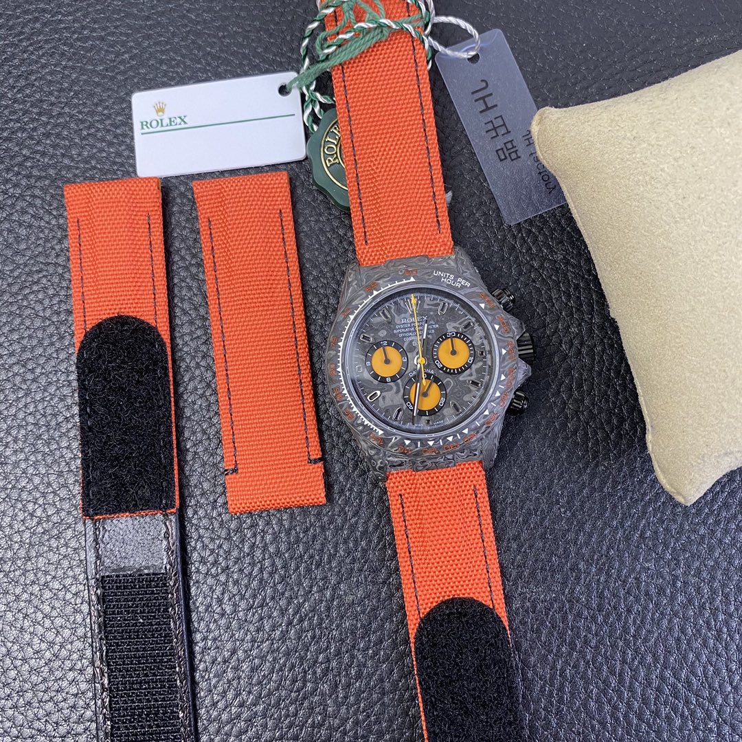 The Rolex Daytona watch exudes a sense of fashion and sportiness with its 40mm x size and sporty style. Equipped with a 7750 automatic movement, it ensures precise and reliable time display. The watch features hour, minute, and second functions, and is equipped with luminescent hands and markers, ensuring clear readability even in low-light environments. With a water resistance of 50 meters, the watch is suitable for waterproof demands in daily life. The sapphire crystal glass provides excellent scratch resistance and clear time display. The carbon fiber case exhibits lightweight and durability, presenting a modern feel. Equipped with a fabric strap, the watch adds a sporty style and a sense of fashion. This Rolex Daytona watch, with its outstanding performance and fashionable design, is an ideal choice for individuals who value quality and a sporty style.