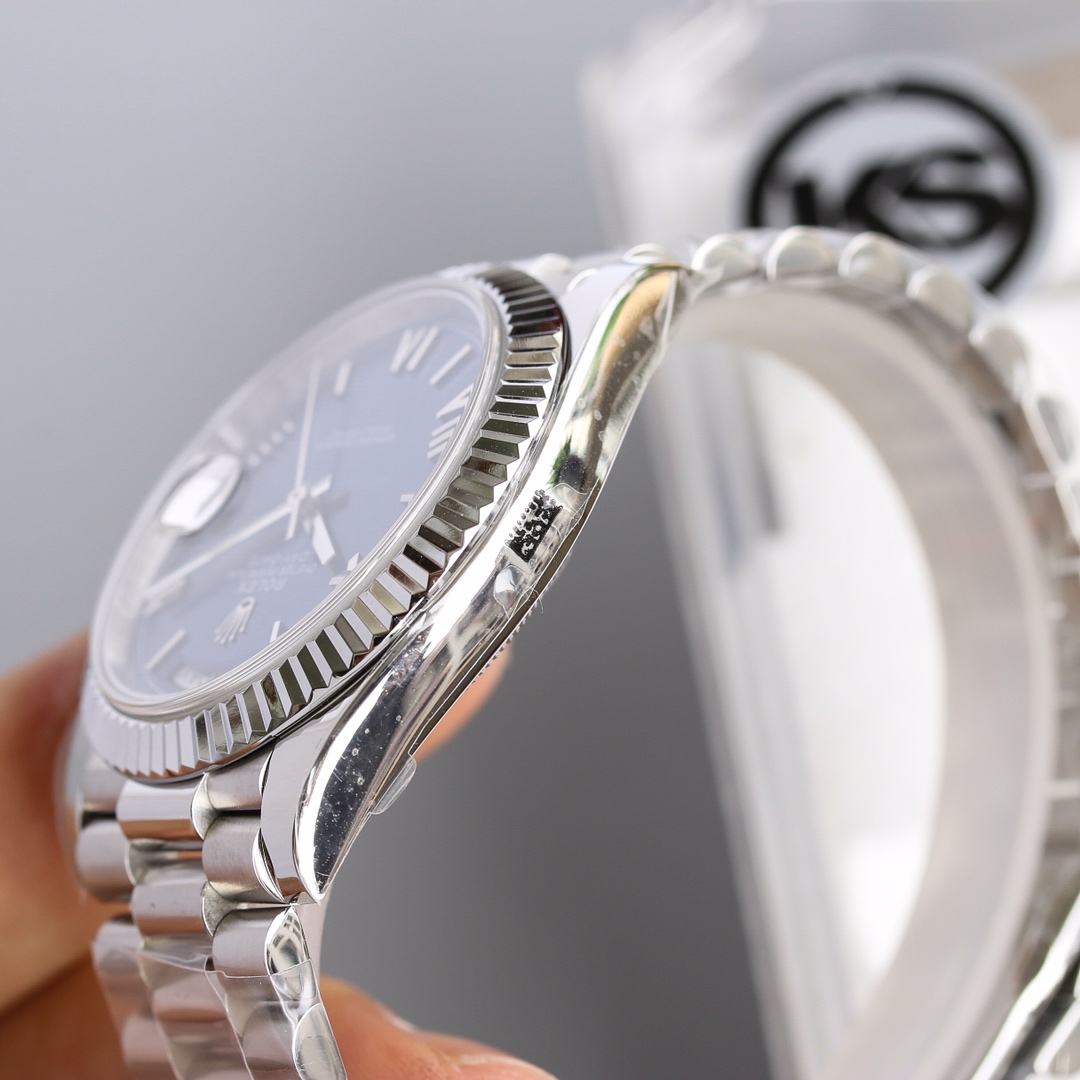 This Rolex Datejust series watch showcases a combination of classic 41mm size and minimalist design, exuding a sense of fashion and power. It is equipped with a 2836 automatic mechanical movement to ensure precise and reliable time display. The watch features hour, minute, second, and calendar functions to meet your daily timekeeping needs. With a 50-meter waterproof performance, it is suitable for everyday waterproof requirements. The scratch-resistant blue crystal glass protects the dial and provides a clear view. The folding clasp design makes it convenient to wear and adjust the length of the strap, enhancing wearing comfort. This Rolex Datejust series watch combines classic aesthetics with practicality, making it an ideal choice for fashion enthusiasts.