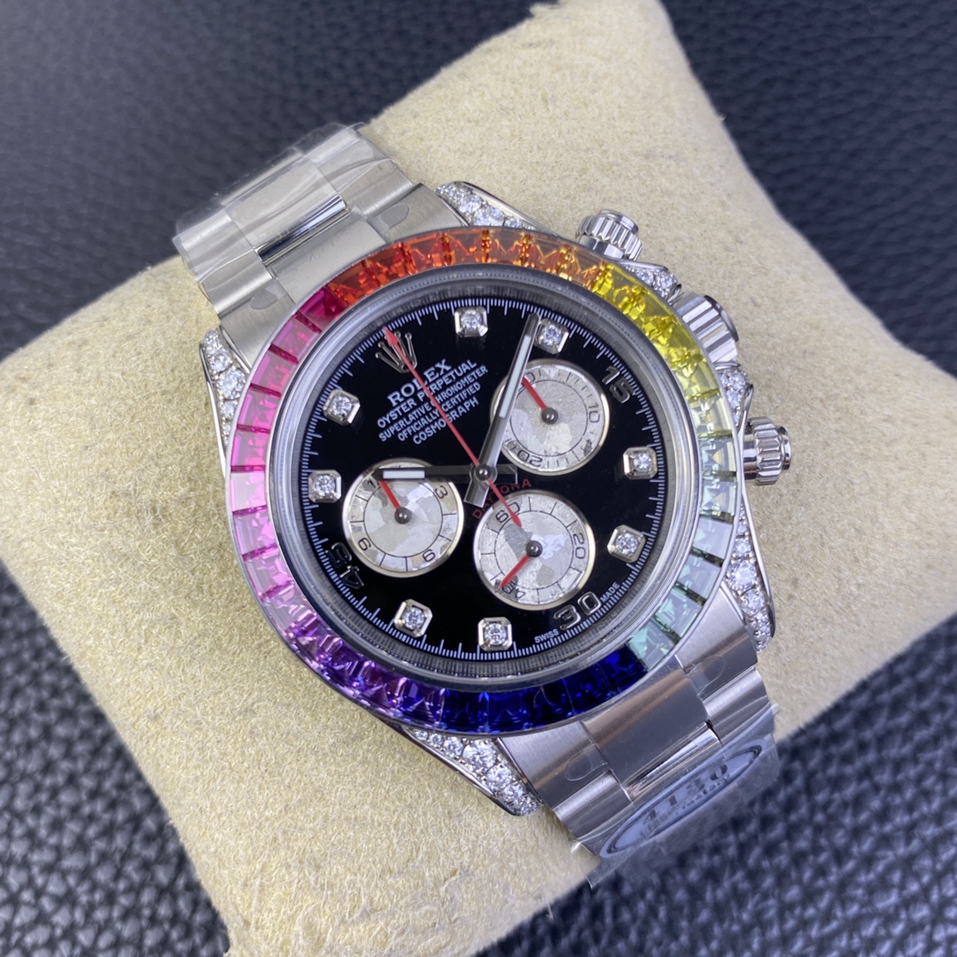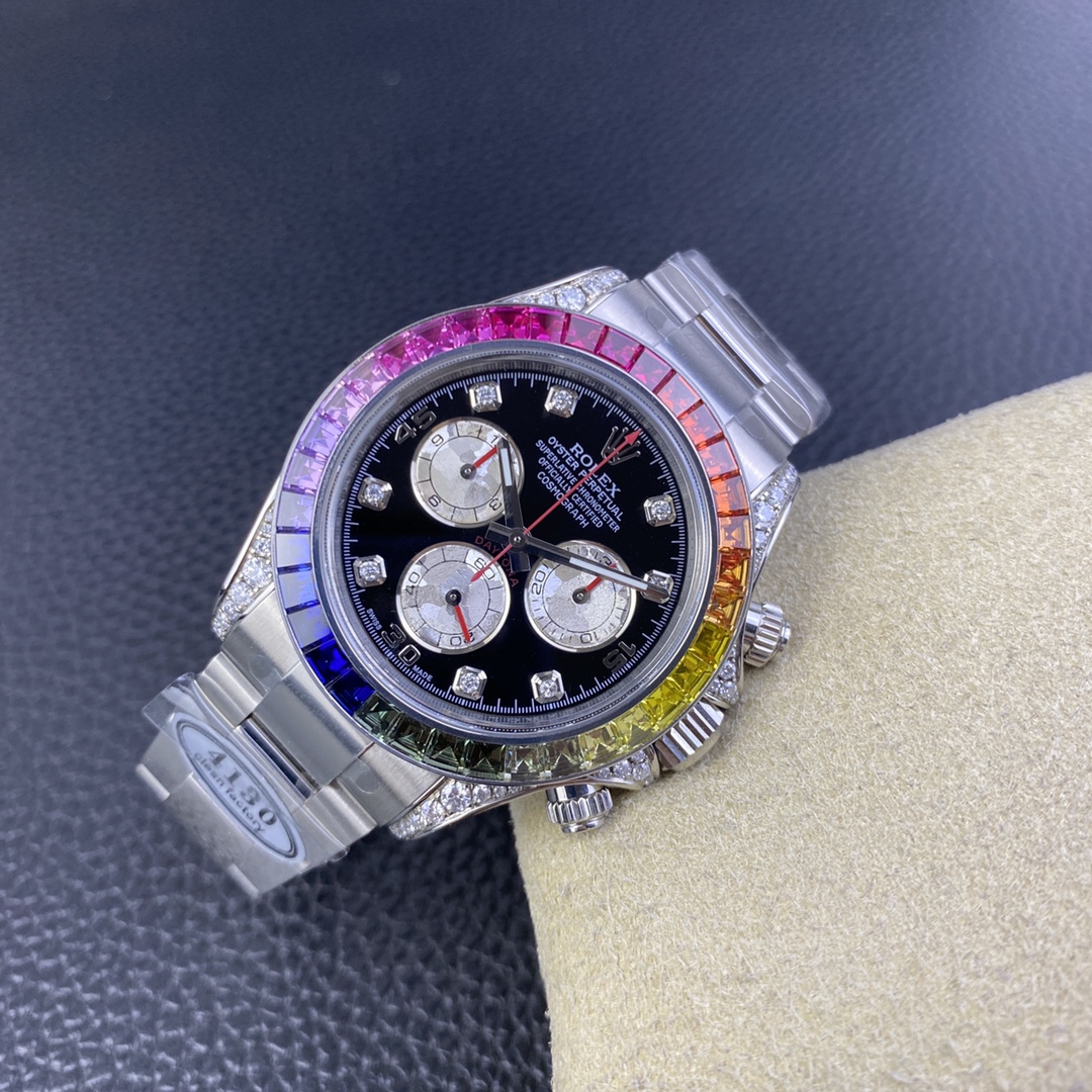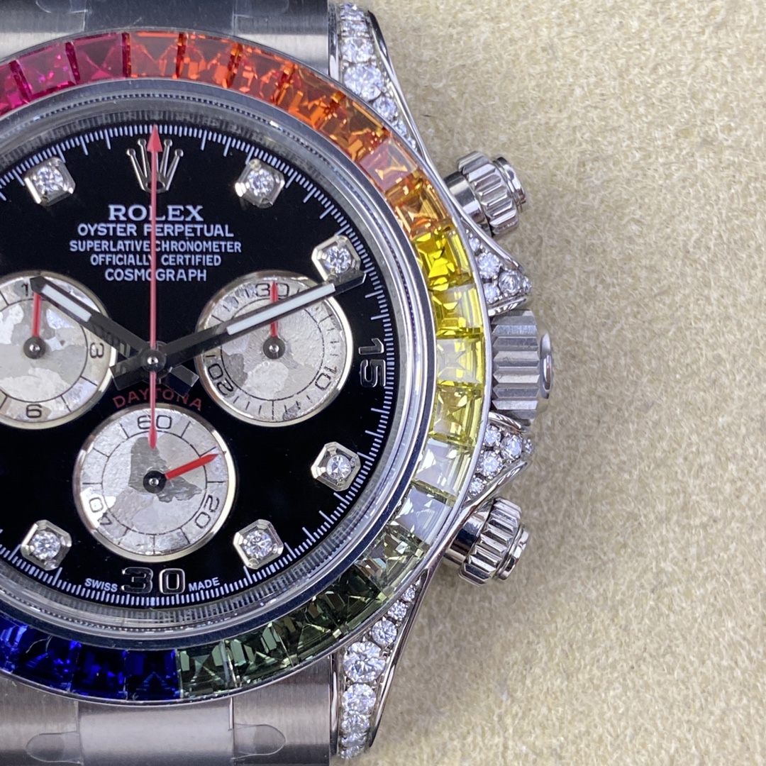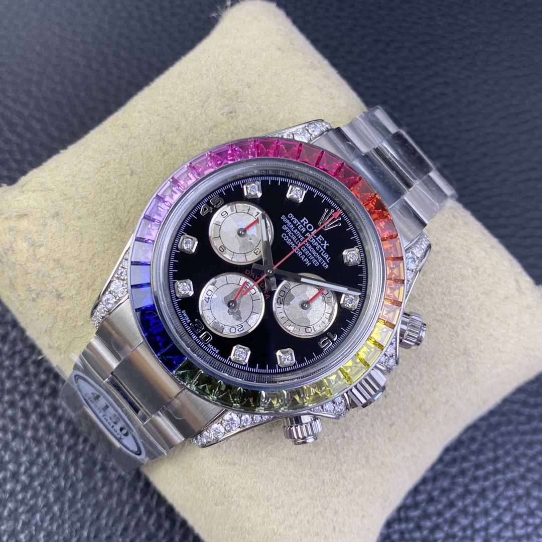The Rolex Rainbow Daytona Series 116599RBOW Steel Bracelet watch is a masterpiece of exquisite craftsmanship and stunning design, making it a coveted item for watch enthusiasts. Whether it’s the unique rainbow-colored gemstone chronograph dials, the mesmerizing reflection and vibrant colors, the precise and reliable movement, or the durable materials, this watch showcases the extraordinary charm of Rolex as a top luxury watch brand.