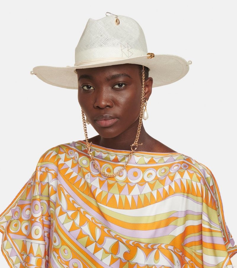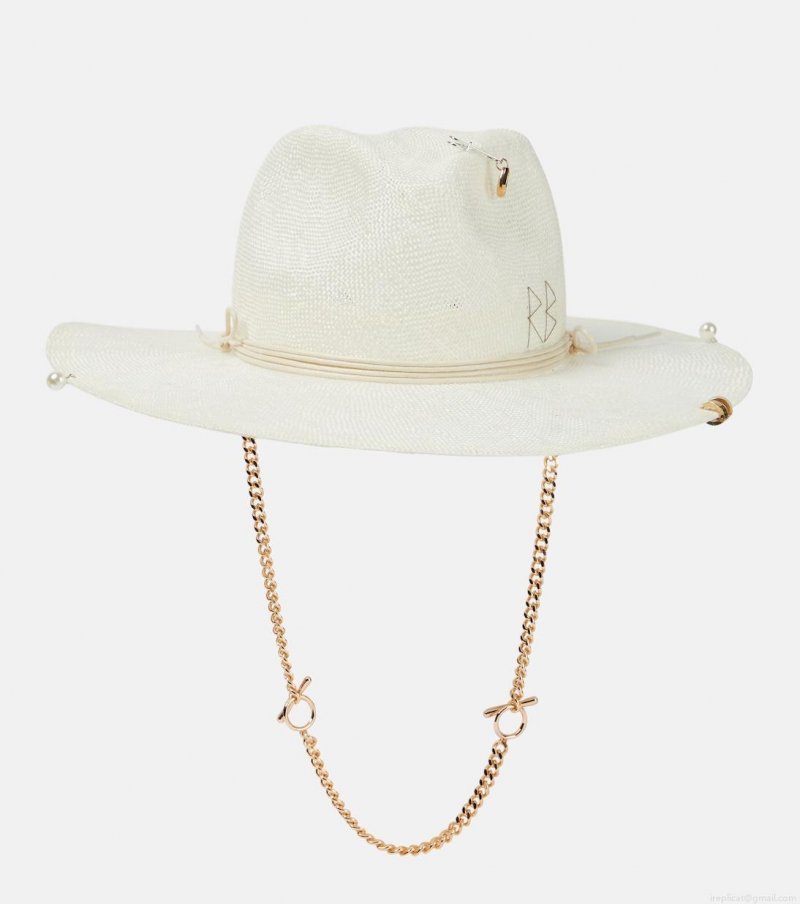 Ruslan Baginskiy puts a glamorous spin on its fedora styles, adorning this woven straw design with tiny pearl and gold-tone rings. It's embroidered with the designer's initials and finished with a chain strap.