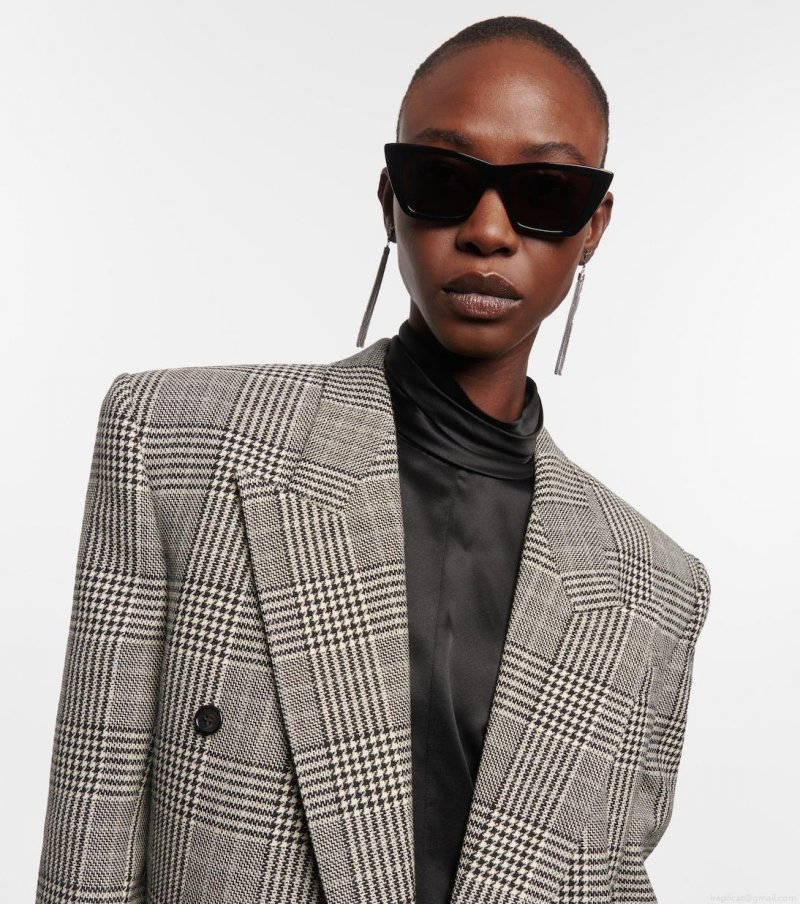 Saint Laurent's SL 276 Mica sunglasses fuse retro glamour with modern attitude. Crafted in Italy from sleek black acetate, the rectangular cat-eye design features 100% UV protected gray lenses and is finished with silver-tone branding engraved at the temple. Coordinate the structured style with tailored suits and fluid dresses alike.