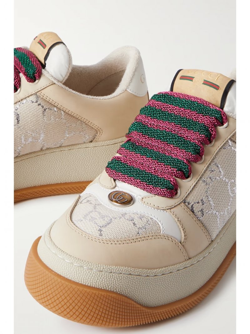 - Beige rubber, beige and white leather (Calf), beige and silver canvas-jacquard