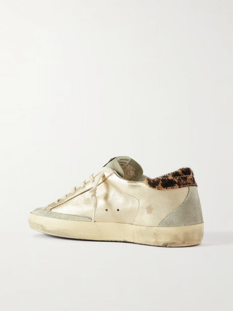 - Gold and platinum leather (Cow), leopard-print calf hair, light-gray suede