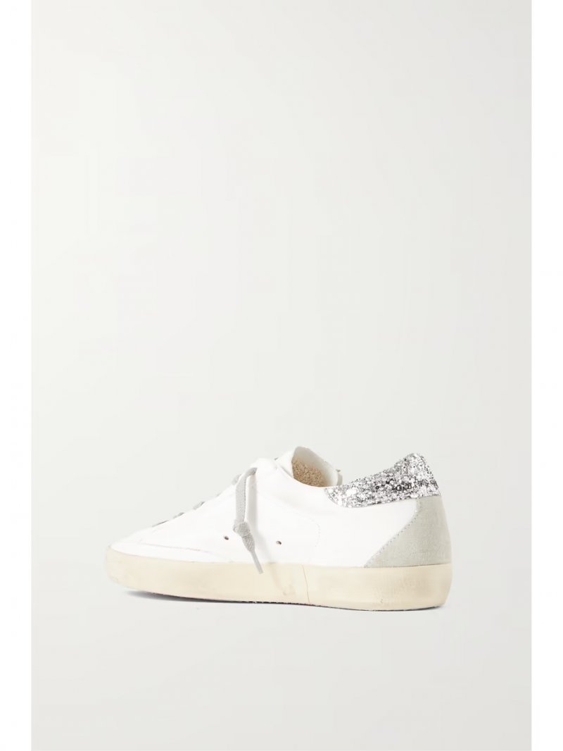 - White leather, silver glittered leather (Calf), blue denim, gray suede