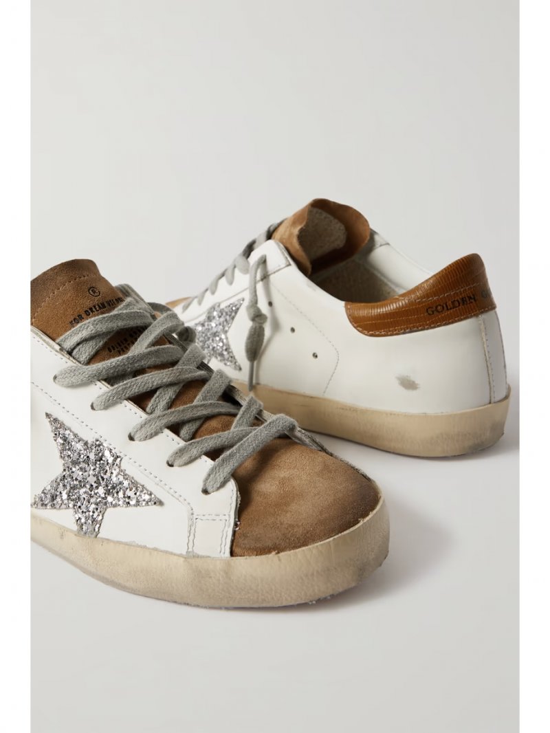 - White smooth leather, tan snake-effect leather, light-brown suede