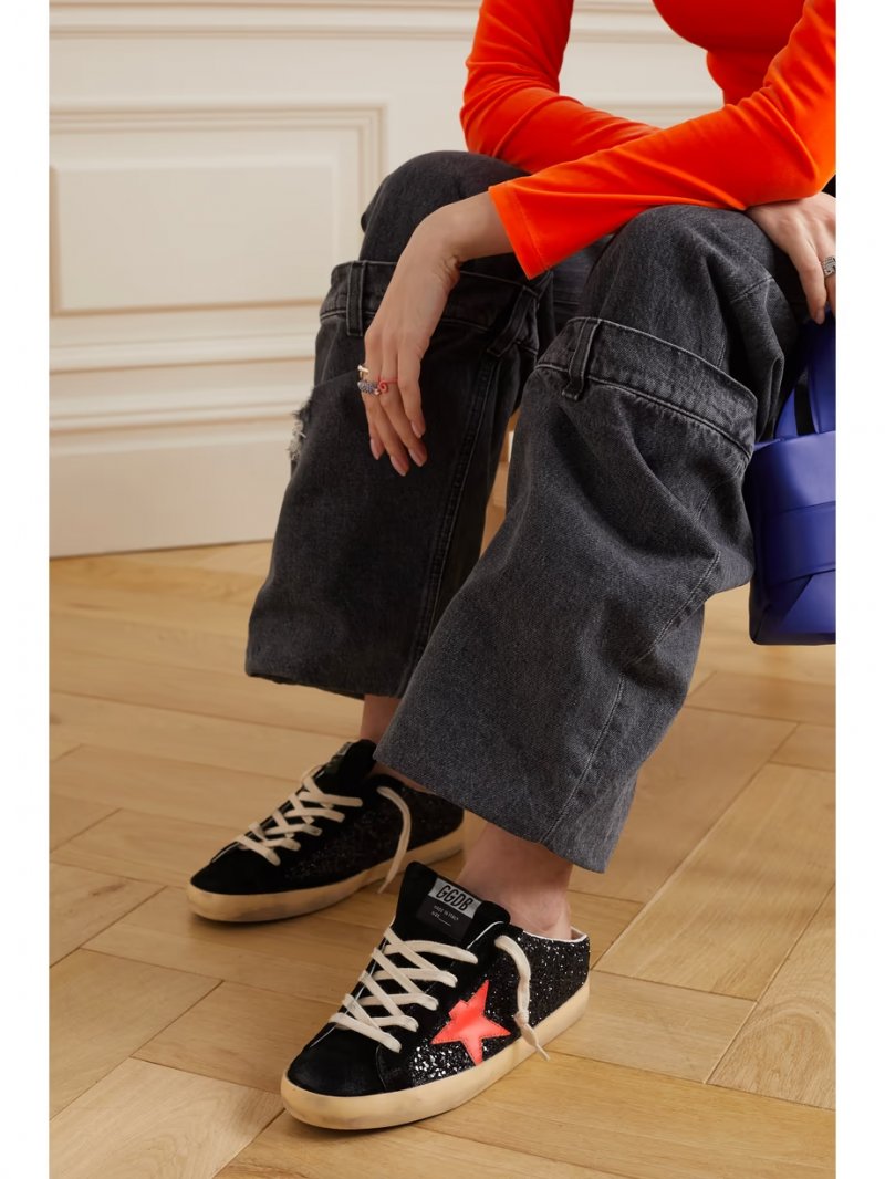 - Black glittered leather, black suede and coral leather (Cow)