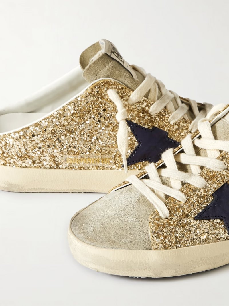 - Beige suede, gold glittered leather, navy leather