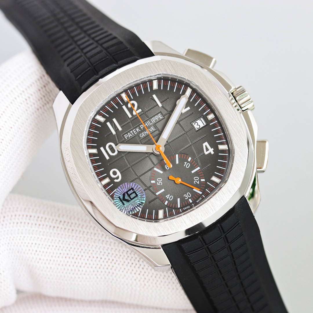 The Patek Philippe Aquanaut series 5968A-001 watch features a 42.2mm stainless steel case with a classic octagonal bezel and rounded edges. The chronograph hands and quarter-second outer track scale provide precise timing.