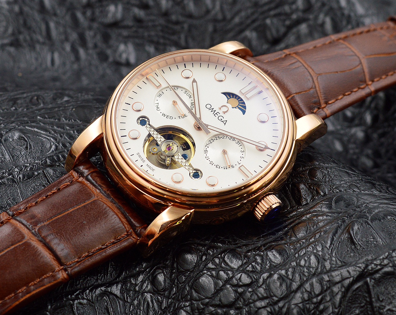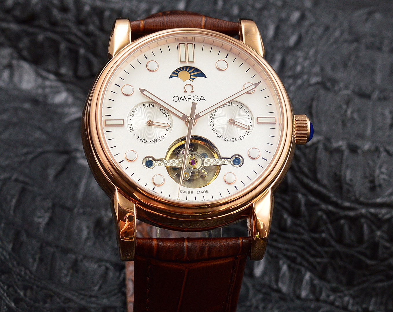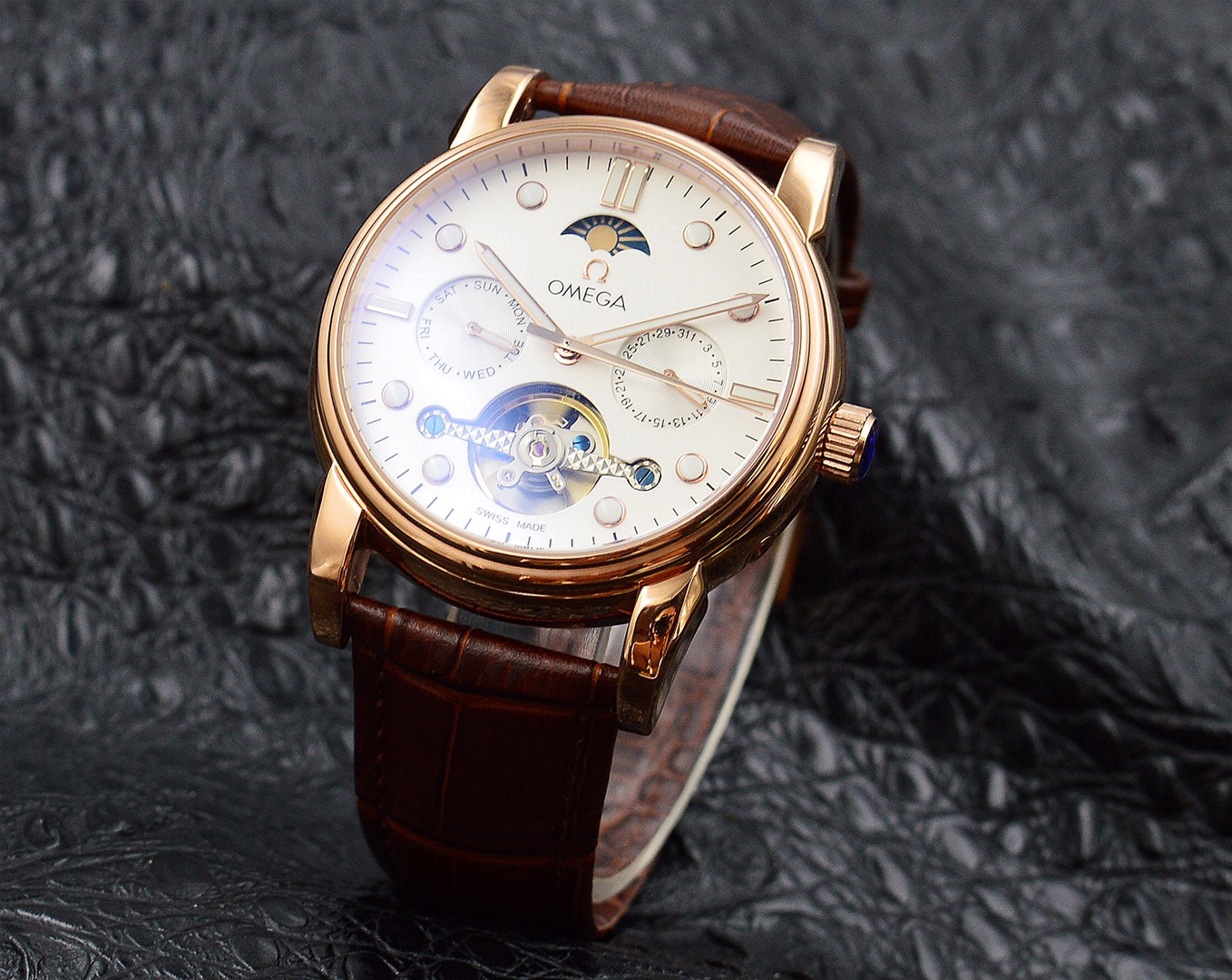 Strap: The watch is paired with a leather strap, offering both comfort and style, adding an elegant touch to the overall look.