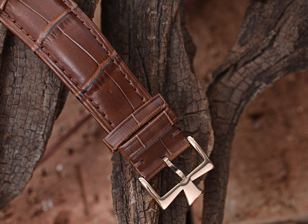 Strap: The watch is paired with a leather strap, offering both comfort and style, adding an elegant touch to the overall look.