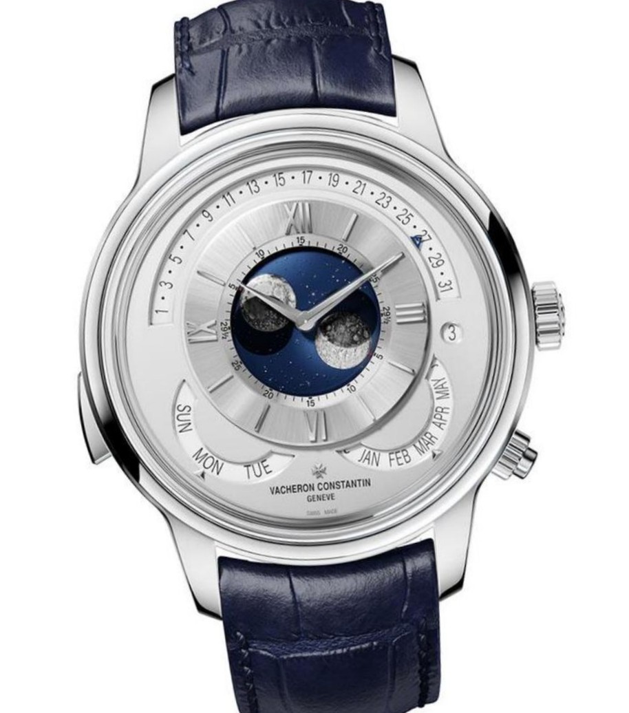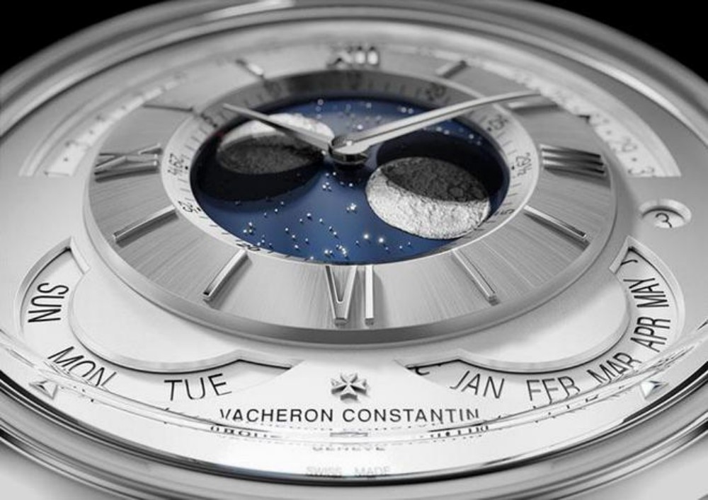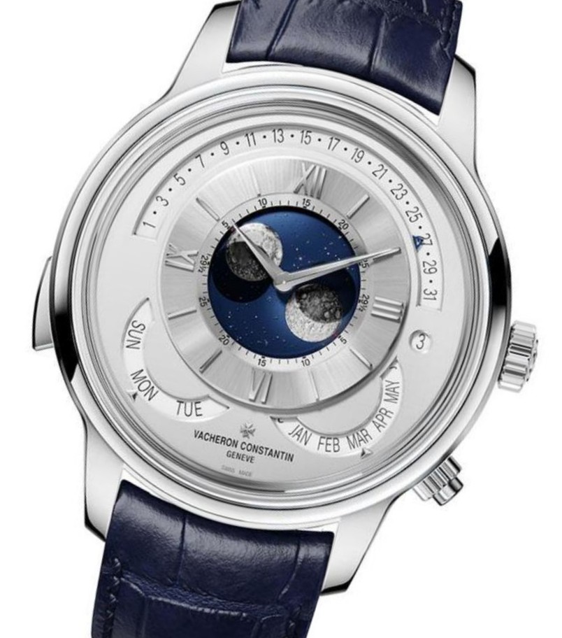 Dial: The double moon phase display becomes the focal point, with three-dimensional hemispheres representing the southern and northern hemispheres positioned on a disc that is coaxial with the central hands, resembling the vast blue sky, contrasting sharply with the silver tone of the dial.