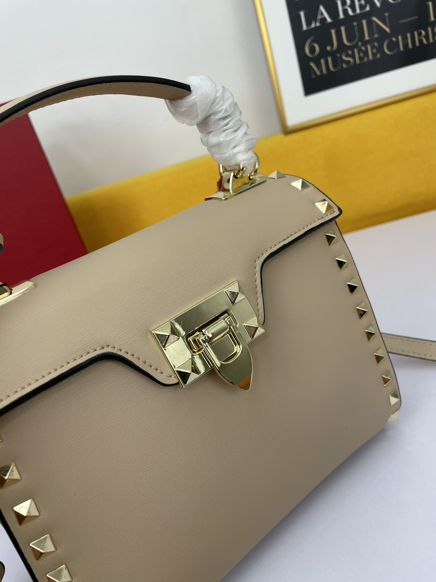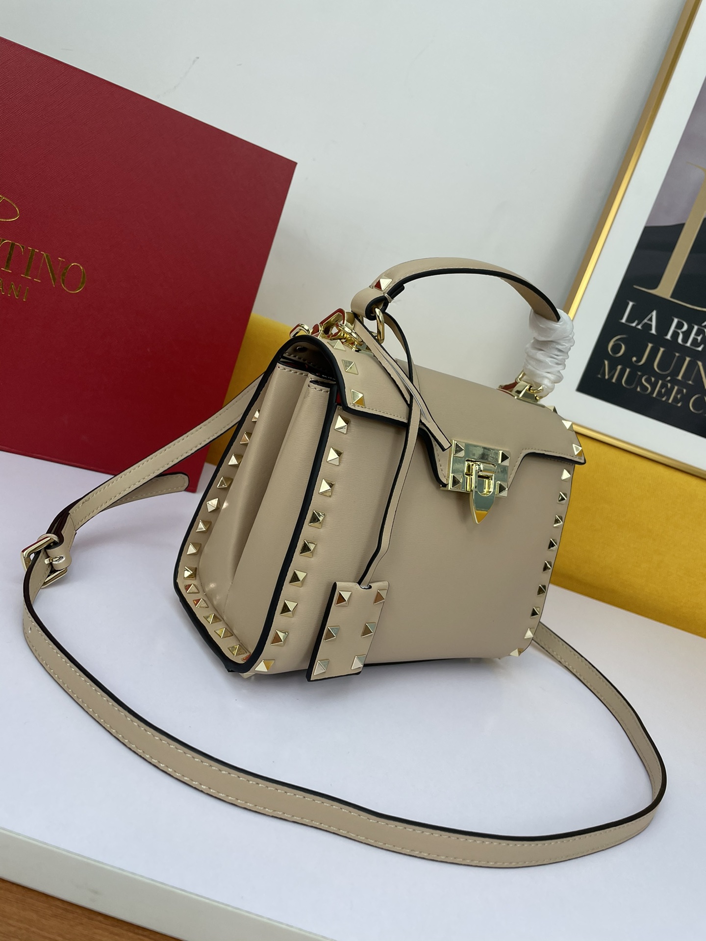 Valentino Garavani Rockstud Alcove Grainy Calfskin Handbag with Decorative Leather Pendant:
