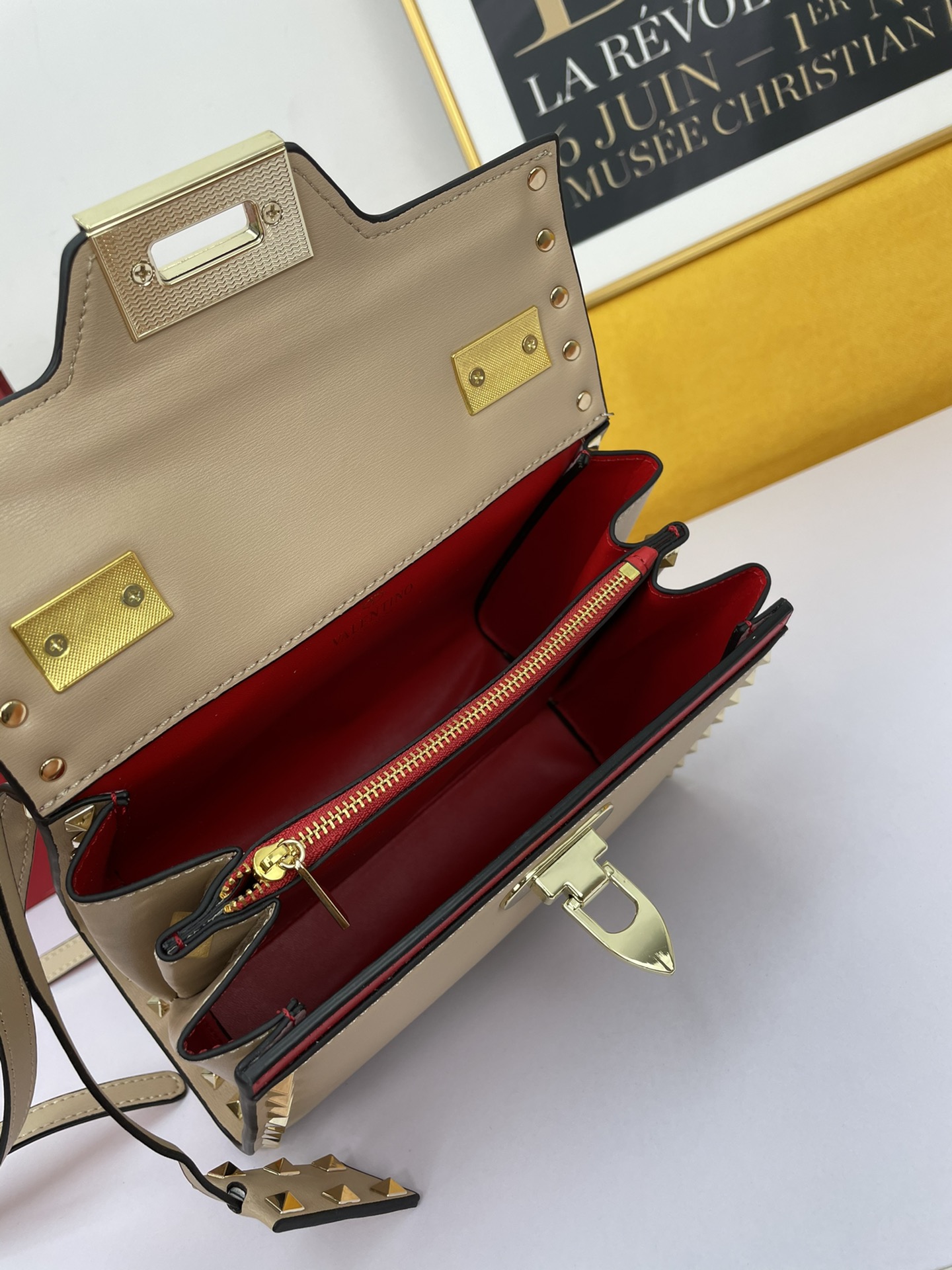 Red lambskin leather lining, interior: compartmentalized design with a zipper pocket and a flat pocket