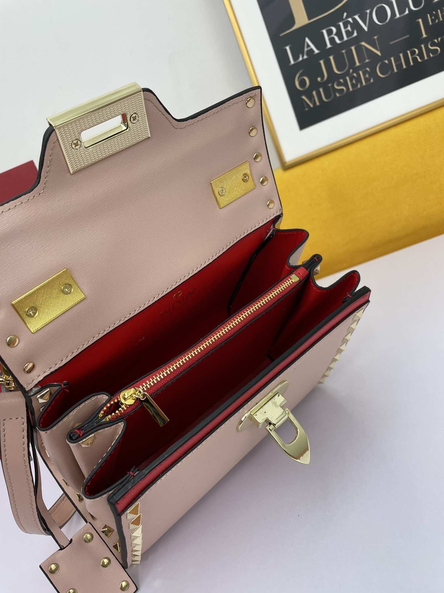 Red lambskin leather lining, interior: compartmentalized design with a zipper pocket and a flat pocket