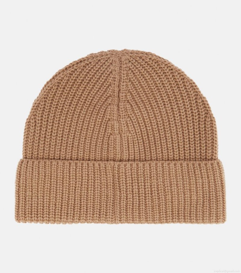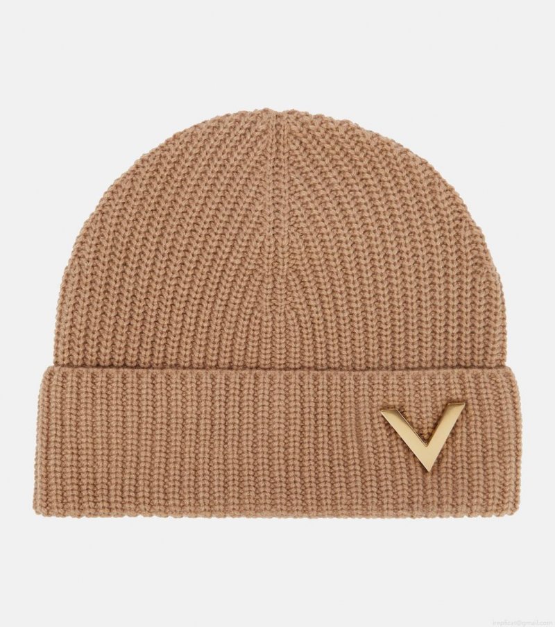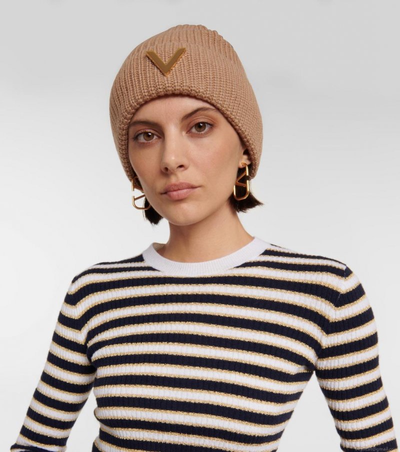 Made from pure cashmere yarns in beige, this rib-knit beanie from Valentino features a gold-toned V hardware on the brim.